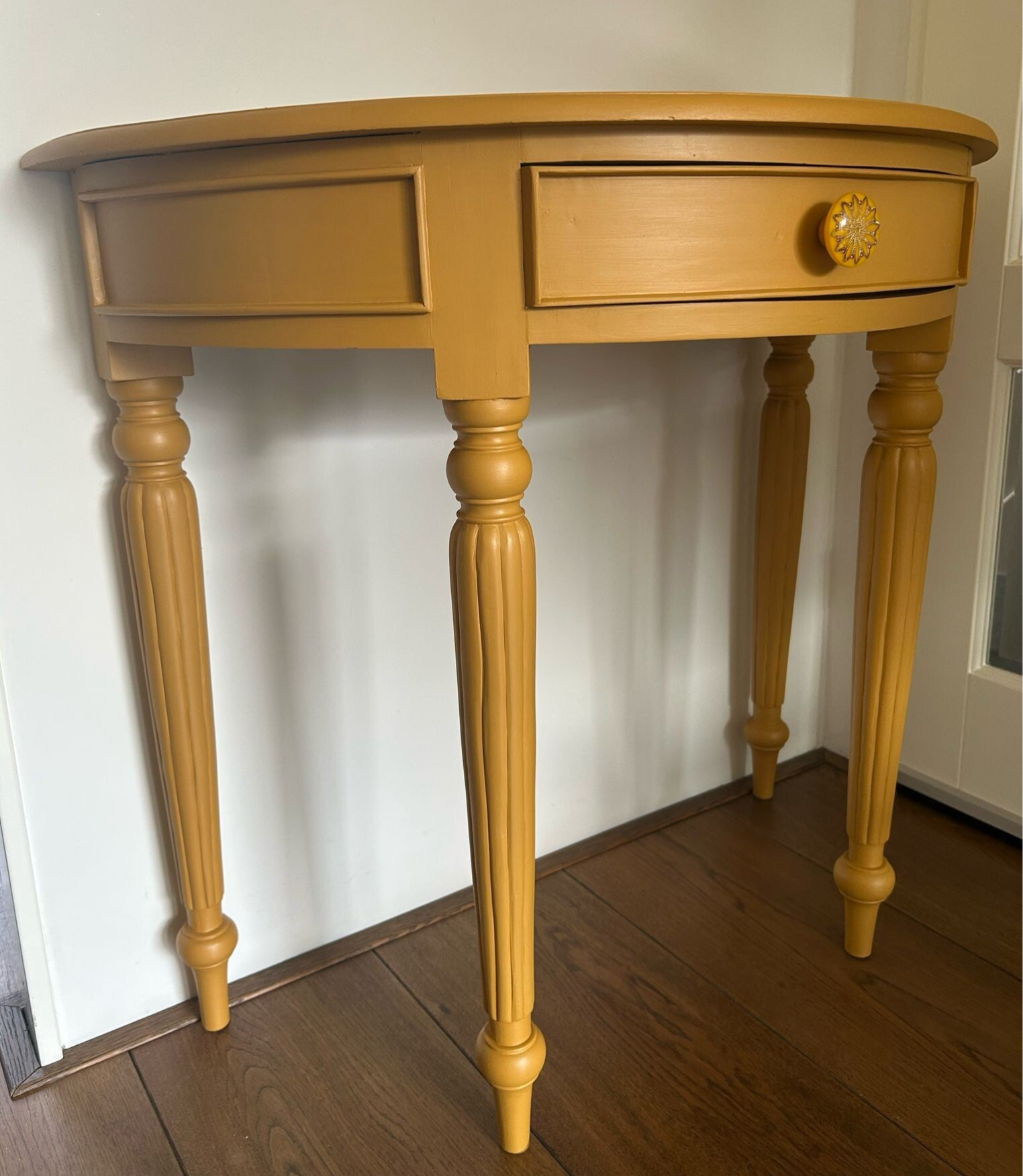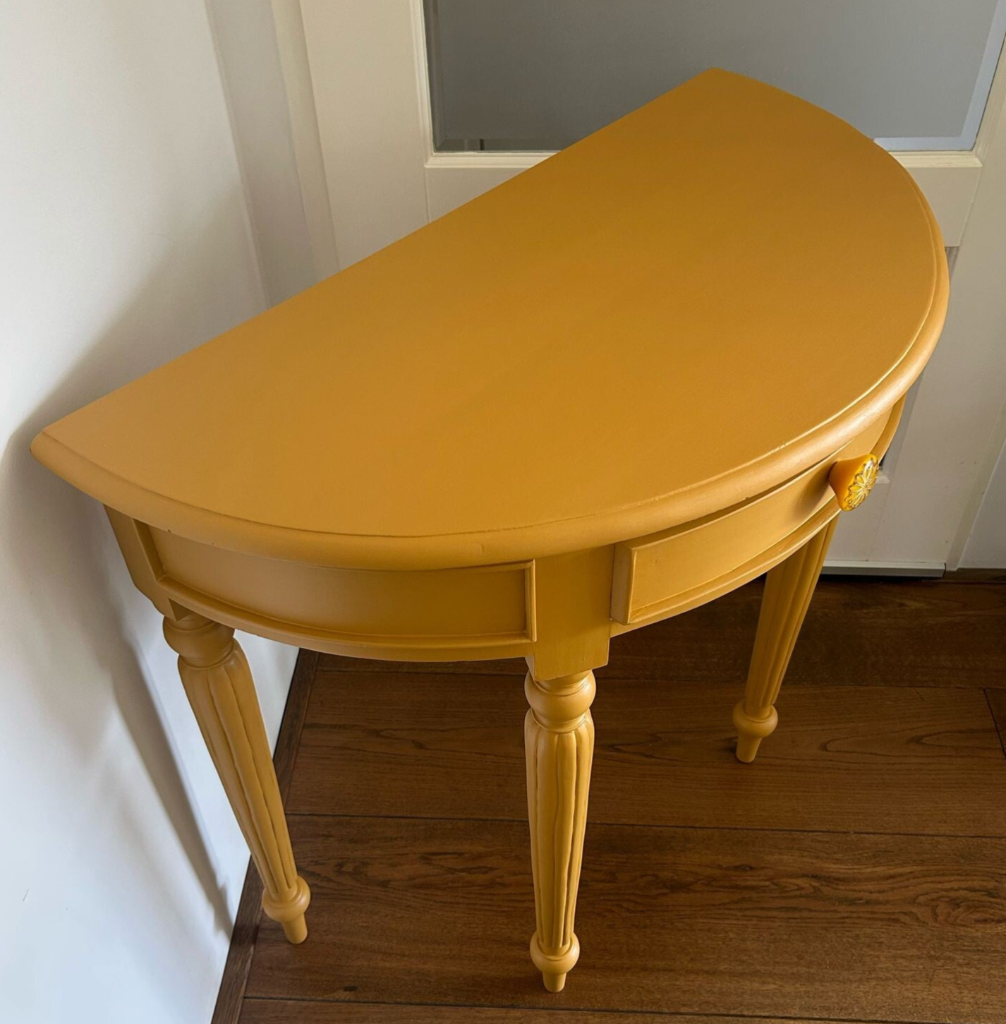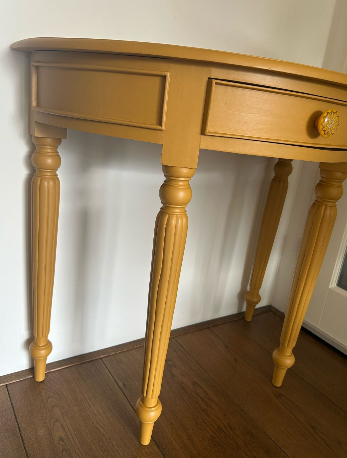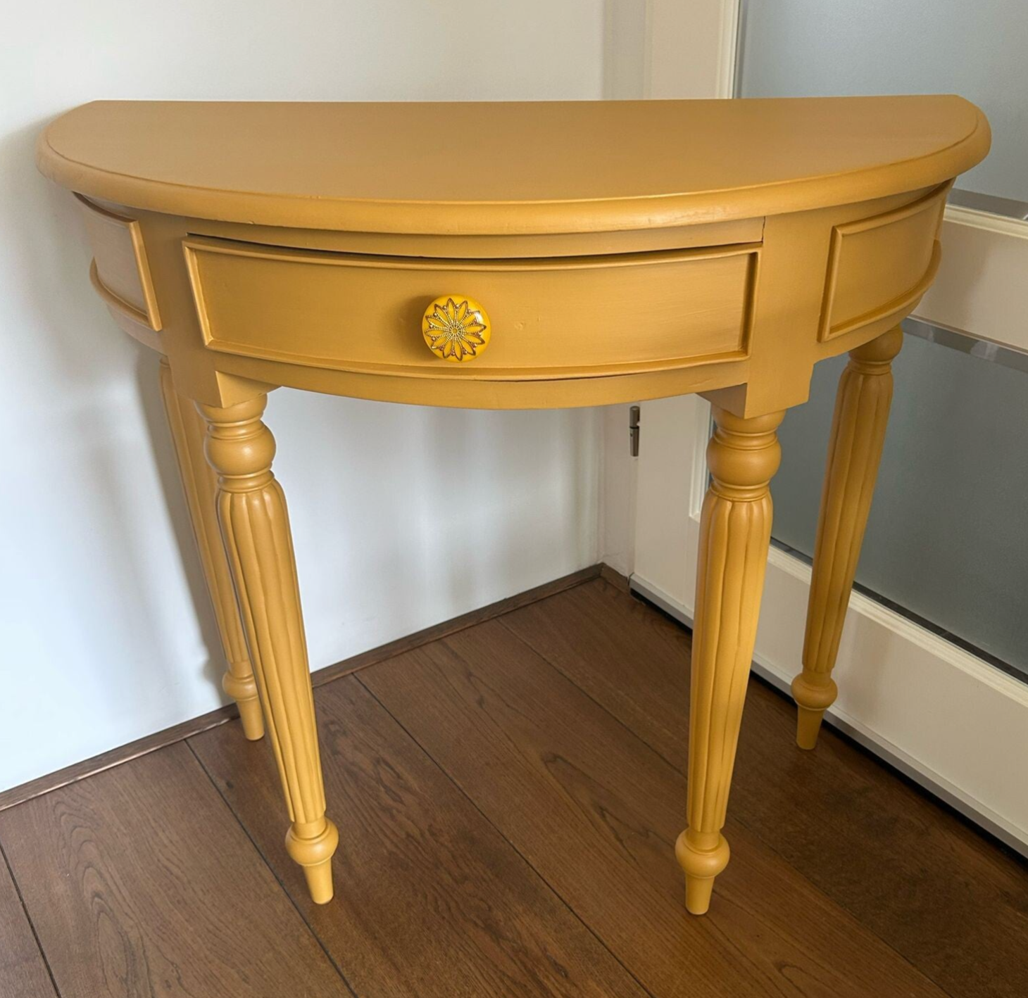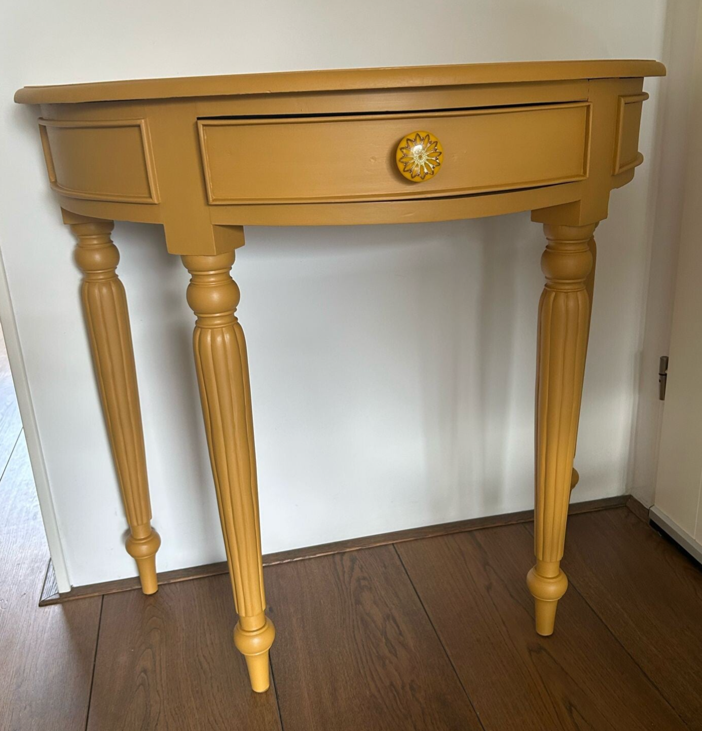 Wat een leukerd deze sidetable met zijn half ronde vorm. Bescheiden qua afmetingen dus al snel plek voor. En wat dacht je van de kleur..... Wauw toch, de mooie gele Mustard tint van Fusion Mineral Paint. Al met al een lust voor het oog met het subtiele houtsnijwerk en die te gekke knop op het laatje !