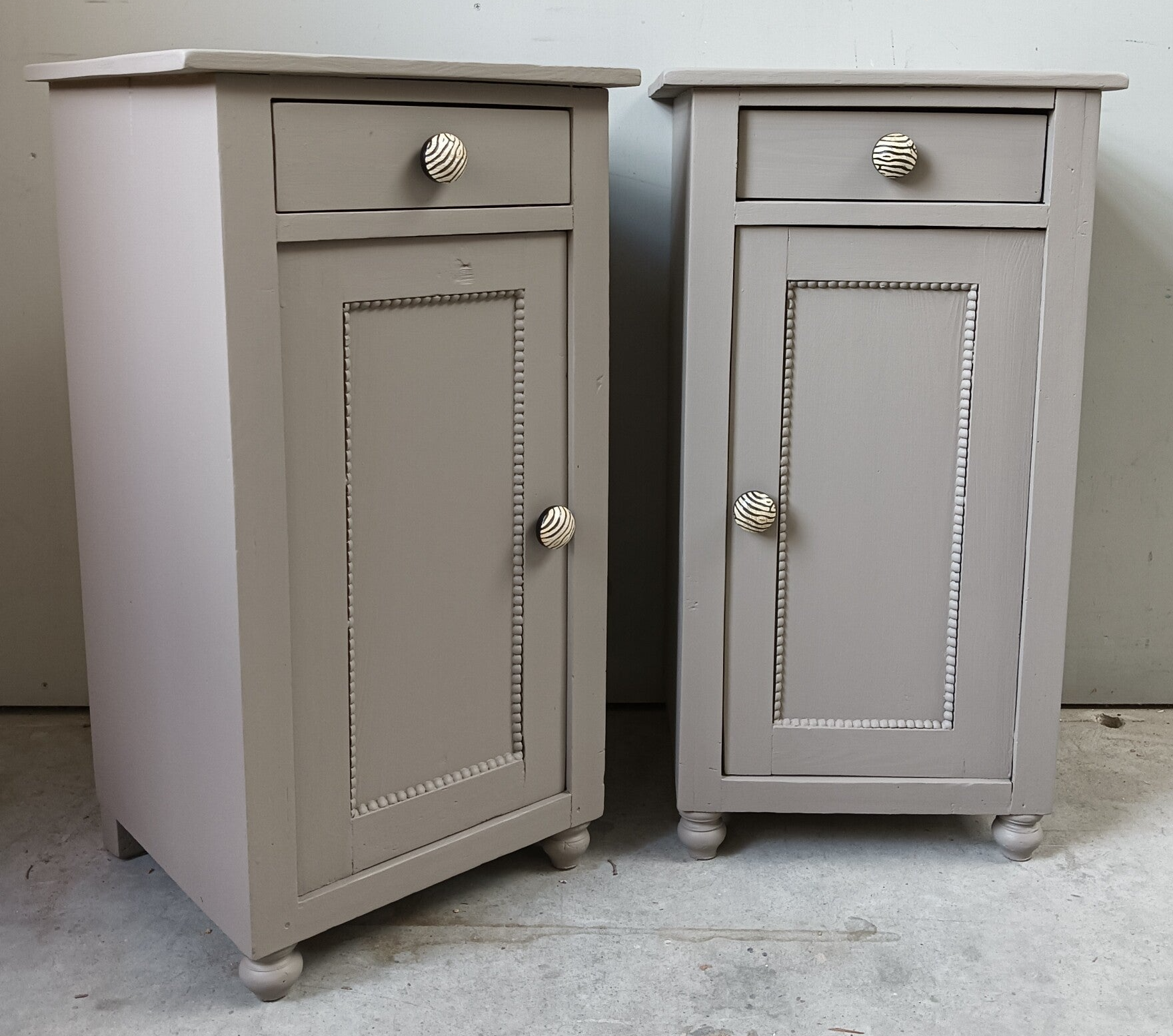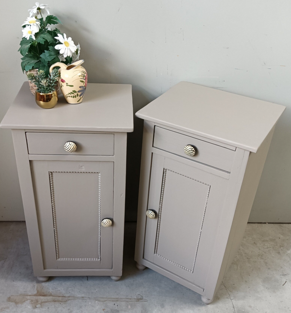 Een prachtige kleur deze warme taupe tint van Fusion Mineral Paint. Deze set nachtkastjes zijn in prima vintage staat en afgewerkt met een super leuke bijpassende knop op zowel deurtje als lade. Ooh en qua afmetingen ook echt meer dan goed voor naast een boxspring !