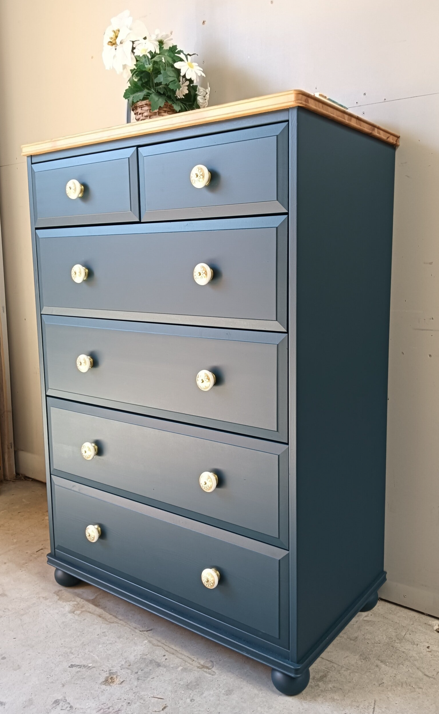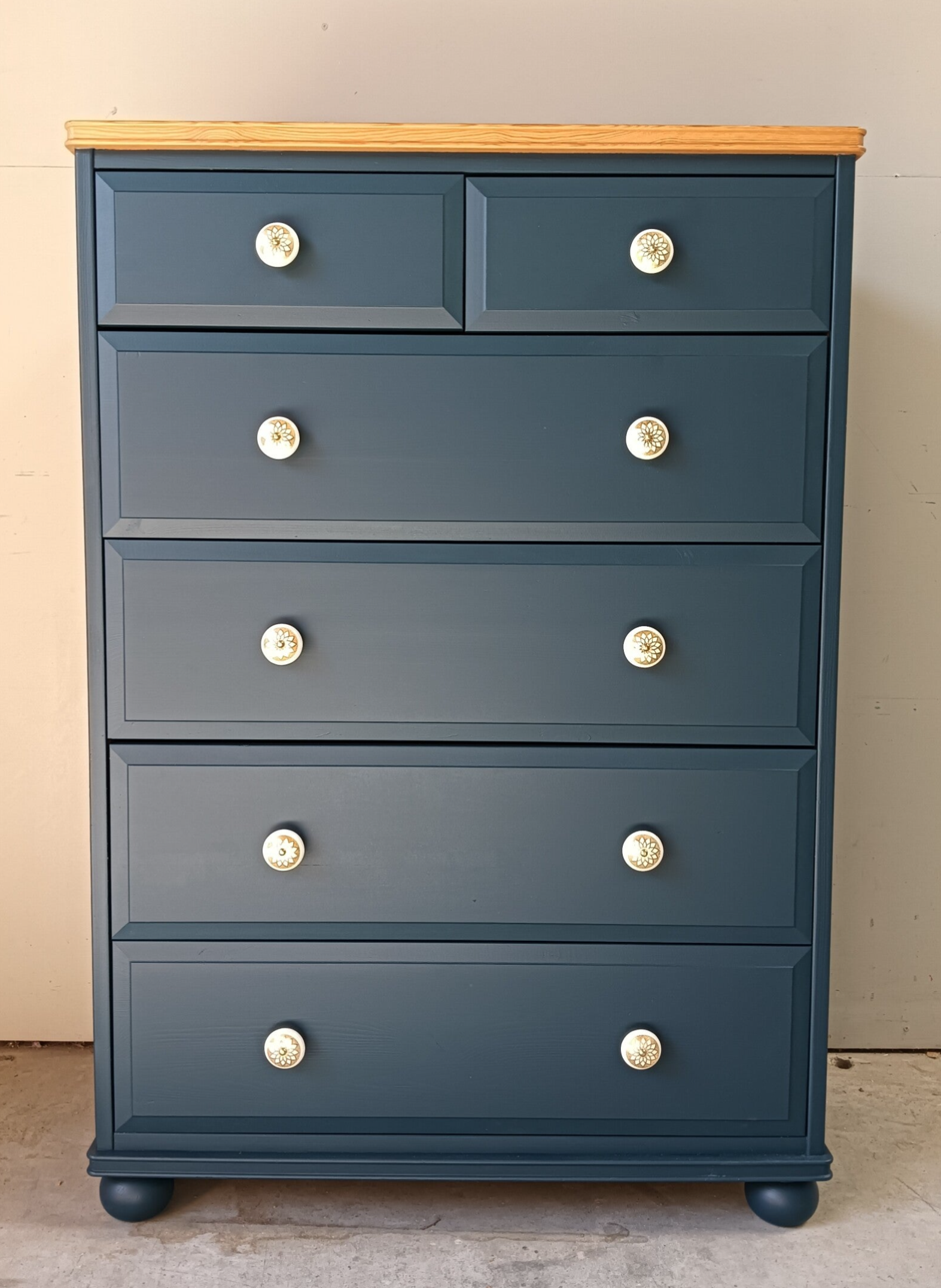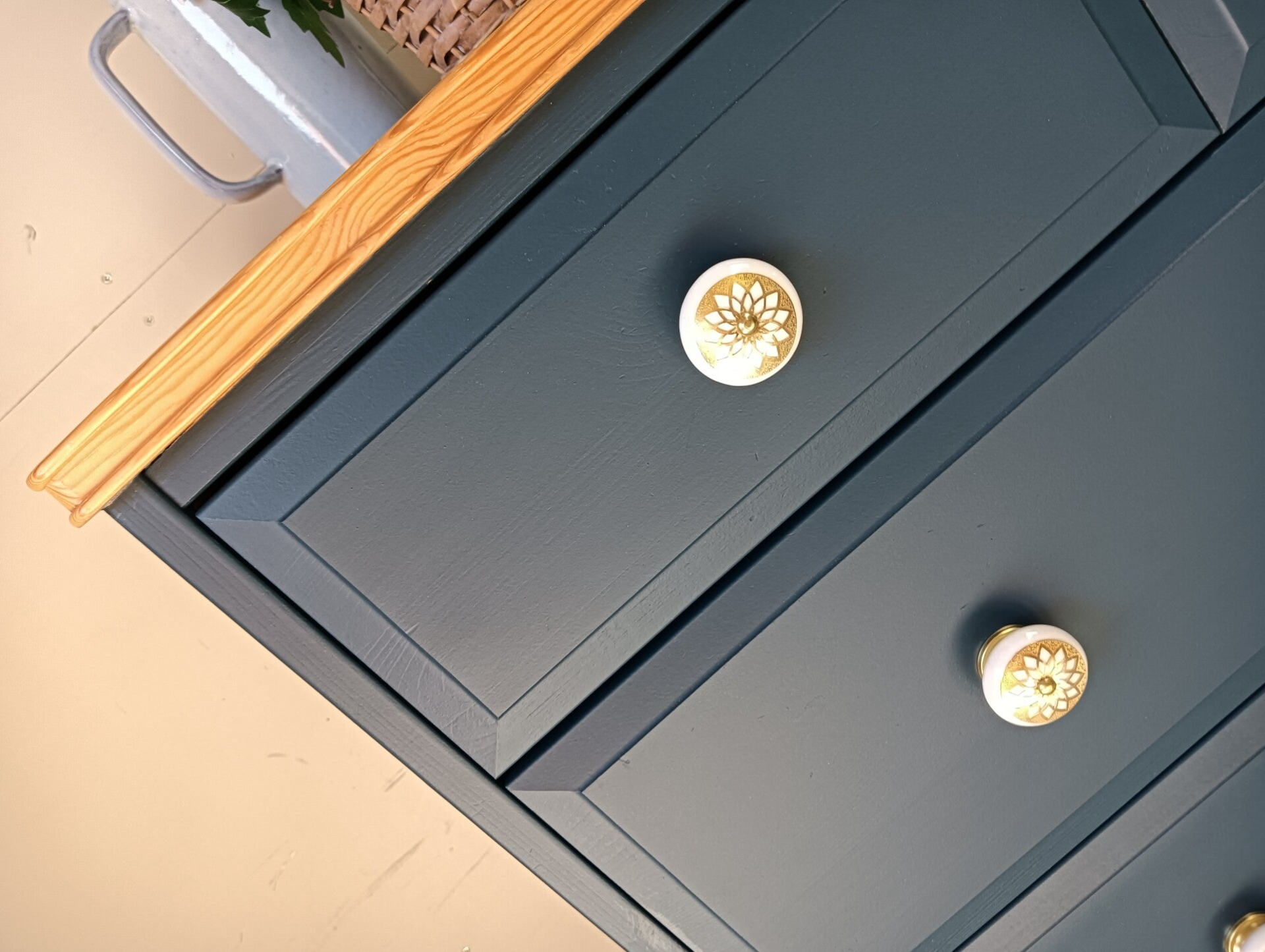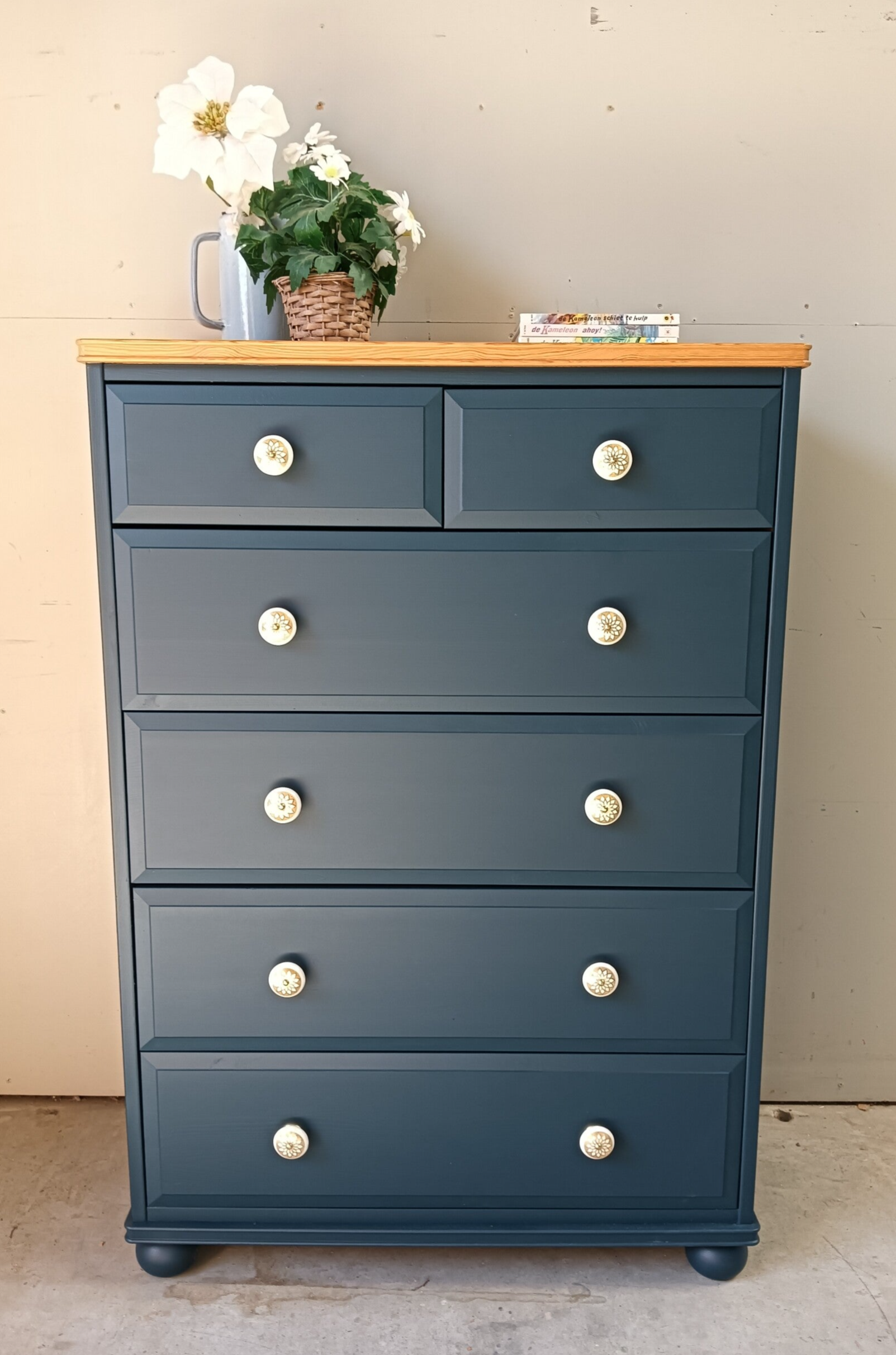 Een prachtige en statige ladenkast. De kleur Willowbank van Fusion Mineral Paint is een mooi en diep blauwe kleur, wat erg goed gaat met het natuurlijke houten bovenblad. Deze kast heeft heerlijk wat hoogte en lades lopen uitstekend. Gezocht is naar een knop wat de kast extra geeft en tegelijk goed samen gaat me de de kleur van zowel de lades als het bovenblad. Wat ons betreft is dat gelukt !