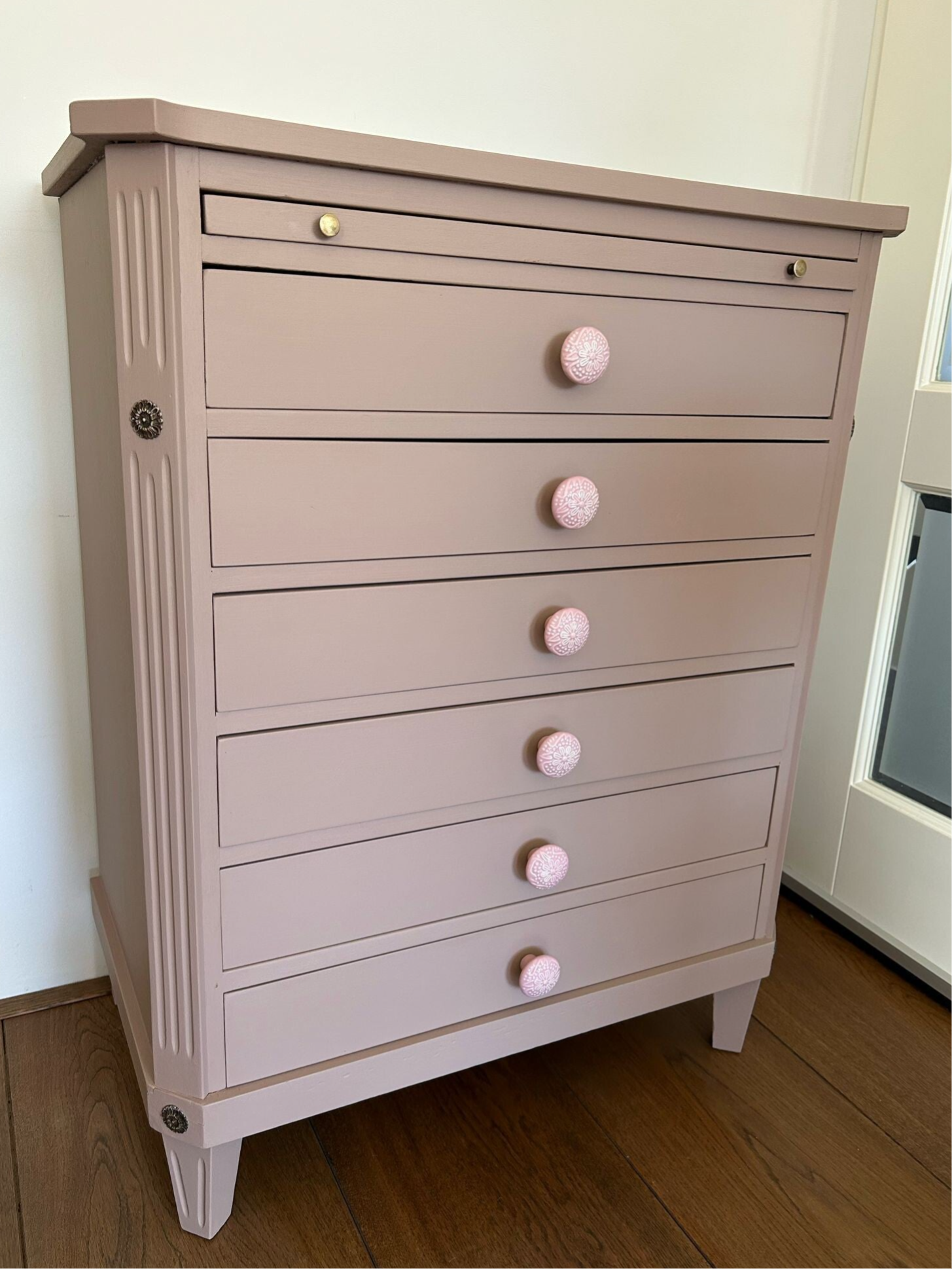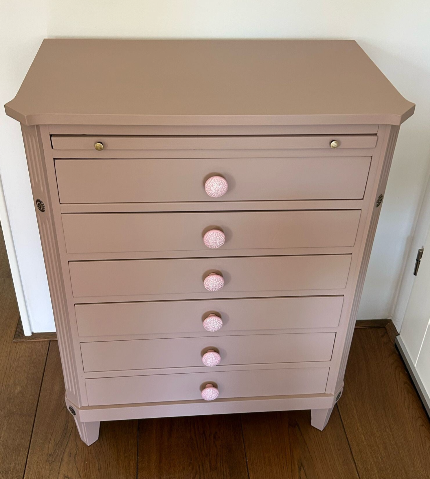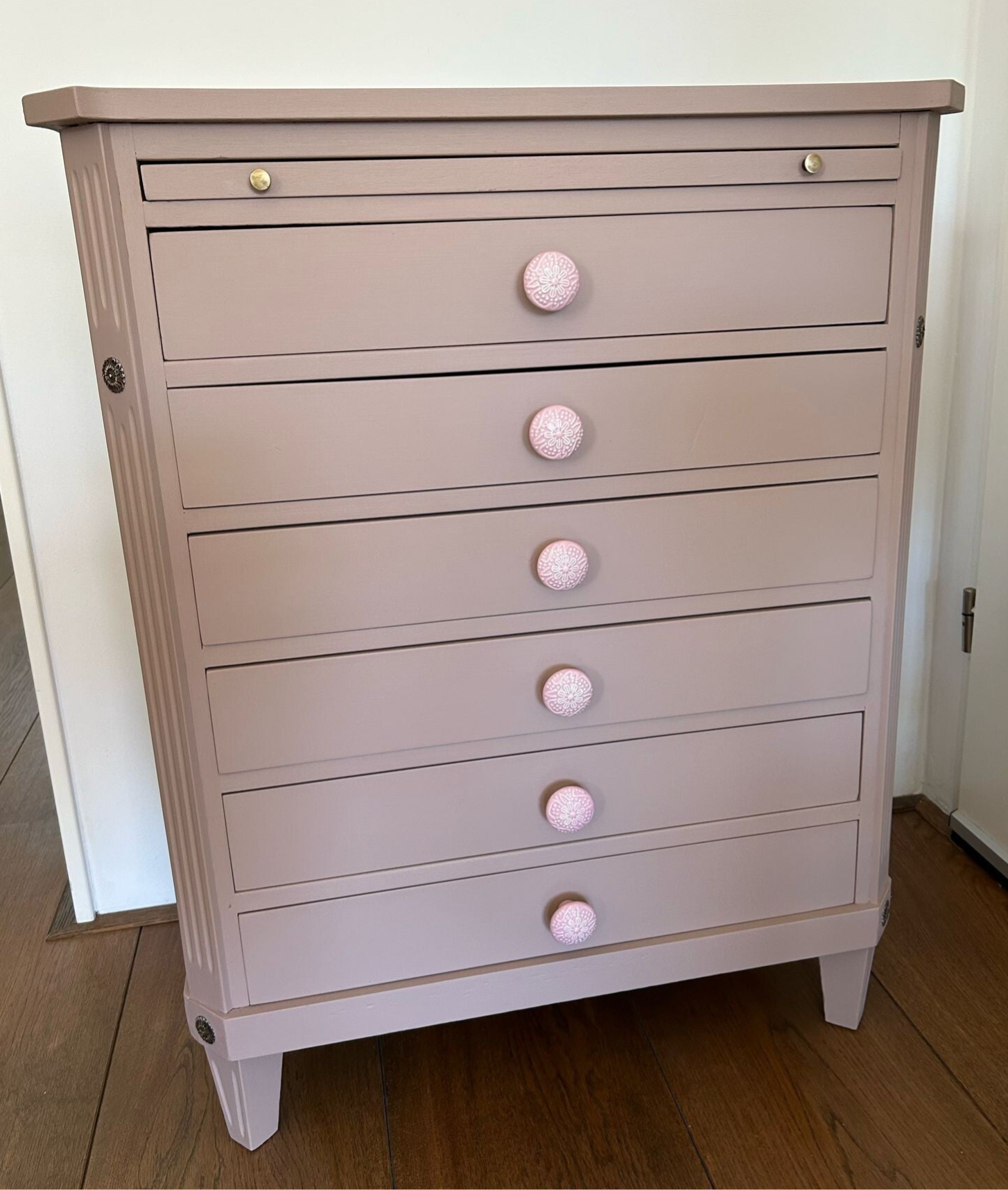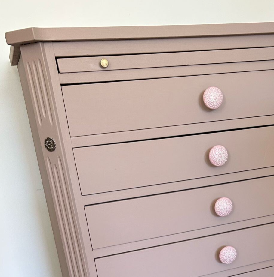 Stijlvol, mooie lijnen en een prettige kleur. De kleur Damask van Fusion Mineral Paint is hier gebruikt. Een mooie oud roze enigszins nude tint wat dit ladekastje goed staat. De knopjes op de lades geven een het nog wat extra's, wat het net weer wat speelser maakt. Fijne afmetingen en lekker wat laatjes wat een hoop opbergruimte genereert !