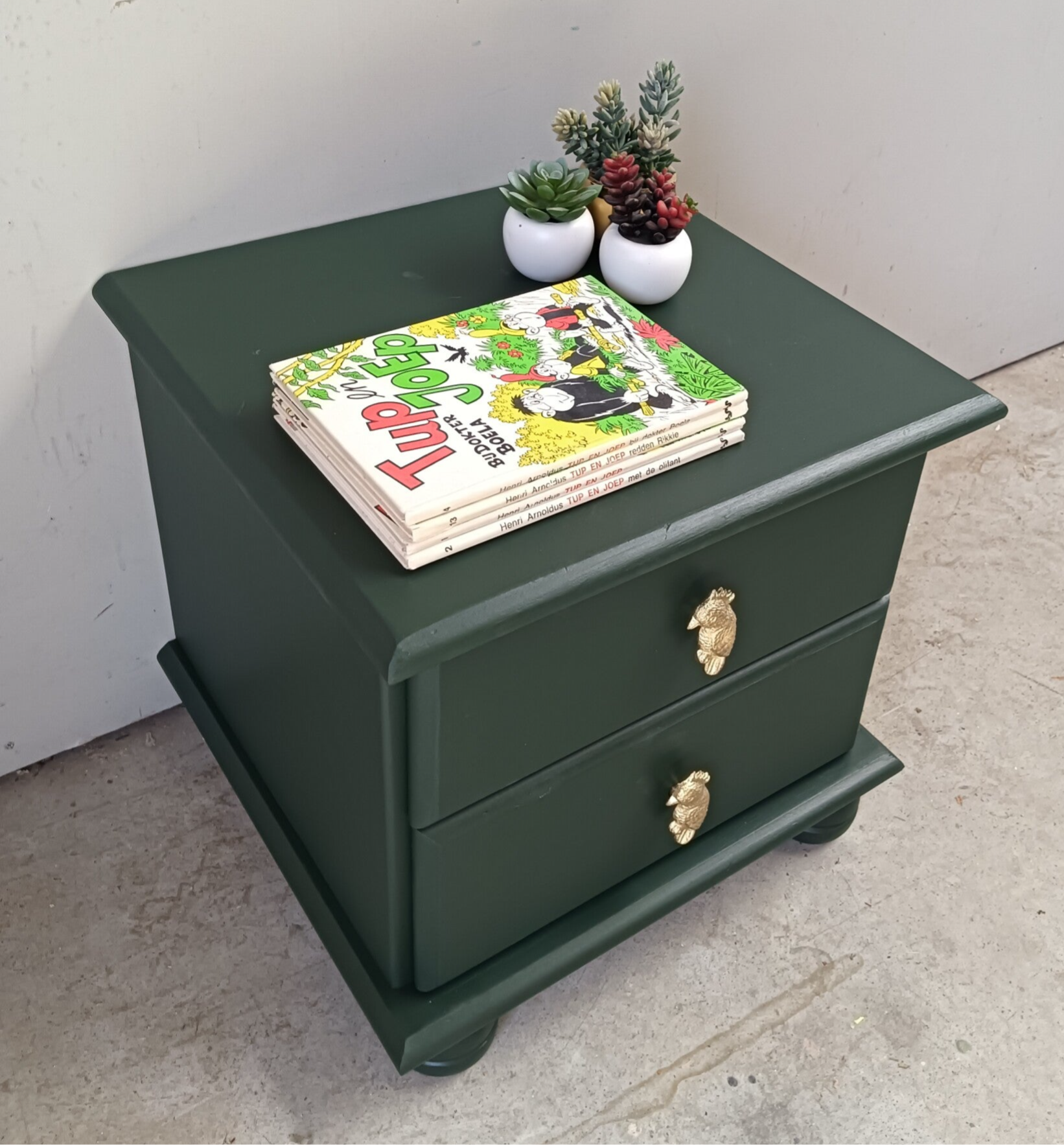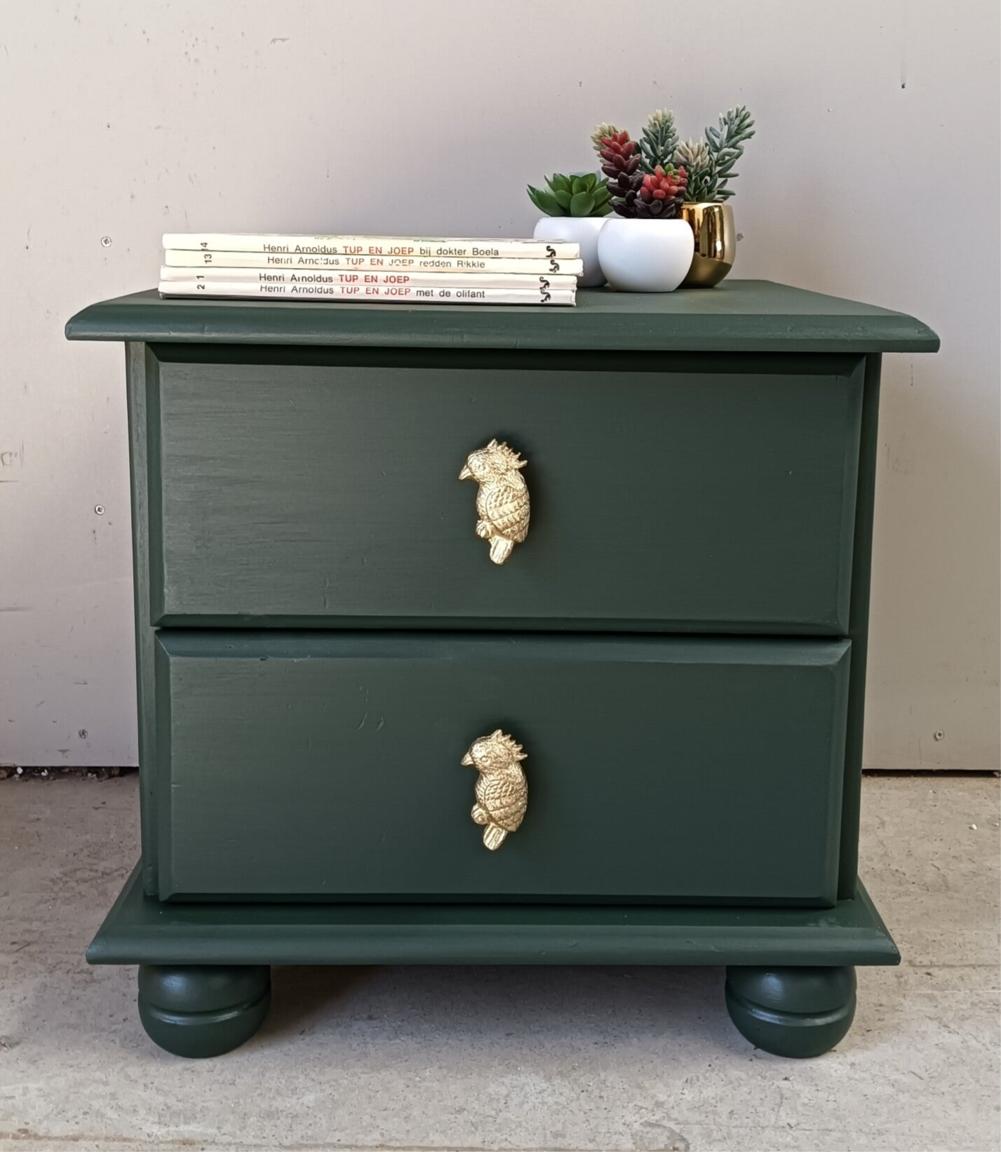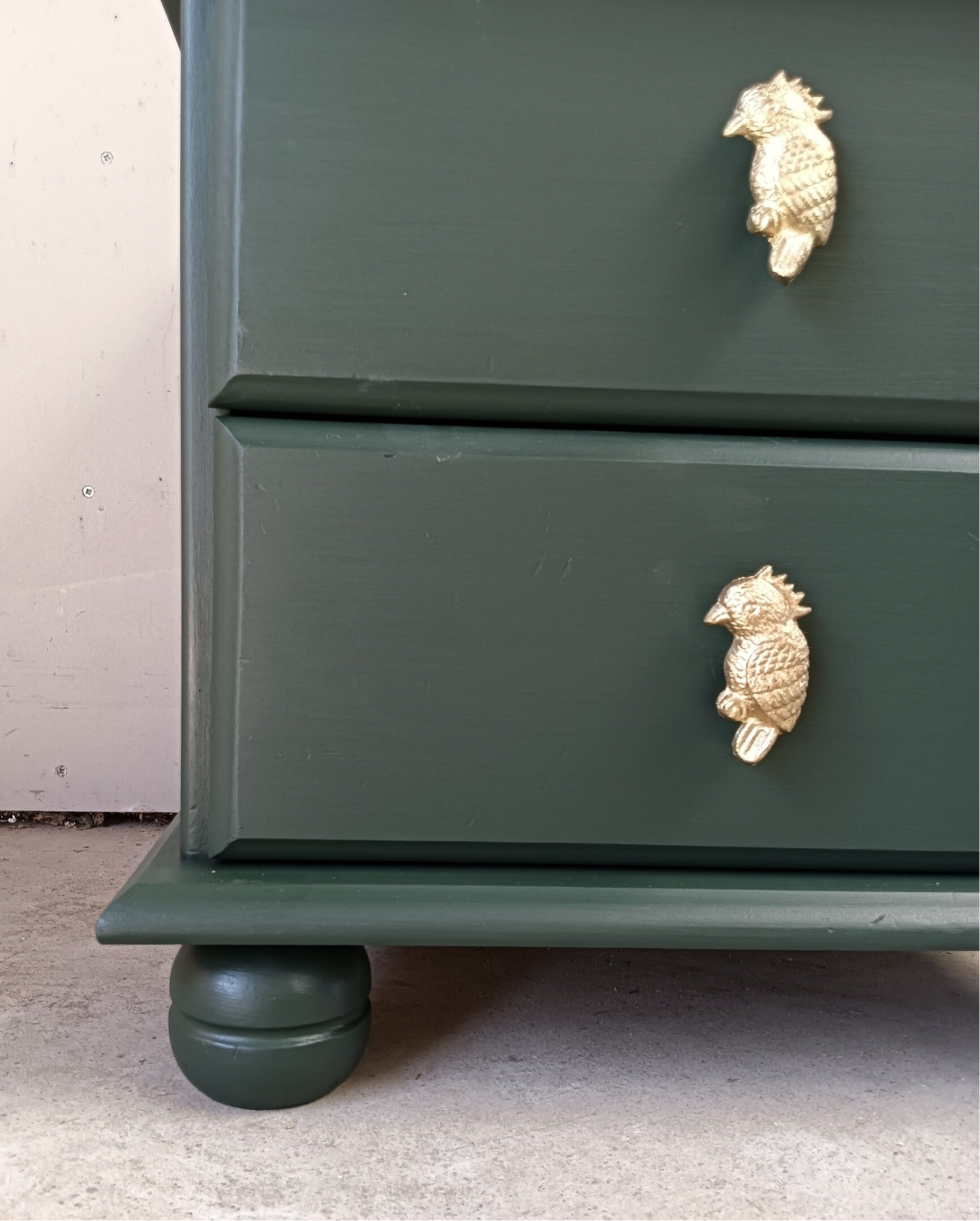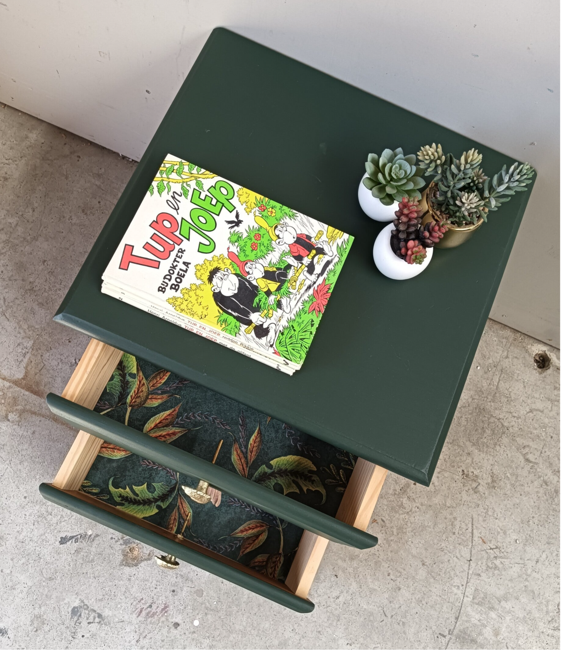 Een lief en leuk model ladenkastje en tegelijker tijd een echte blikvanger zo in de groene kleur Manor Green van Fusion Mineral Paint. Op de lades hebben we een waanzinnig leuke knop gezet, wat het een uniek item maakt. Ook de binnenkant heeft een bijpassend design gekregen.