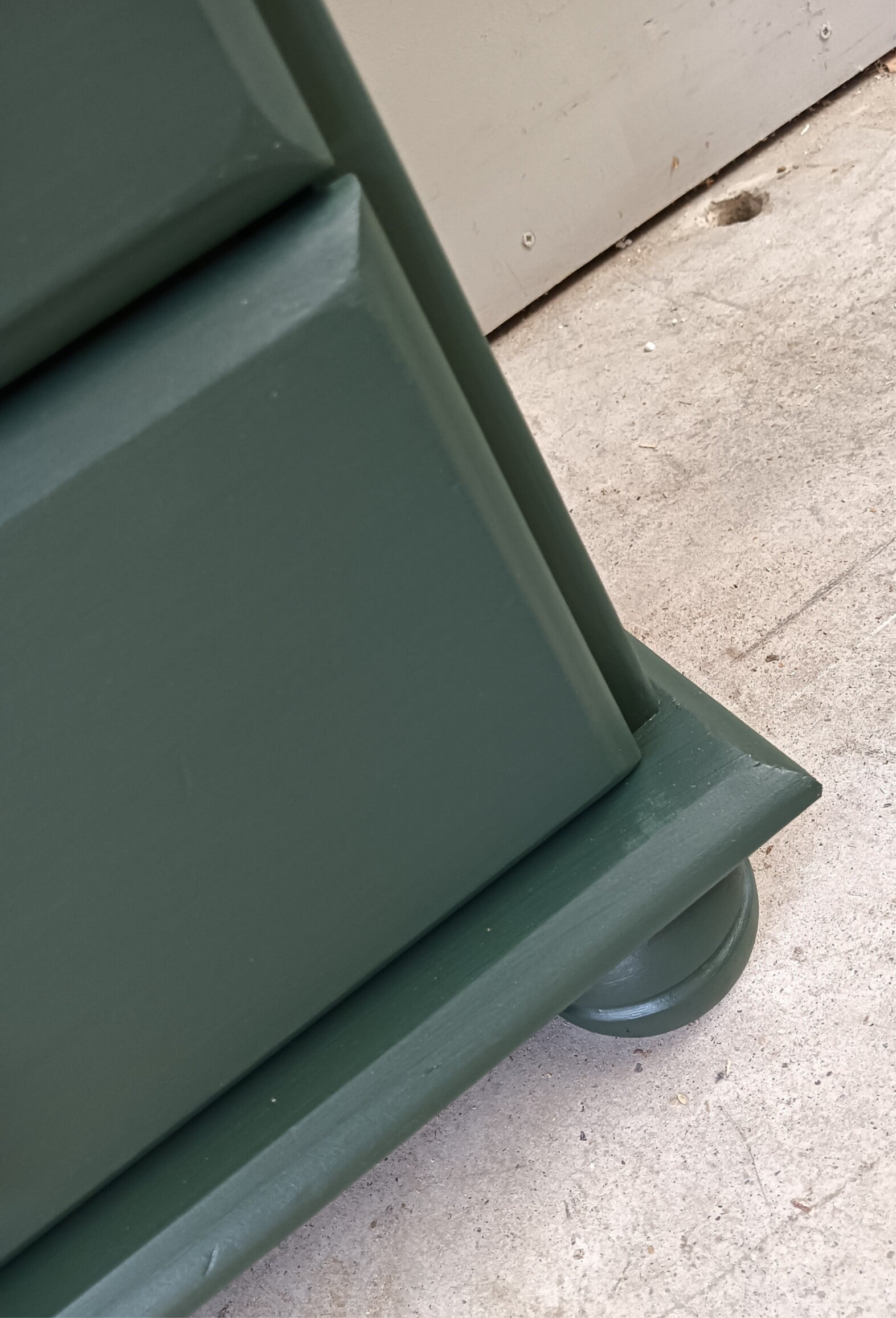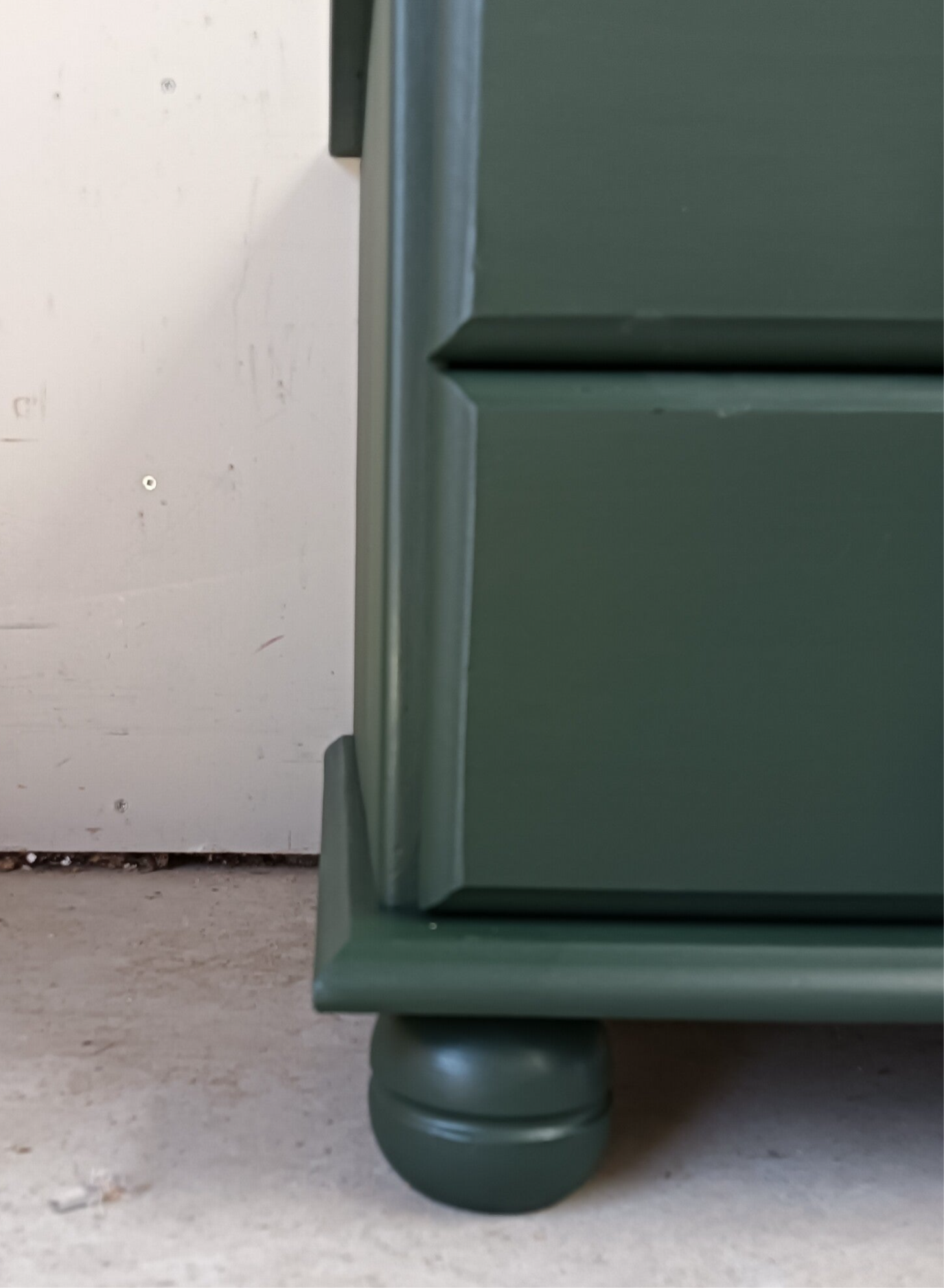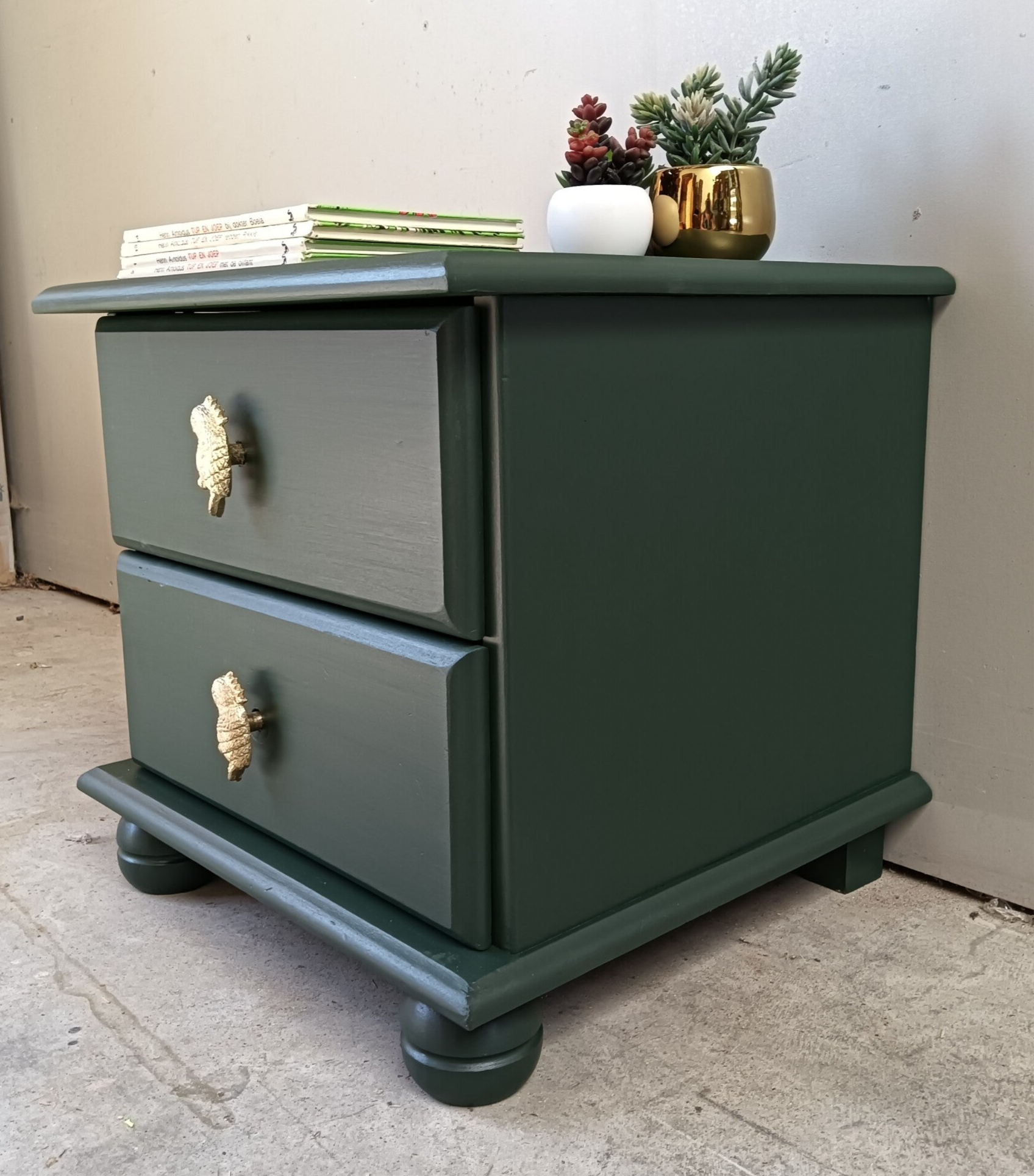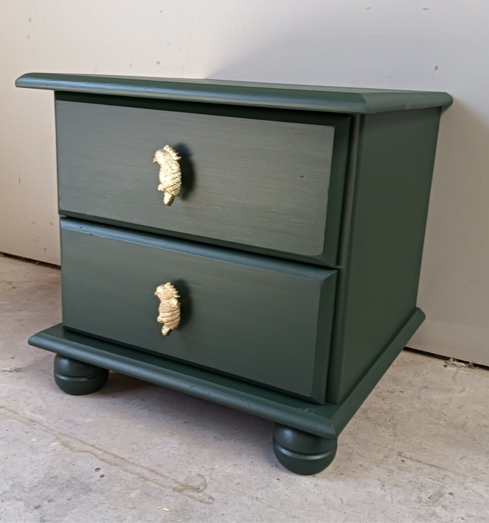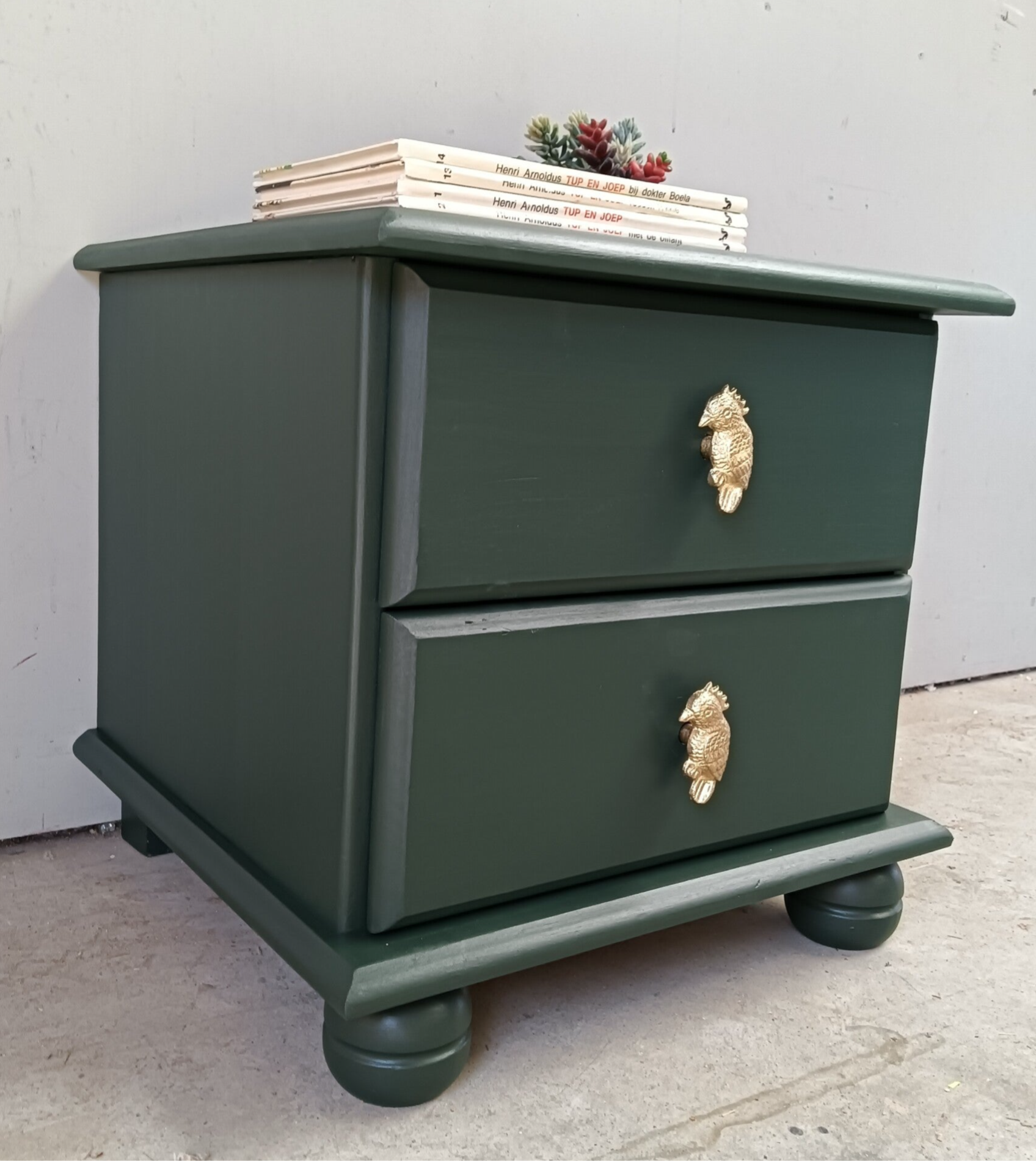 Een lief en leuk model ladenkastje en tegelijker tijd een echte blikvanger zo in de groene kleur Manor Green van Fusion Mineral Paint. Op de lades hebben we een waanzinnig leuke knop gezet, wat het een uniek item maakt. Ook de binnenkant heeft een bijpassend design gekregen.