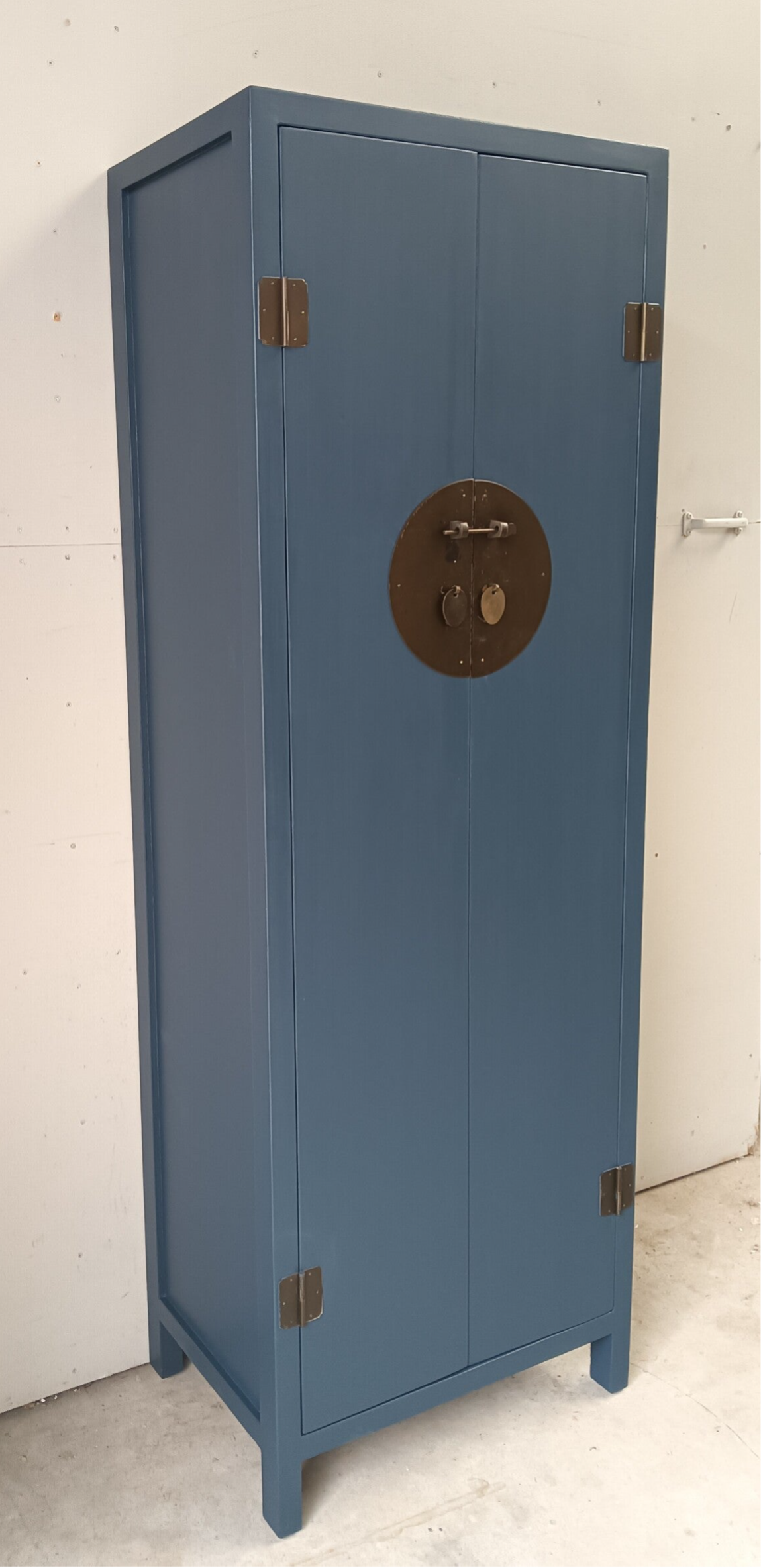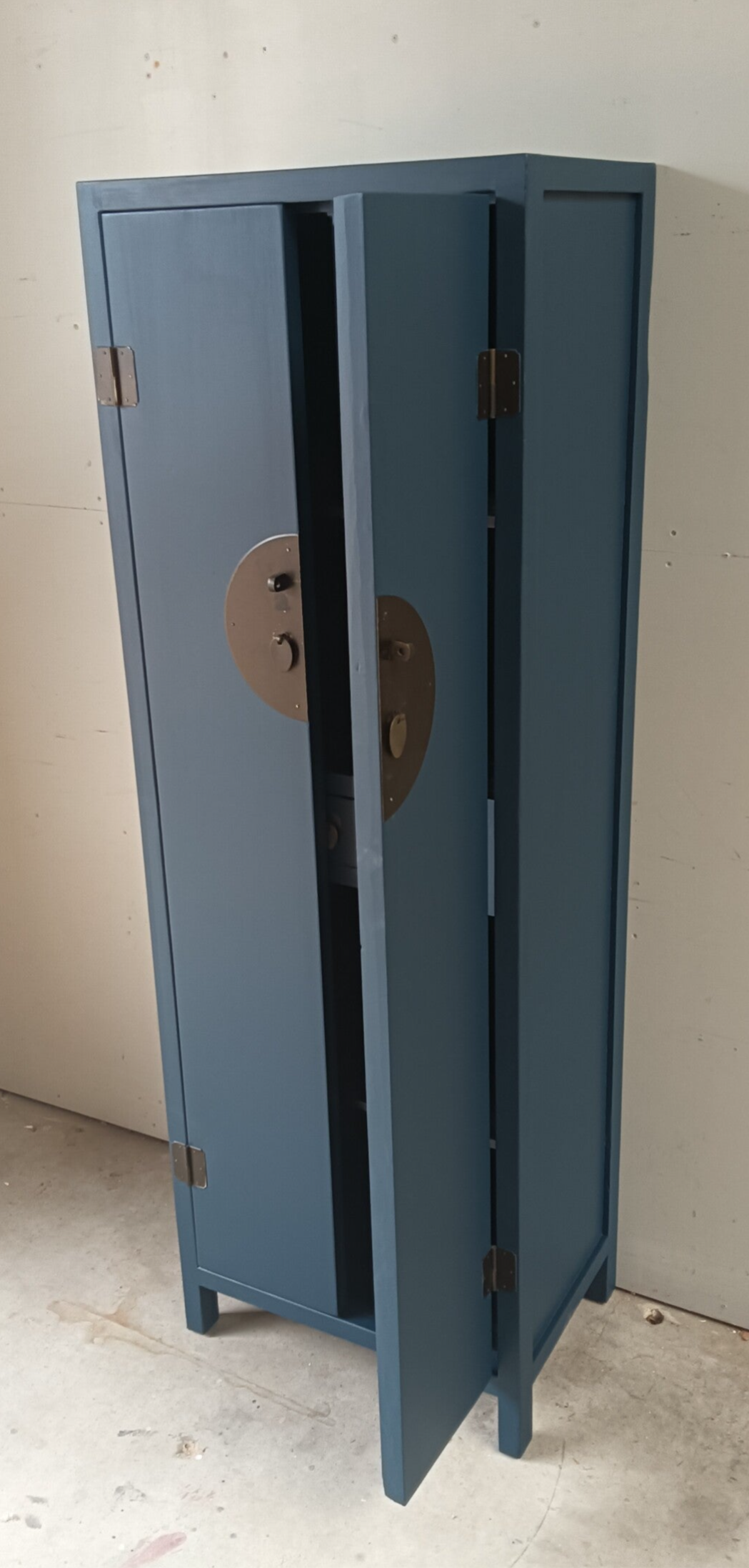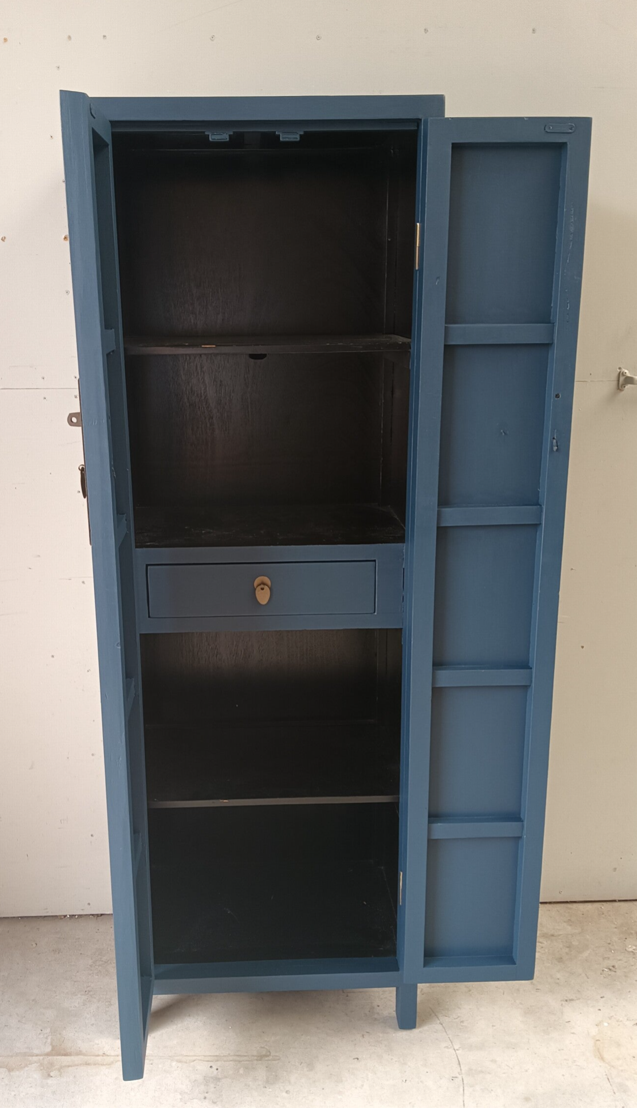 Wat een ontzettend leuk kastje is dit geworden zeg. Ze heeft bescheiden afmetingen, waardoor je al snel een plekje voor haar hebt en niet onbelangrijk, ze kan voor verschillende functies ingezet worden. Garderobe kast, servieskast, halkast, linnenkast etc etc. Legio mogelijkheden wat ons betreft. De kleur Willowbank, van Fusion Mineral Paint, is hier gebruikt en laat zich omschrijven als een mooi, diep en intens blauw. Dit in combinatie met het orginele beslag maakt het een mooi en prettig geheel. Aan de binnenzijde van de kast ook nog een laatje met het zelfde type beslag als de buitenzijde.
