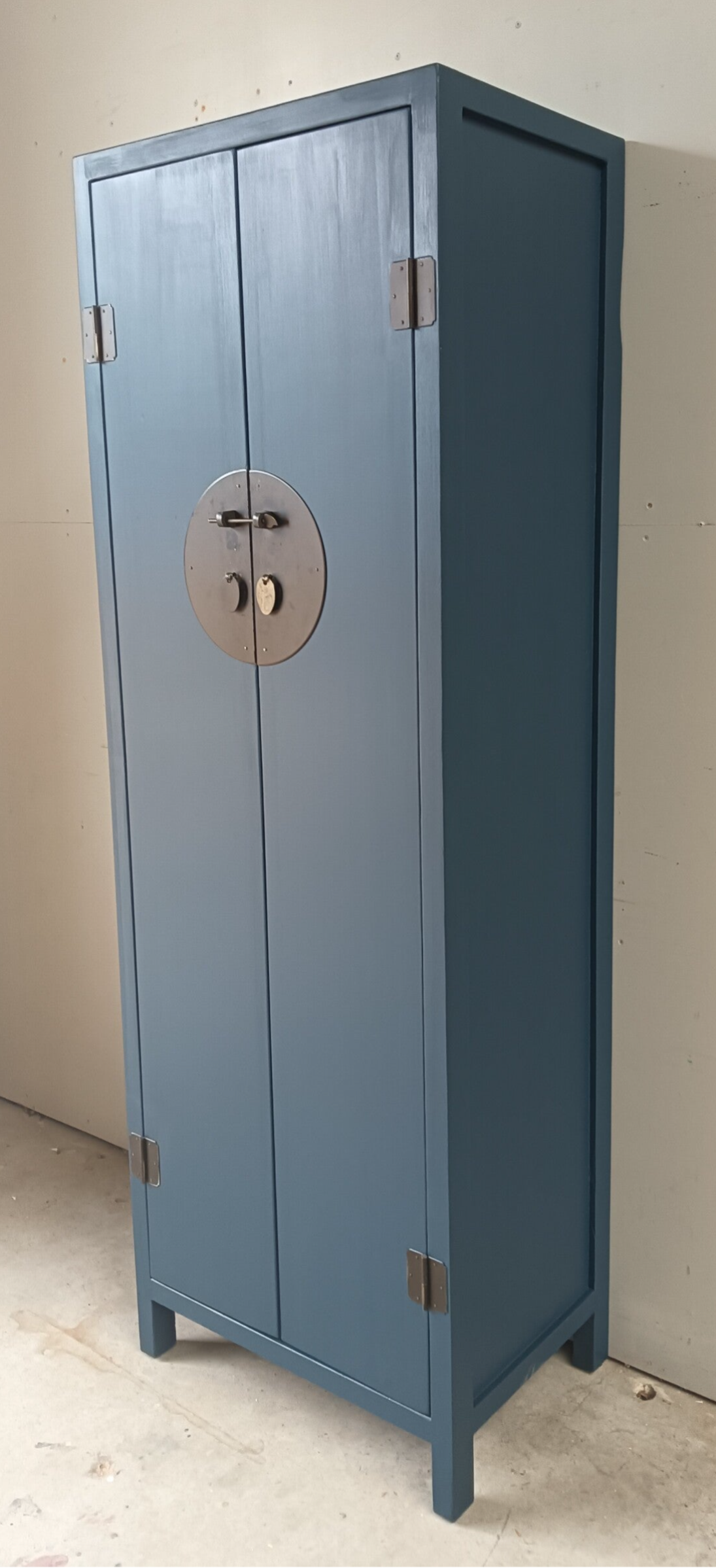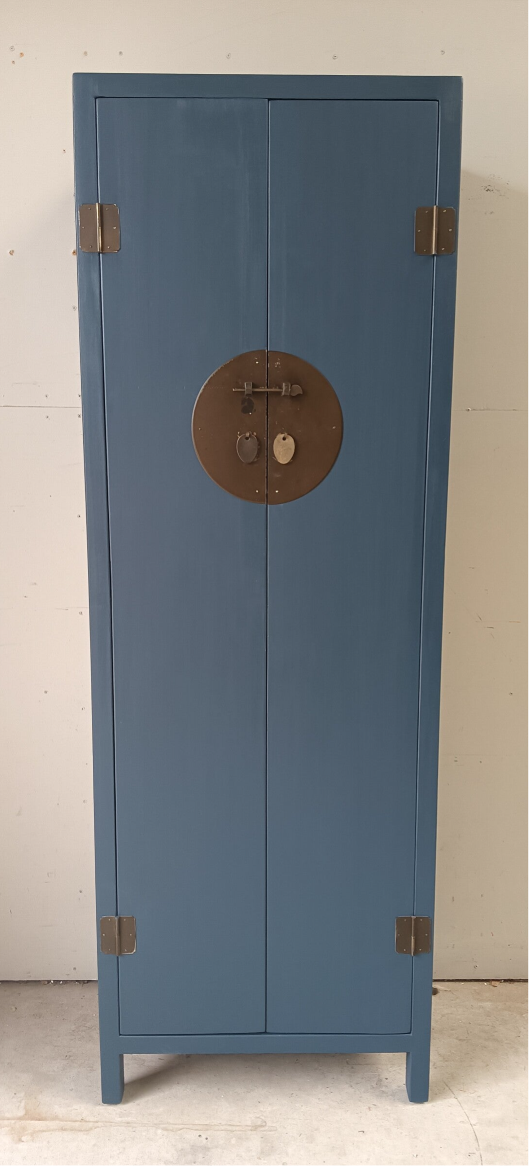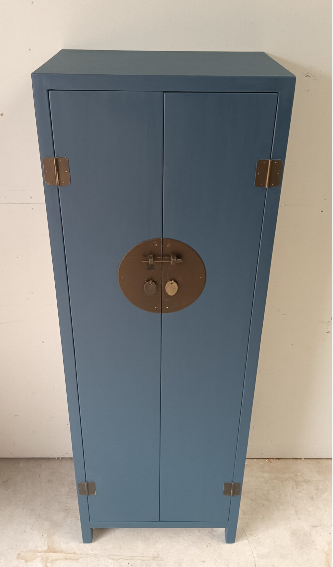 Wat een ontzettend leuk kastje is dit geworden zeg. Ze heeft bescheiden afmetingen, waardoor je al snel een plekje voor haar hebt en niet onbelangrijk, ze kan voor verschillende functies ingezet worden. Garderobe kast, servieskast, halkast, linnenkast etc etc. Legio mogelijkheden wat ons betreft. De kleur Willowbank, van Fusion Mineral Paint, is hier gebruikt en laat zich omschrijven als een mooi, diep en intens blauw. Dit in combinatie met het orginele beslag maakt het een mooi en prettig geheel. Aan de binnenzijde van de kast ook nog een laatje met het zelfde type beslag als de buitenzijde.