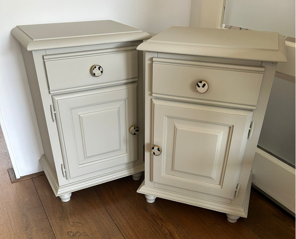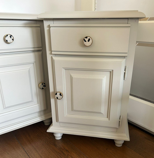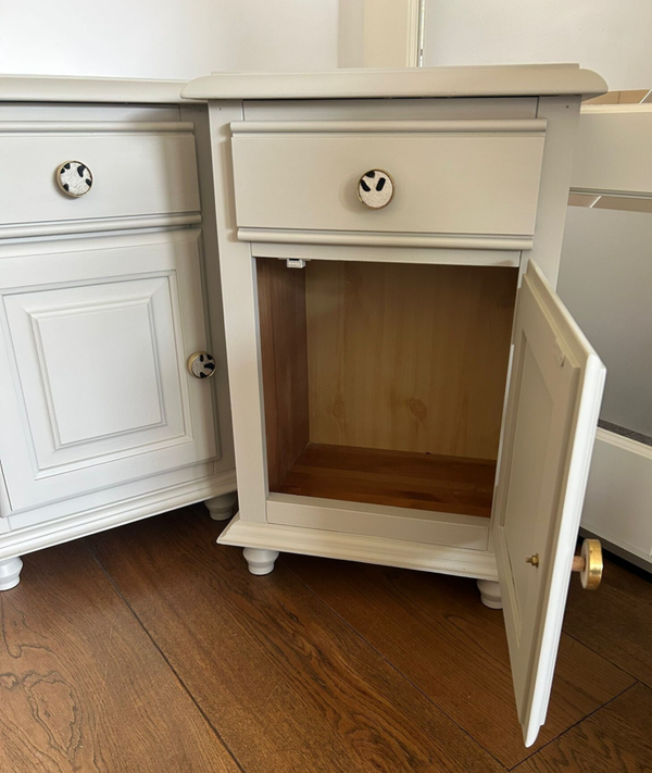 Deze set nachtkastjes, met hun subtiele houtsnijwerk/belijning, staan in de kleur Putty van Fusion Mineral Paint. Deze kleur laat zich het best omschrijven als een creme of lichte taupe tint. De deurtjes & laadjes sluiten goed en na behoren. Ze zijn afgewerkt met mooie bijpassende knoppen op zowel het laatje als deurtje.