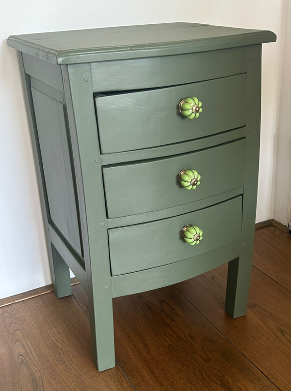 Deze set nachtkastjes, met hun subtiele belijning, staan in de kleur Bayberry van Fusion Mineral Paint. Deze kleur laat zich het best omschrijven als een olijf groene tint. De laadjes zijn afgewerkt met mooie bijpassende knoppen wat het geheel helemaal afmaakt.
