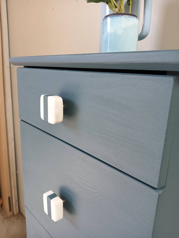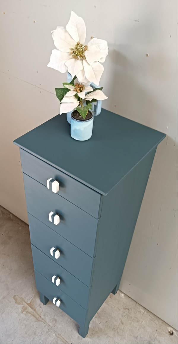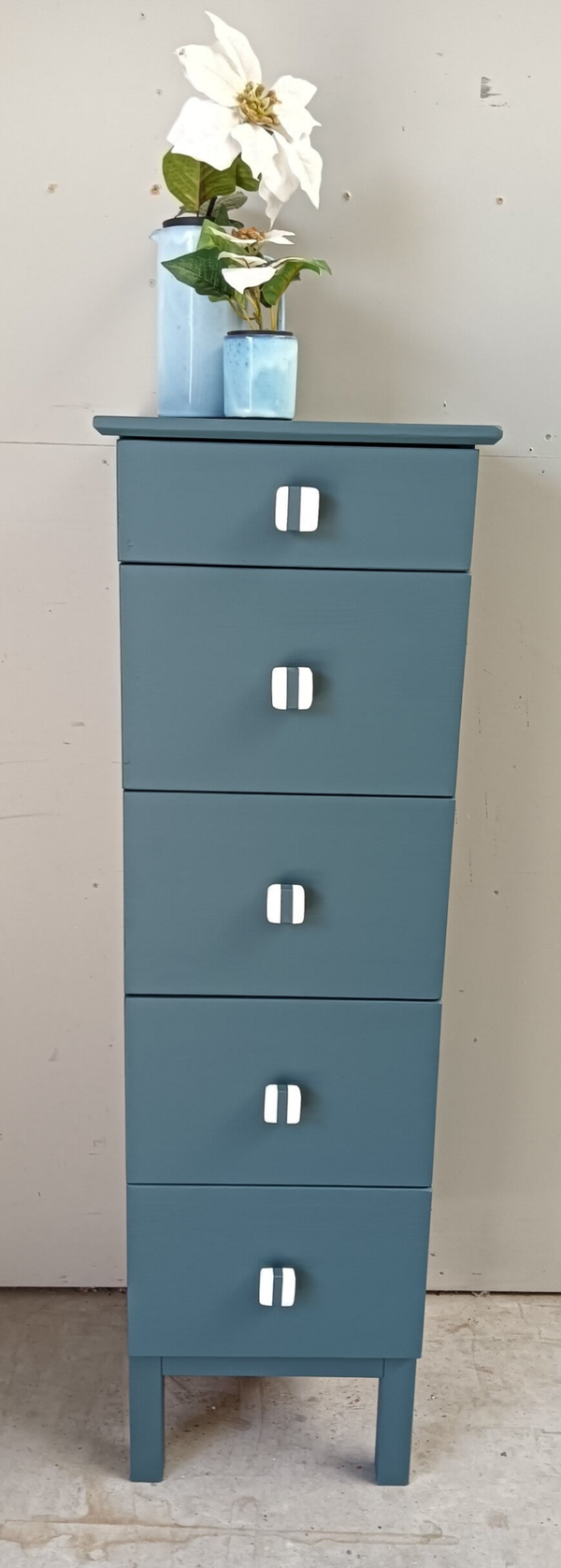 Solide grenen ladenkast met lekker wat lades. De kast staat in de kleur Homestead Blue, een mooi petrol blauw van Fusion Mineral Paint. De knoppen die geplaatst zijn op de goed lopende lades hebben ook een touch van kleur, wat het geheel helemaal afmaakt.
