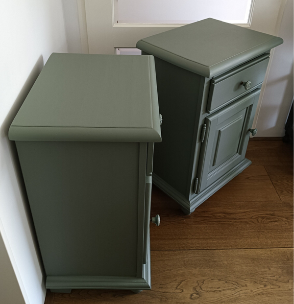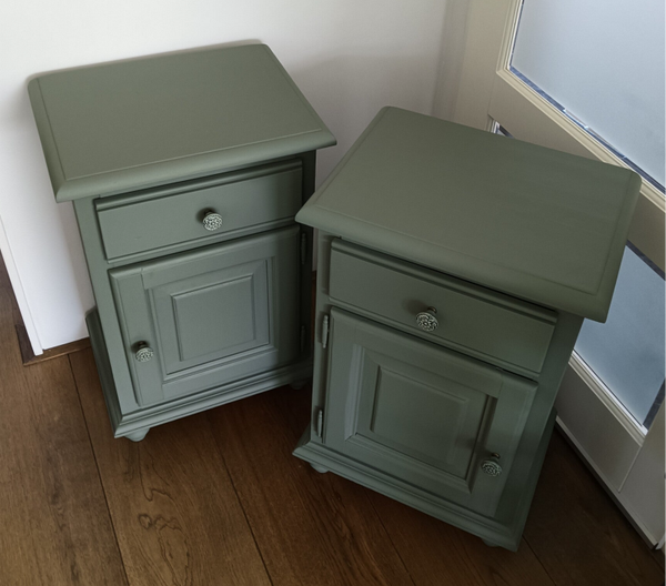Deze set nachtkastjes, met hun subtiele houtsnijwerk/belijning, staan in de kleur Carriage House van Fusion Mineral Paint. Deze kleur laat zich het best omschrijven als een lagune groene tint. De deurtjes & laadjes sluiten goed en na behoren. Ze zijn afgewerkt met mooie bijpassende knoppen op zowel het laatje als deurtje. Uiteraard kan het niet anders dan dat de tijd zijn sporen heeft achter gelaten, maar dit is zeker niet storend. Functioneel zijn ze zeker nog!