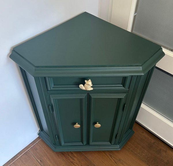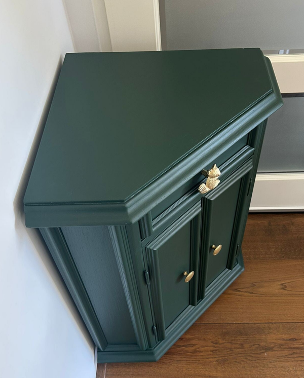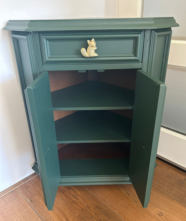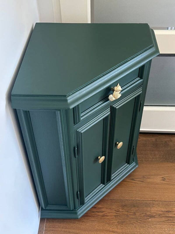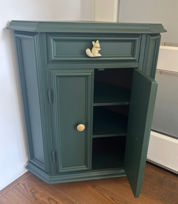 Dit kastje leent zich toch helemaal uitstekend voor dat ene verloren hoekje in huis?! Leuk formaat, fijne kleur en te gekke knoppen maken het dan tot een prettig geheel. De kleur Manor Green van Fusion Mineral Paint is hier gebruikt en laat zich het beste omschrijven als een mooi en diepe kleur groen Die knop op het laatje is natuurlijk helemaal leuk, maar ook de knoppen op de deurtjes passen er weer uitstekend bij.