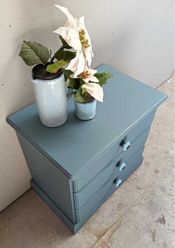 Wat een schat van een kastje is dit geworden. Hier is gebruik gemaakt van een kleur blauw in de mix. Wat ons betreft goed uitpakt en zie daarbij de perfect bijpassende knoppen, helemaal af zo toch? Laatjes lopen primaen is zo toch een fijne en prettige opberger geworden.
