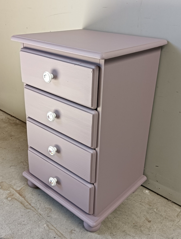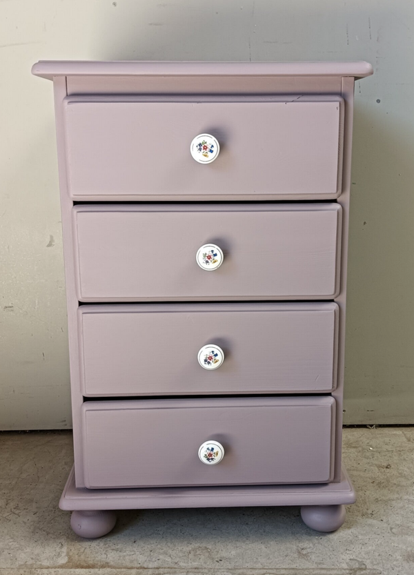 Een prettig formaat ladenkastje en dient als snel als een goede en prettige opberger. De kleur is Lavender Haze van Fusion Mineral Paint, een mooi en zachte lila tint. De knopjes op de lades passen er wat ons betreft uitstekend bij en ook de binnenzijde van de lades heeft een bijpassende uitstraling gekregen. De lades lopen goed en soepel.