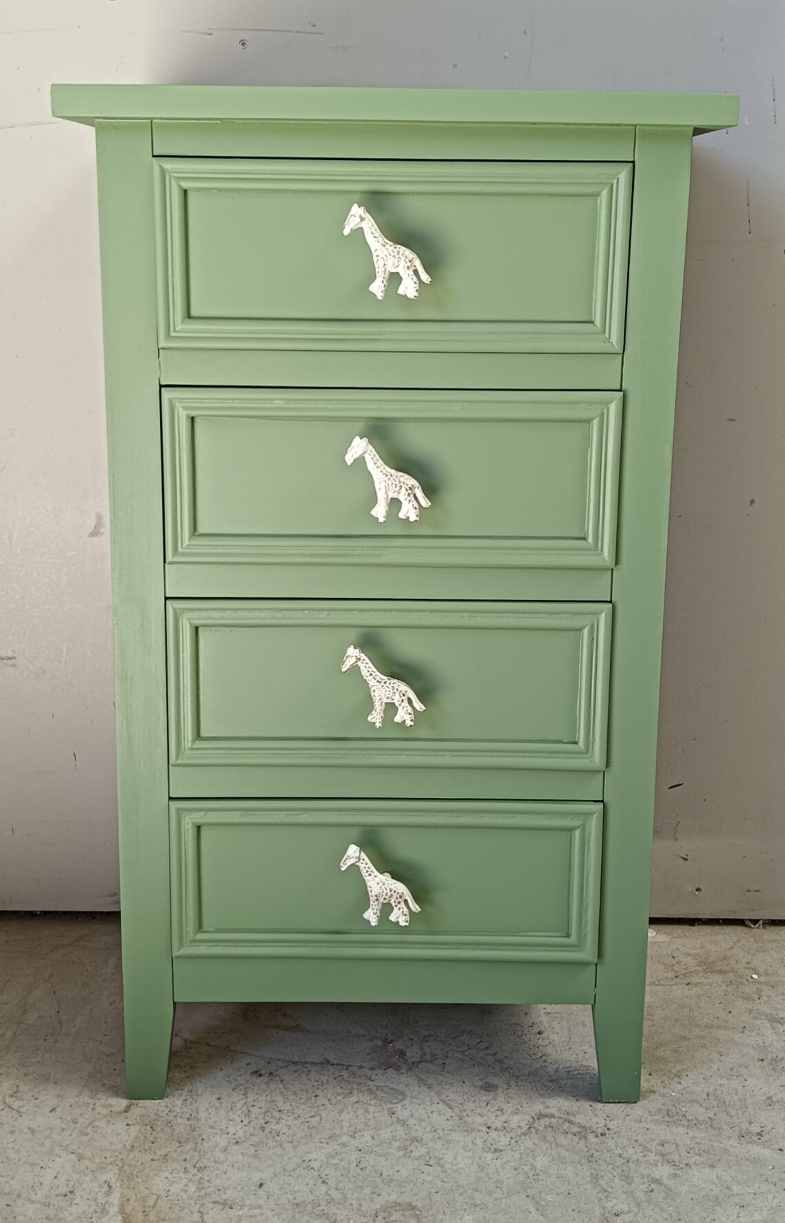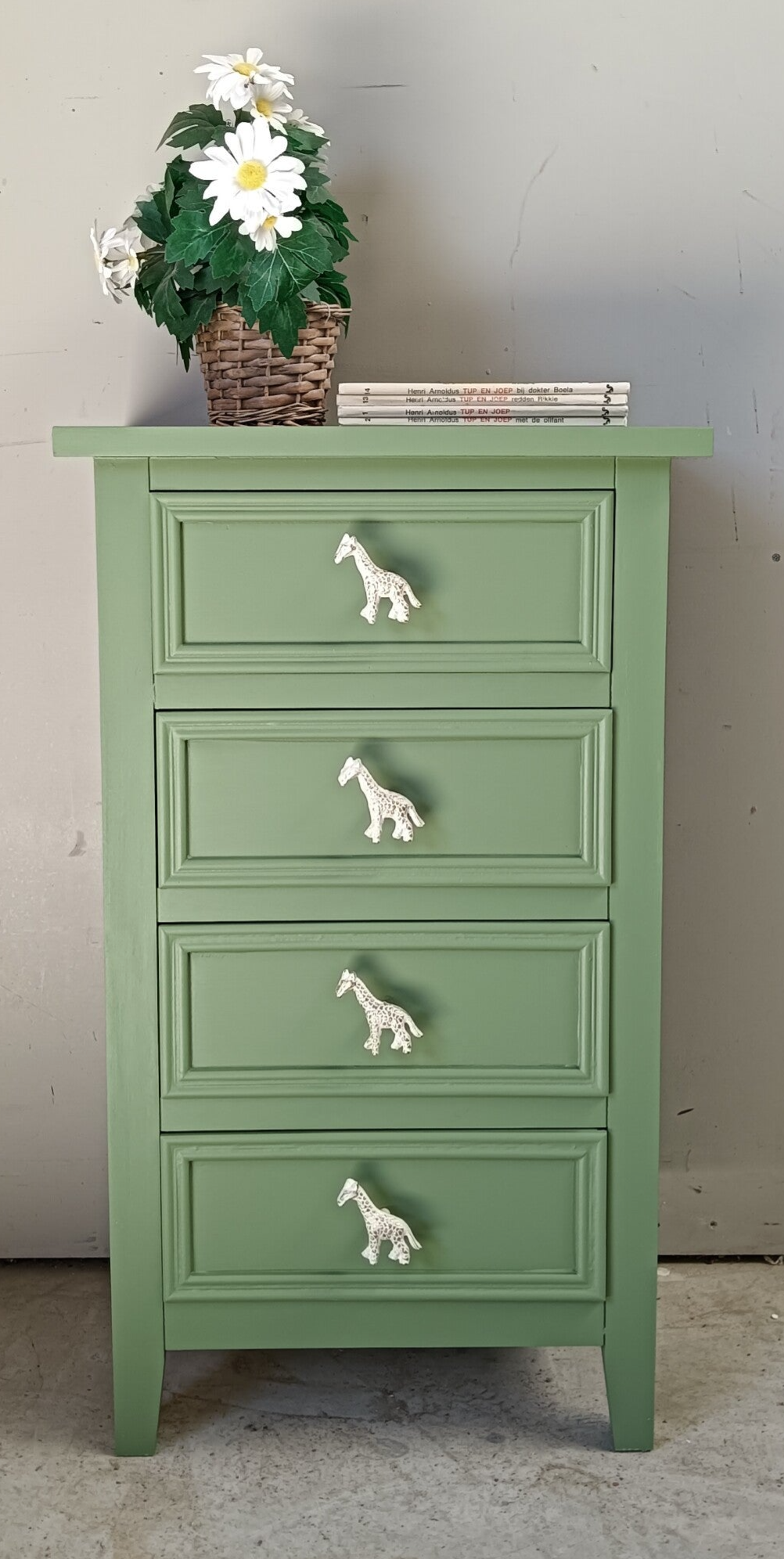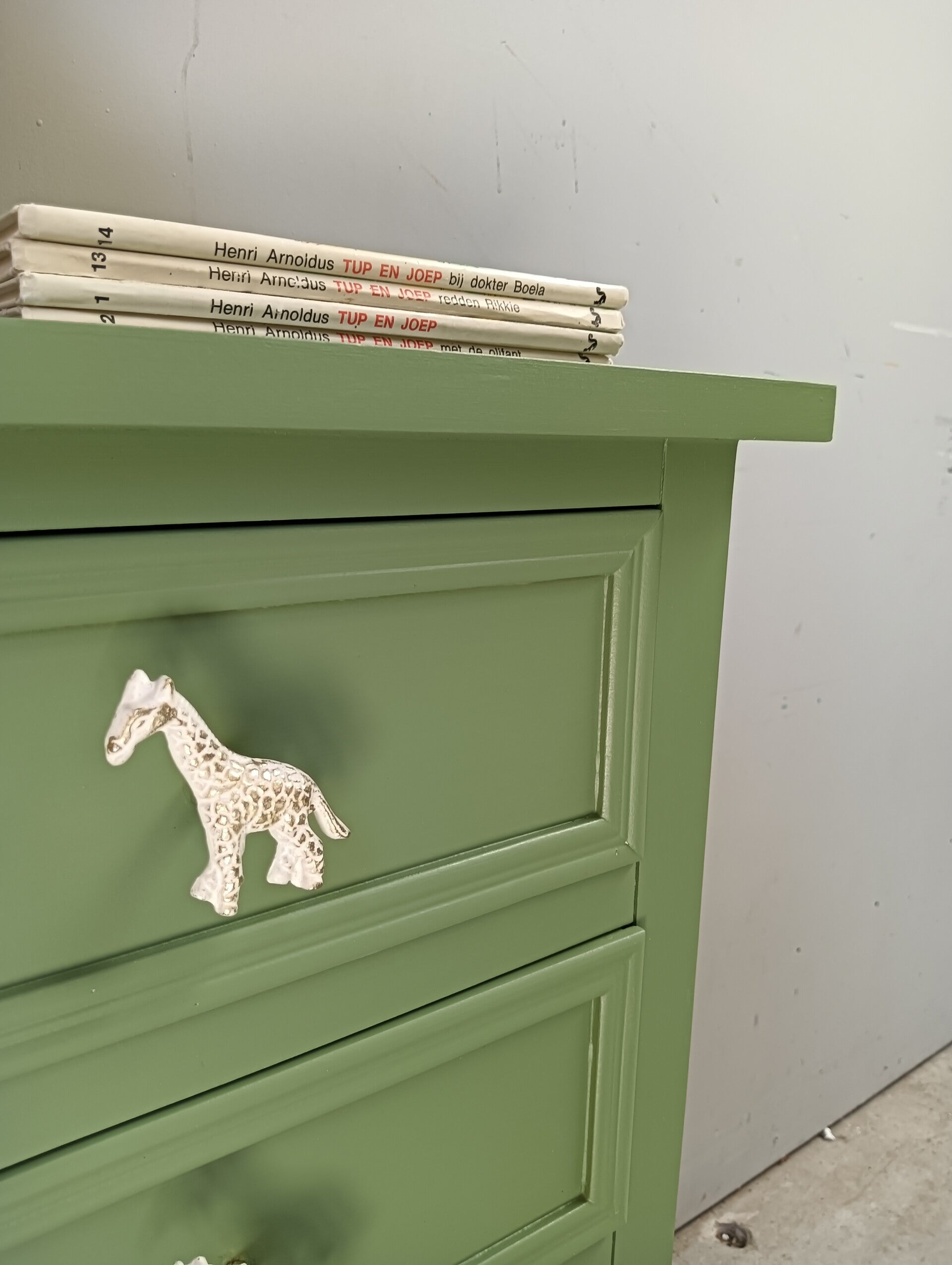 Niet perse een woest oud kastje, maar dat mag de pret niet drukken, want hij is toch wel weer helemaal leuk geworden. Fijne kleur met super leuke giraf knoppen. Ook de binnenzijde van het laatje heeft een desing gekregen. Wat ons betreft helemaal af.