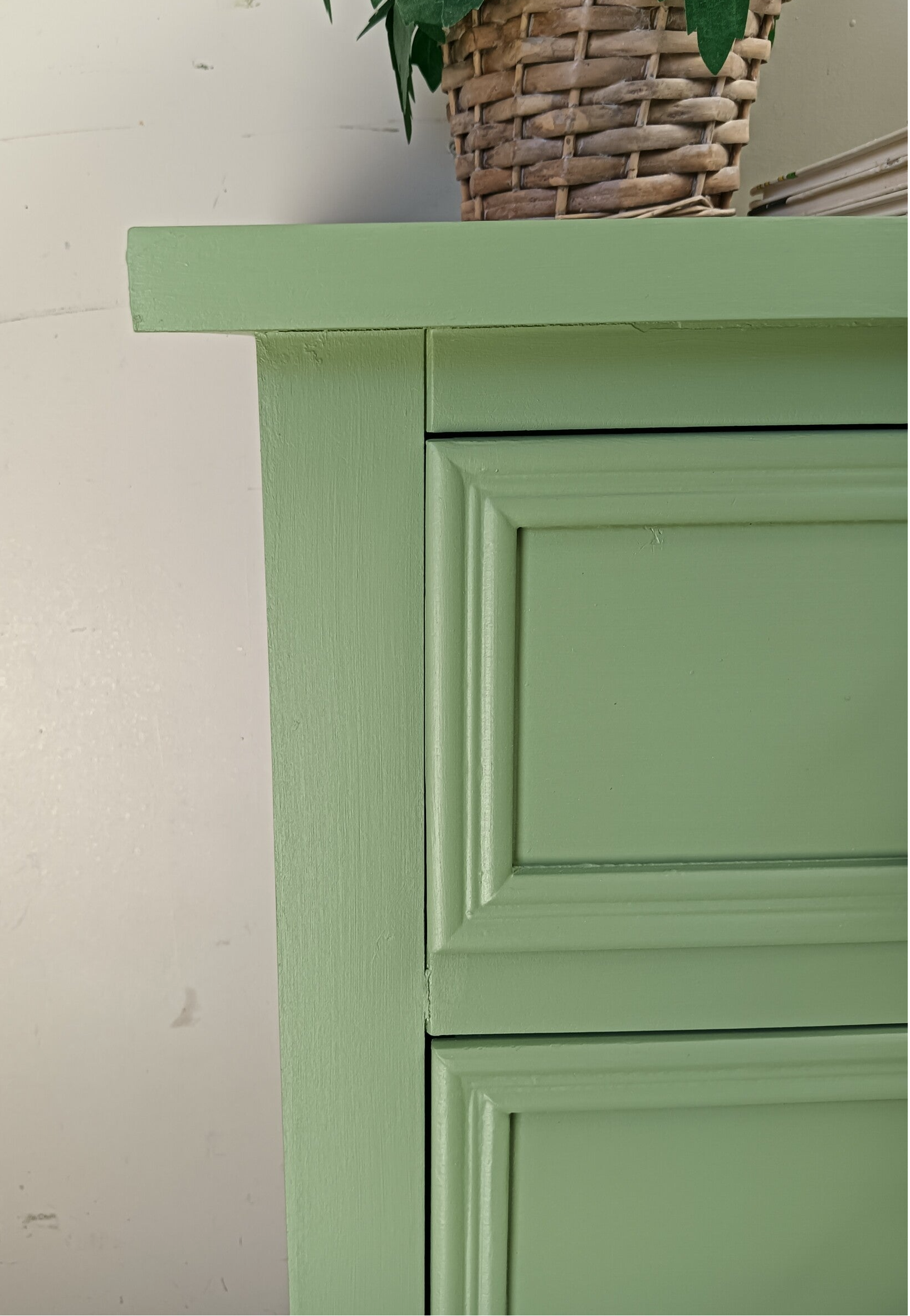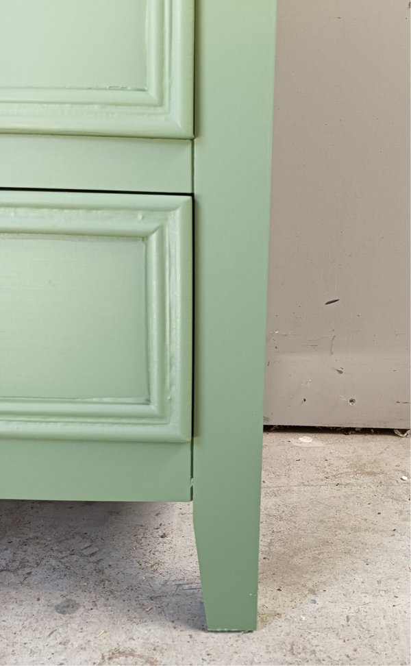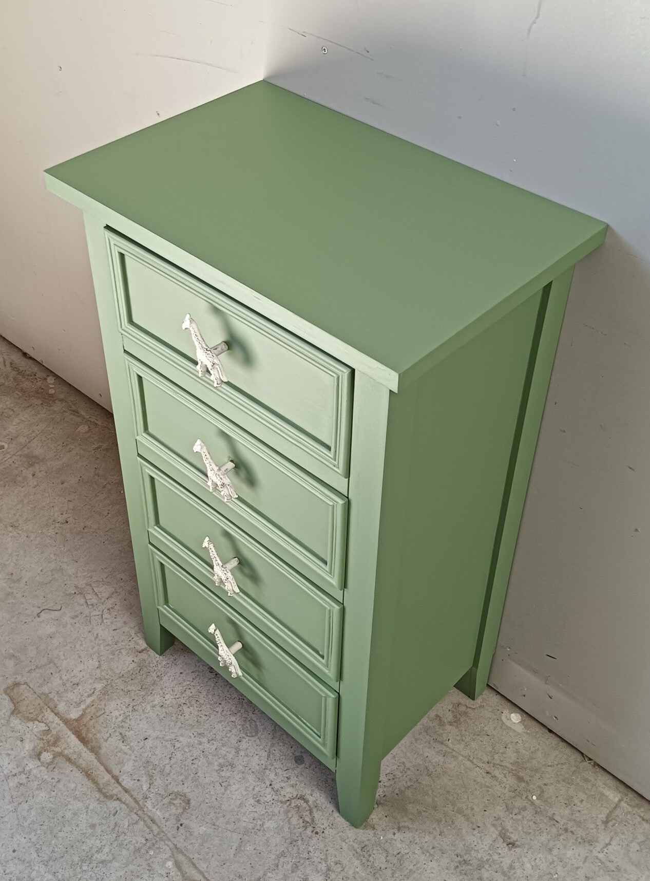 Niet perse een woest oud kastje, maar dat mag de pret niet drukken, want hij is toch wel weer helemaal leuk geworden. Fijne kleur met super leuke giraf knoppen. Ook de binnenzijde van het laatje heeft een desing gekregen. Wat ons betreft helemaal af.