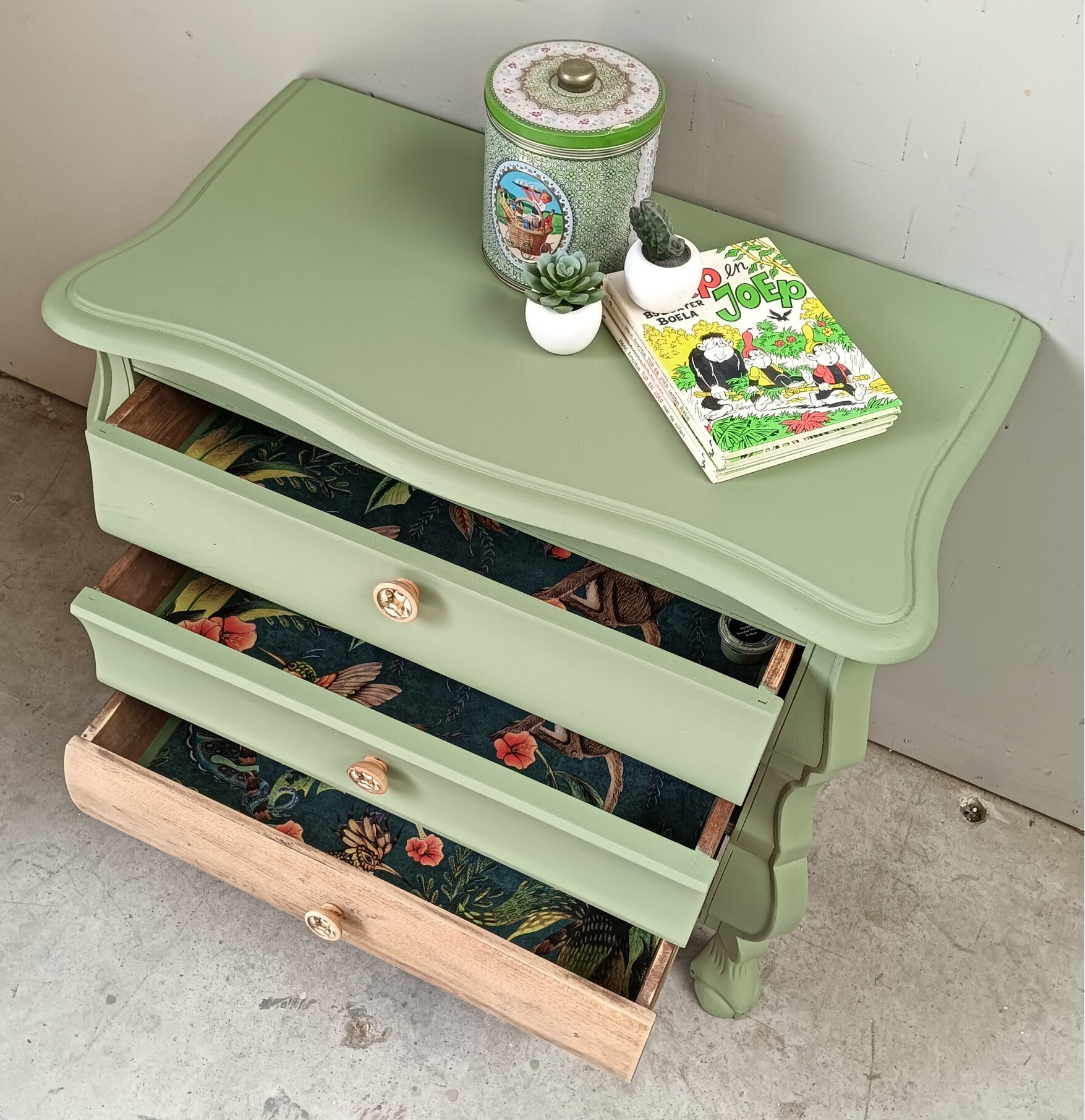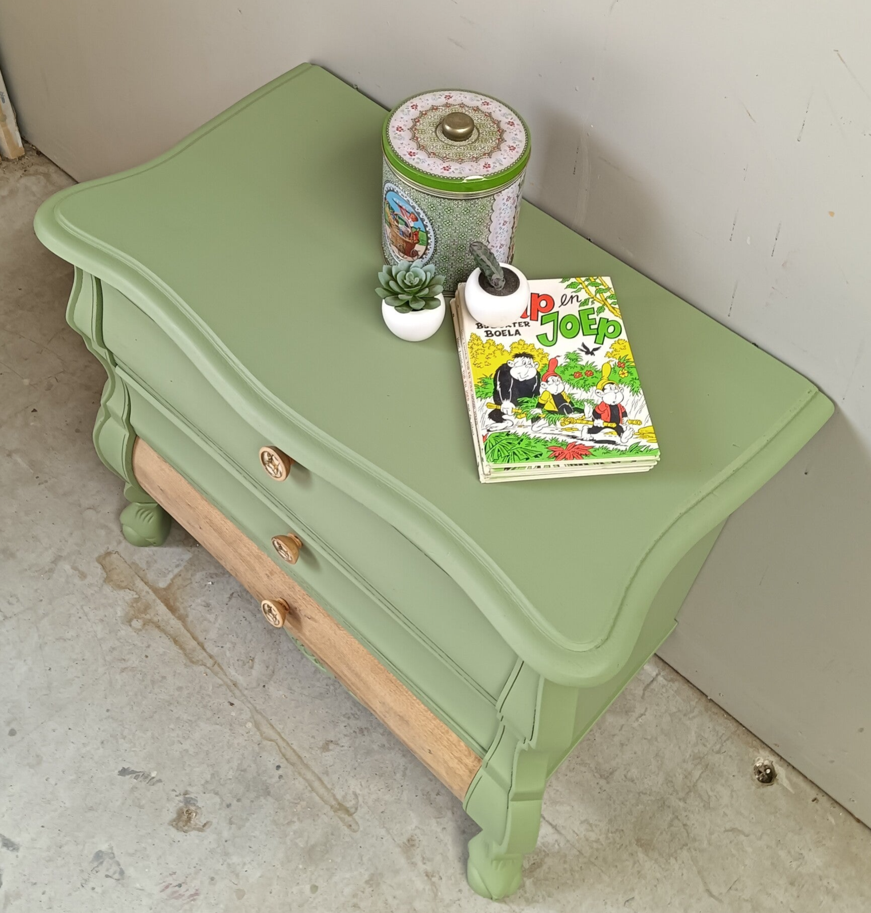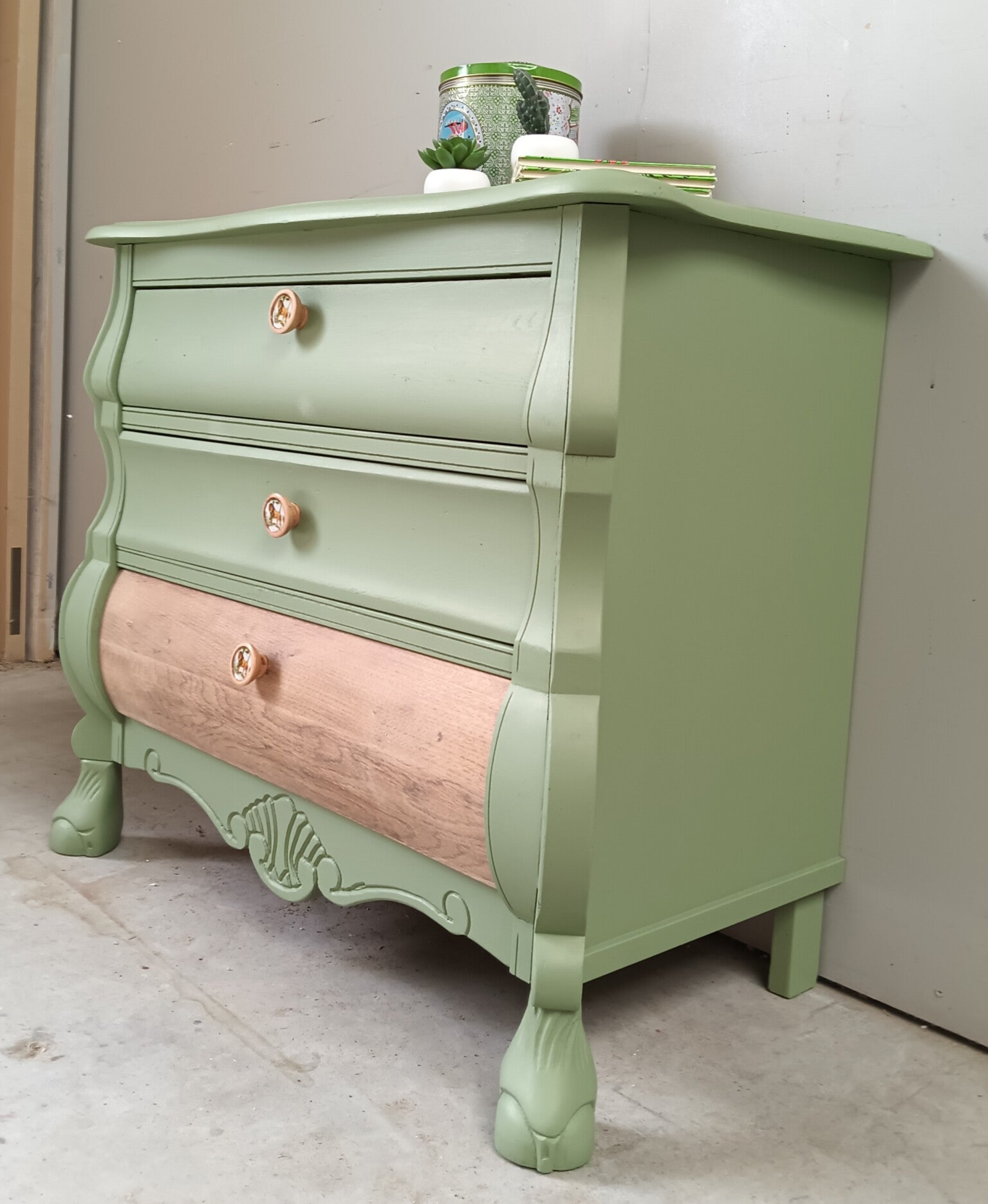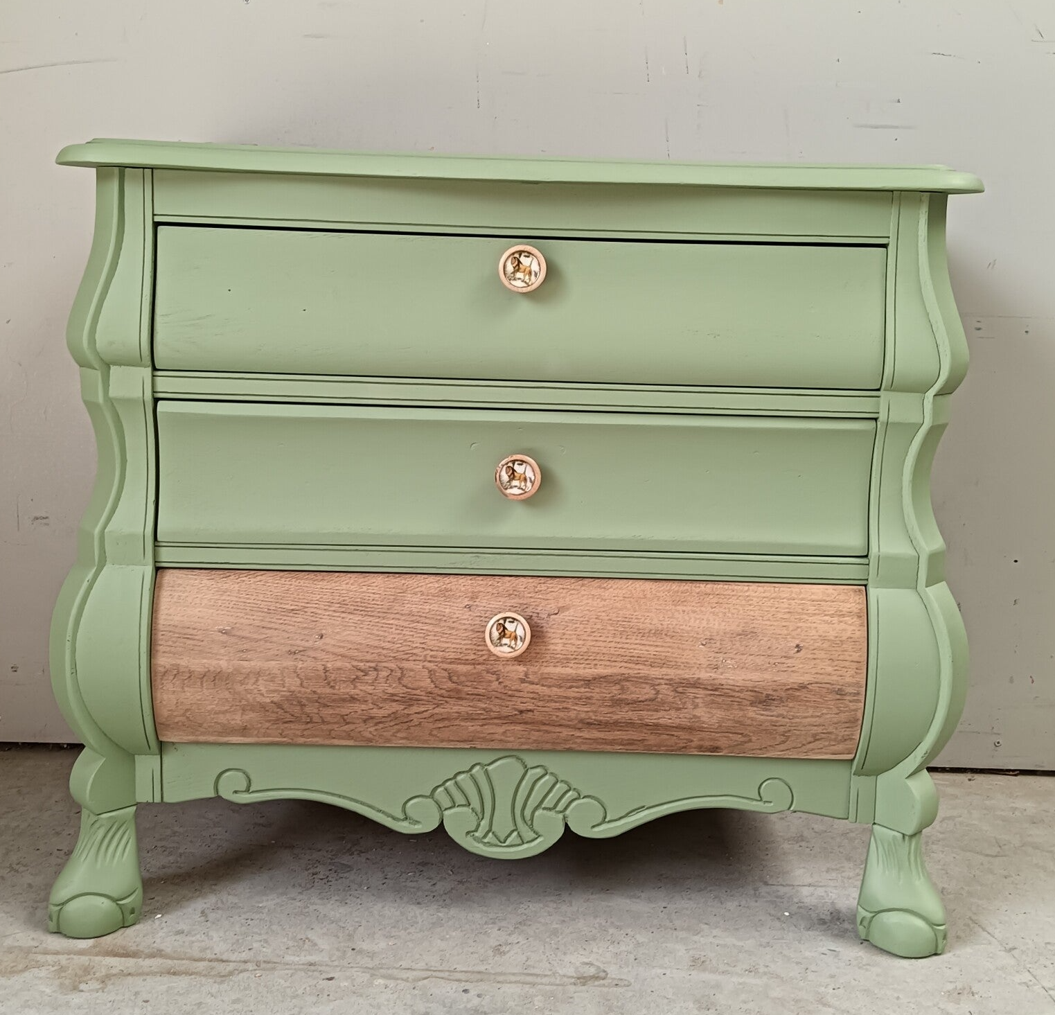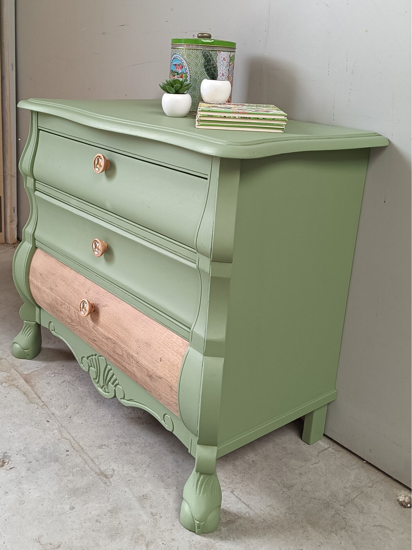 Een heerlijk model dit buikkast. Vrolijk en fris groenkleurtje, te weten Concervatory van Fusion Mineral Paint. De combinatie met de lade in orgineel hout is wat ons betreft een prettige. De toffe knoppen in jungle stijl maken het geheel helemaal af. Lades lopen overigenes goed en ook hebben deze een leuke jungle accent gekregen :-).