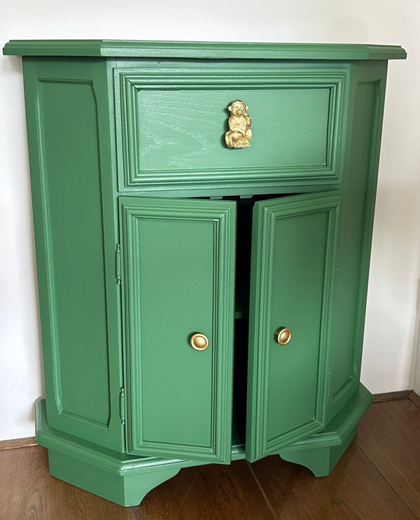Het ideale model voor in de hal, maar ook voor in een wat kleinere slaapkamer of woonkamer of.....nou genoeg plekjes waar dit leuke "zogenaamde" halkastje kan shinen. De kleur is een mooie groen tint, te weten Park Bench van Fusion Mineral Paint. Wat een heerlijk warm en rustig geheel geeft aan dit kastje. Ooh en wauw, heb je die waanzinnige knop op de lade gezien?? Die past er wat ons betreft helemaal bij. Al met al een mooi en praktisch kastje met veel potentie / mogelijkheden.