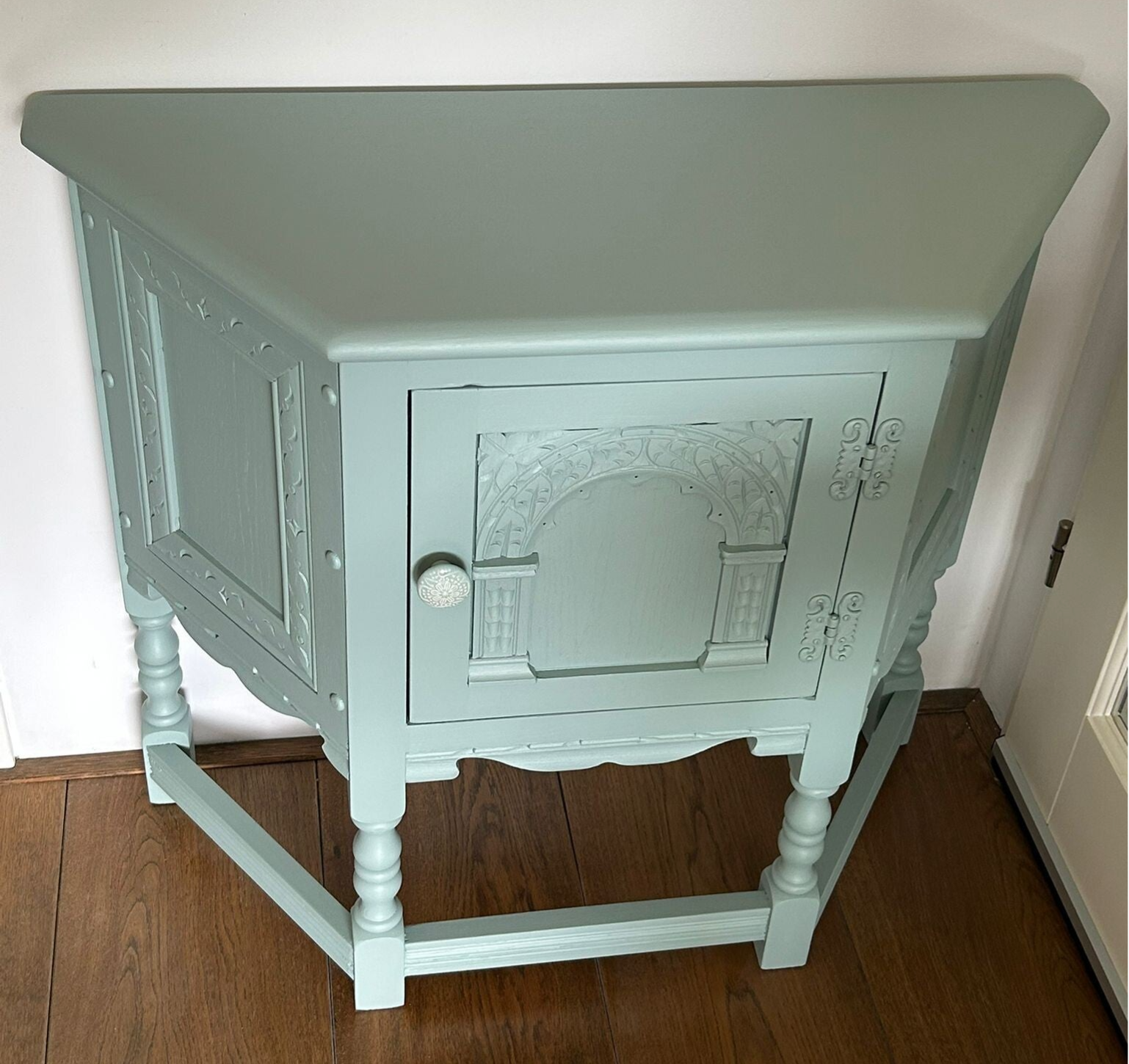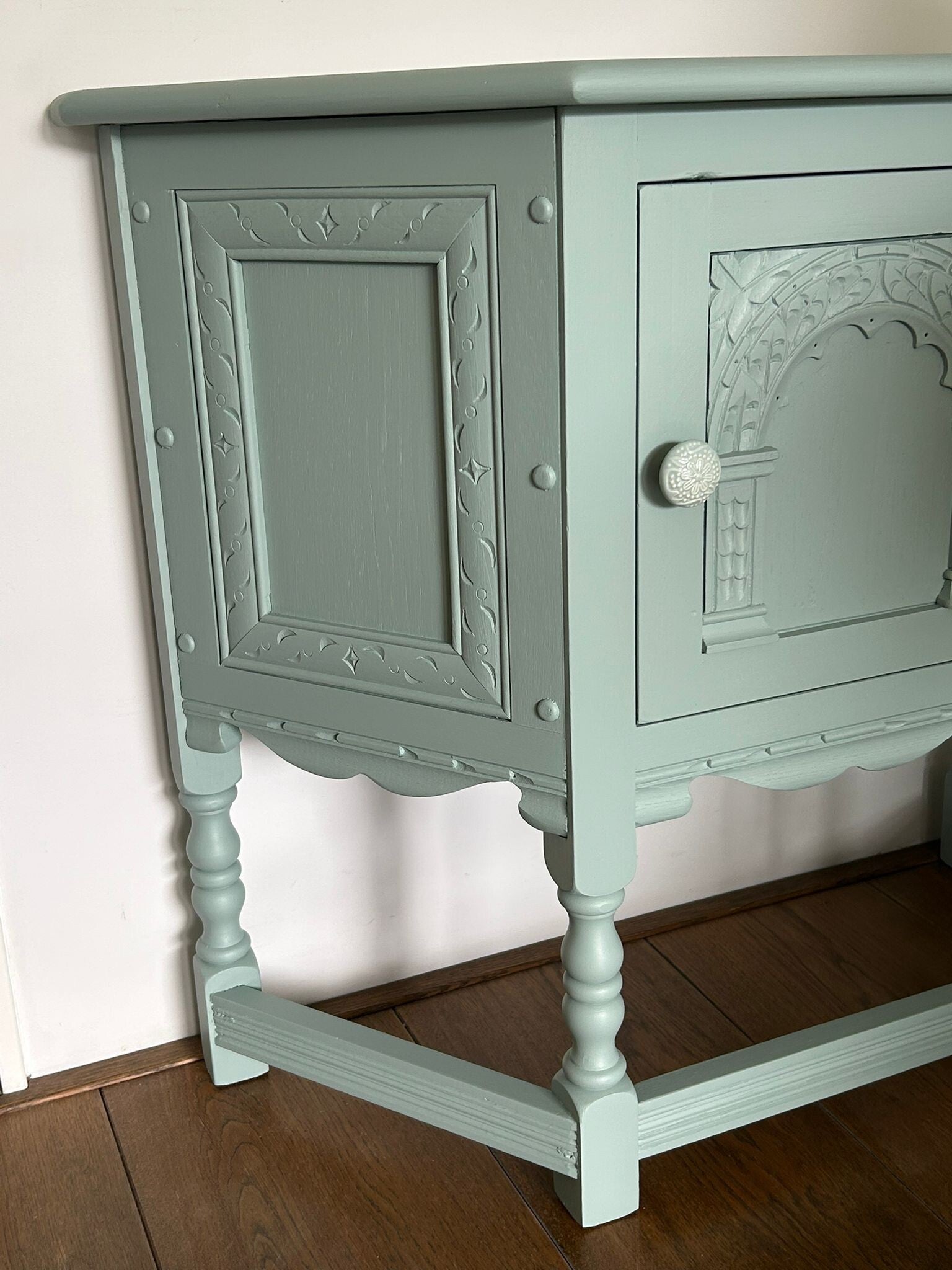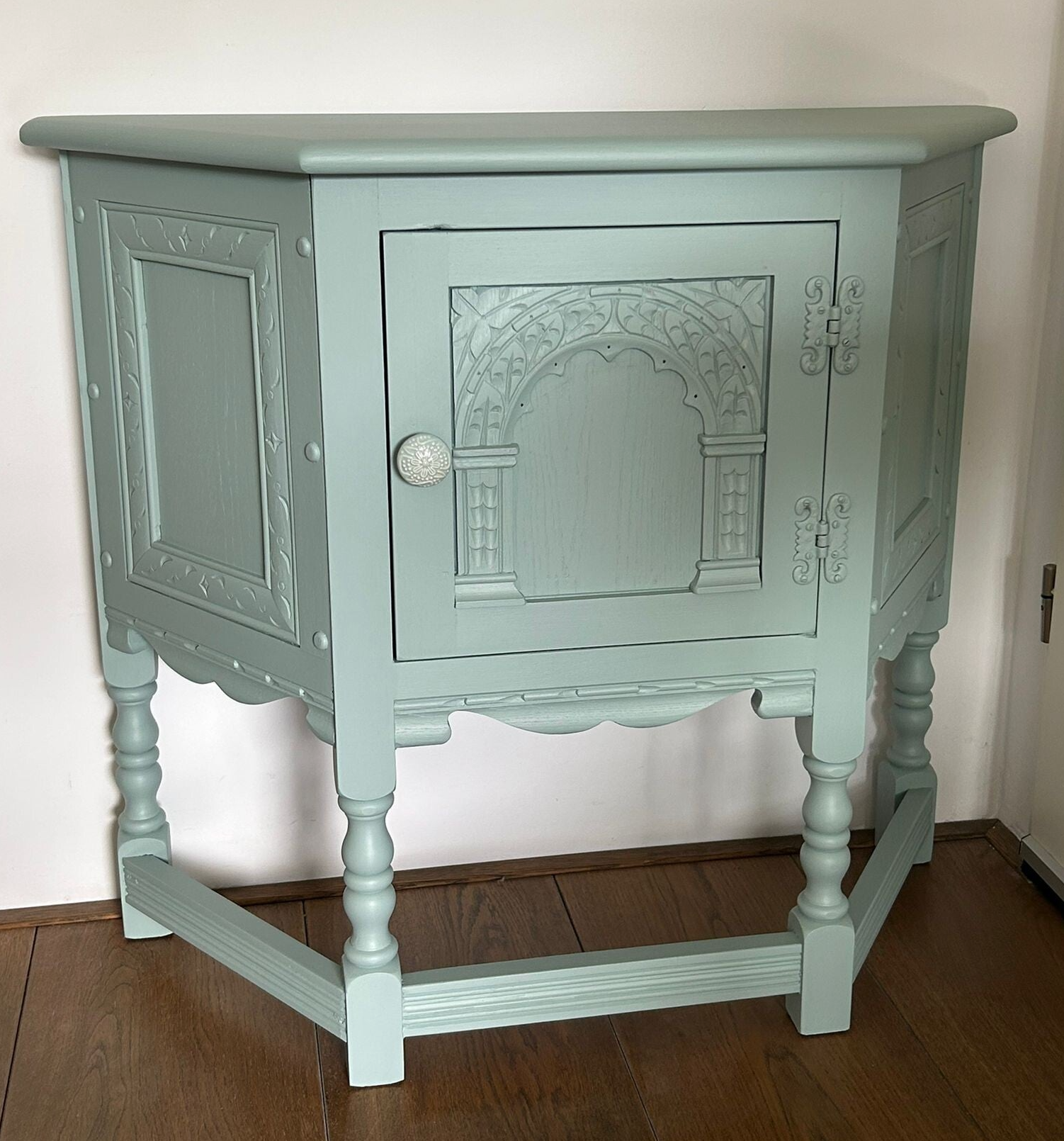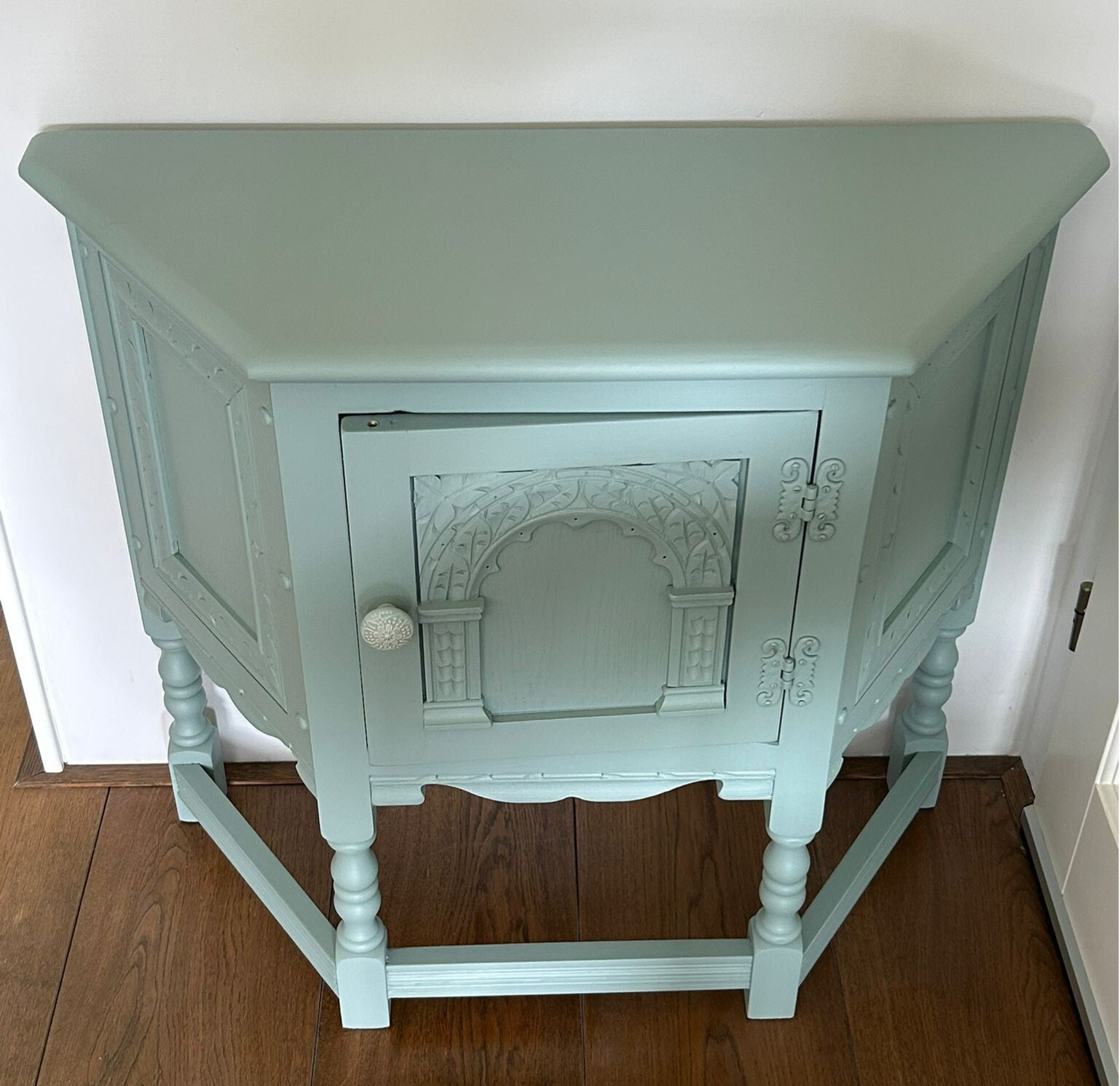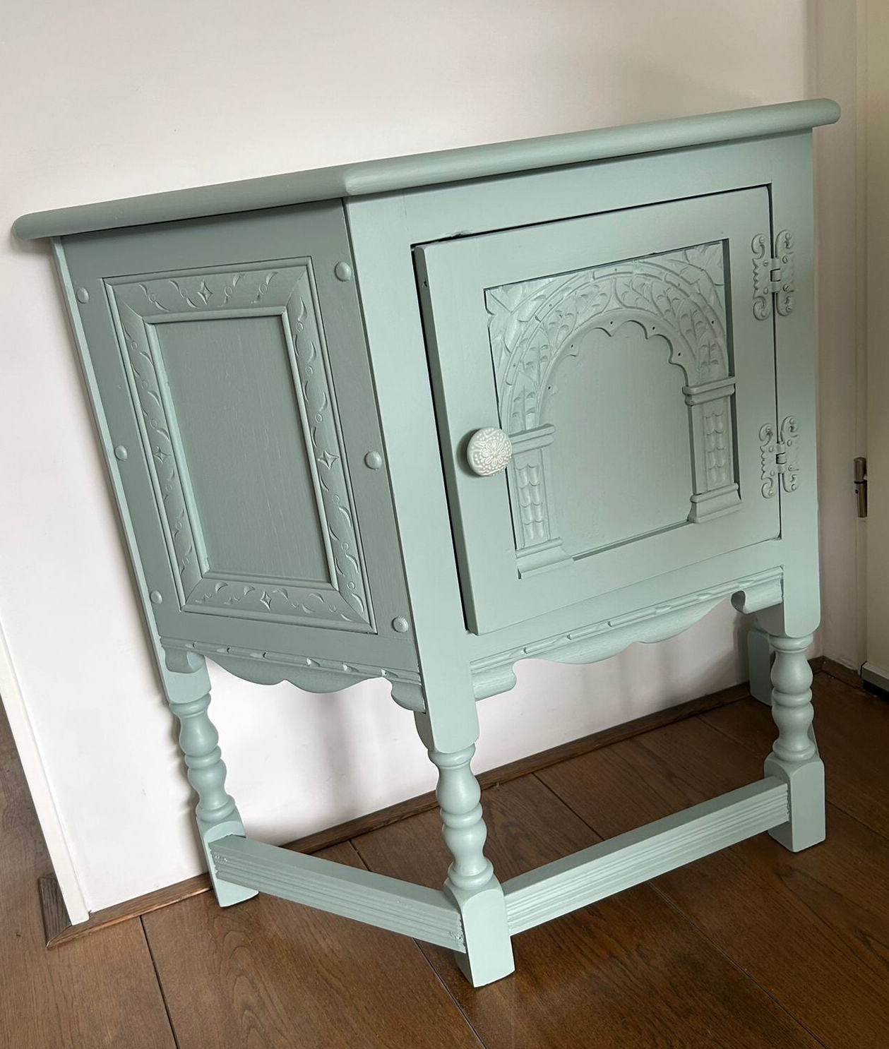 Een aparteling, wat natuurlijk mede komt door de vormgeving. Maar dit maakt haar juist zo leuk en bijzonder. Het mooi houtsnijwerk, de aflopende hoeken, de subtiele belijning aan de zijkant.... al met al een plaatje om te zien. De kleur French Eggshell, van Fusion Mineral Paint is een mooie rustige kleur wat enigszins blauw /grijzig is, maar in bepaald licht ook ergens een groene ondertoon heeft. Wat ons betreft een kleur die al snel bij andere kleuren past. Dit kastje kan natuurlijk ook super leuk asl TV kastje, of in een kleine hal of.......roept u maar, waar niet eigenlijk!