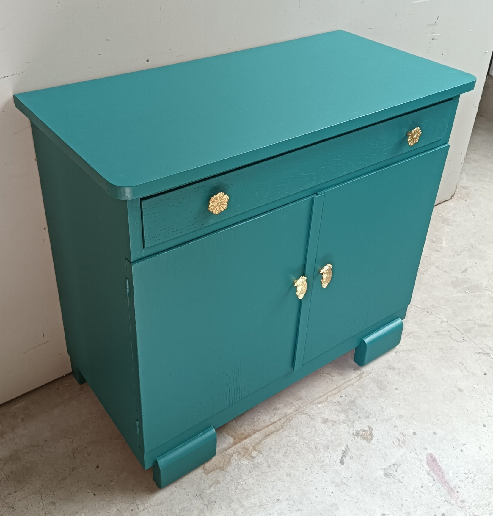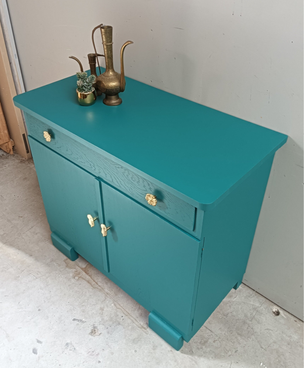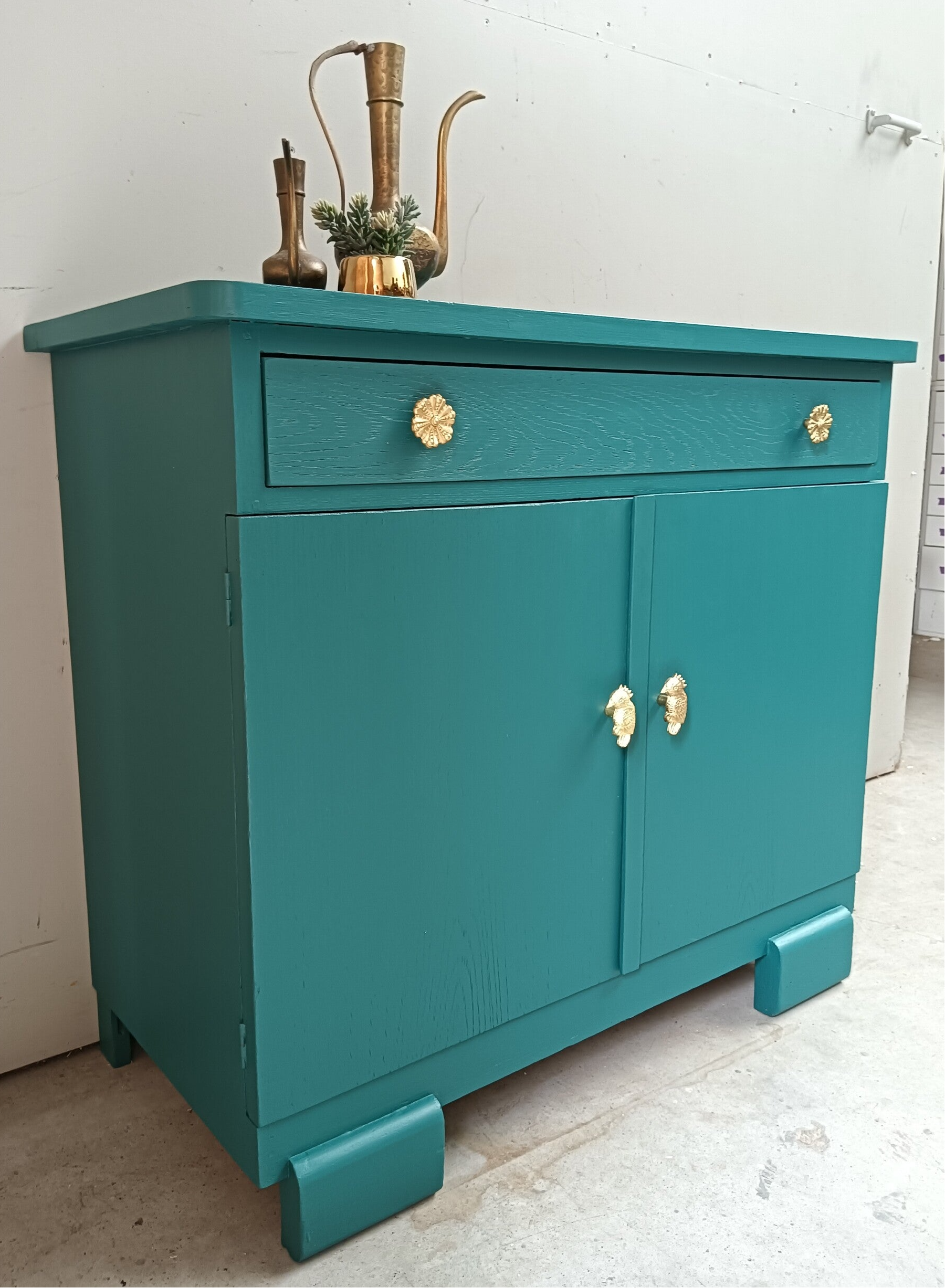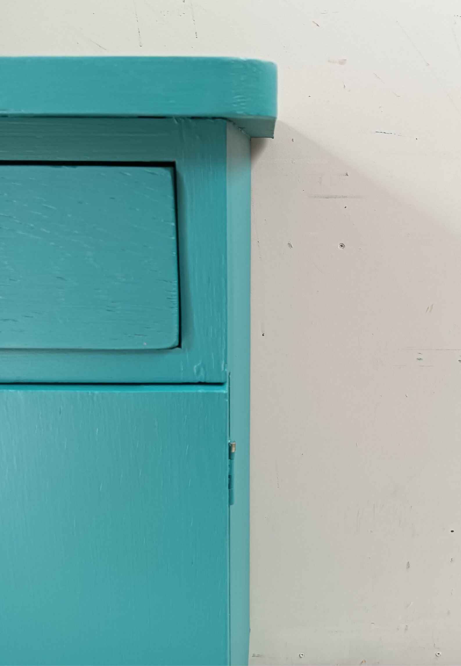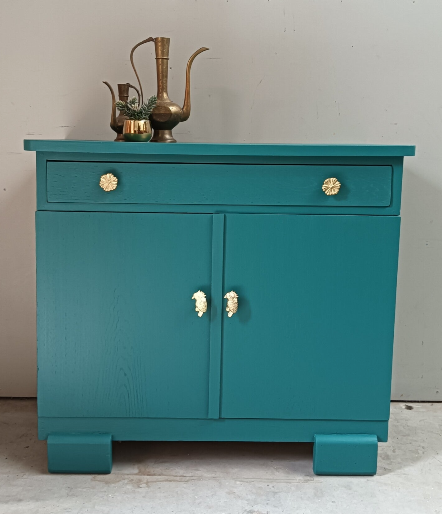 Een oudje dit leuke kastje! Helemaal omgetoverd tot een mooie en in het oogspringend kastje. De kleur, refrew blue is een stoere en frisse kleur van Fusion Mineral Paint en die knoppen.....zeg nou zelf, helemaal te gek toch!??! Kan natuurlijk super goed dienen als dressoir en/of tv kastje. Achter de deurtjes nog een plank, maw...super veel opberg ruimte!