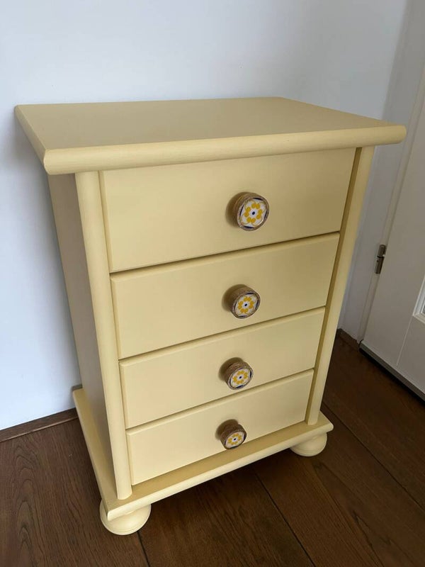 Woest stevig kastje en tegelijker tijd helemaal leuk! Dit ladenkastje heeft de kleur Buttermilk Cream gekregen van Fusion Mineral Paint, een heerlijke warm gele pastel tint. De knopjes van de laatjes, heb je die al gespot, helemaal leuk toch?! Passen er wat ons uitstekend bij en maken het net even specialer.