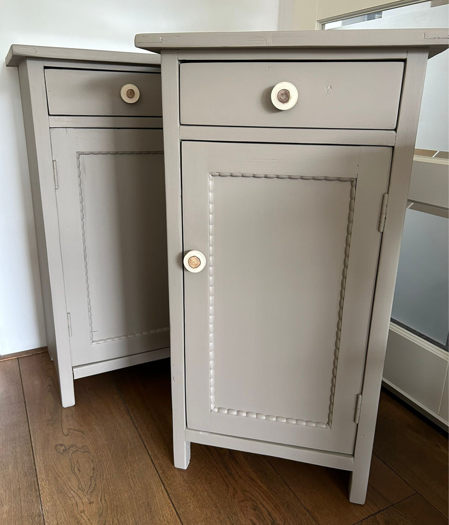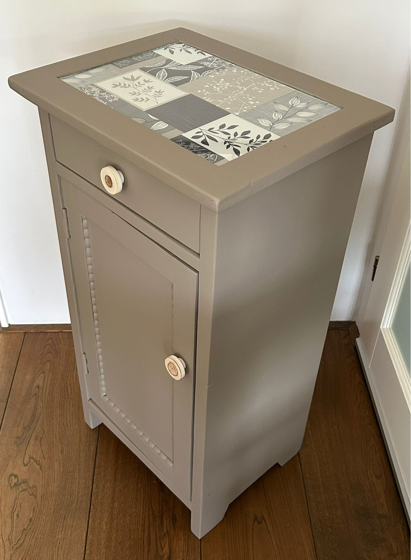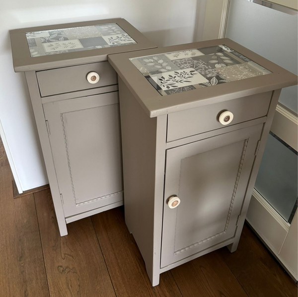 Een prachtige kleur deze warme taupe tint van Fusion Mineral Paint. Deze set nachtkastjes zijn in prima vintage staat en afgewerkt met een super leuke bijpassende knop op zowel deurtje als lade. Onder het glasplaatje hebben we een bijpassend desing geplaatst. Vind je dit nu niets, of je wilt wat anders.....geen probleem het is simpel te verwijderen dmv het glasplaatje te liften!