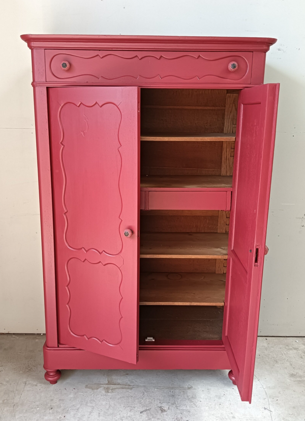 De kleur is een mooie diep rode tint, te weten Cranberry, van Fusion Mineral Paint, wat het tot een echte eyecather maakt. Heerlijk wat planken in de kast en twee lades en bovenop ook nog een ruime lade. Nou....genoeg opberg ruimte wat ons betreft. En wat dacht je van de bijpassende porseleinen knoppen op deuren en lade? Helemaal leuk toch!