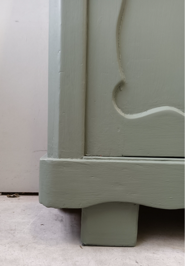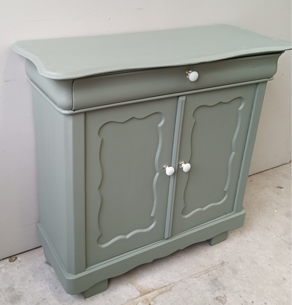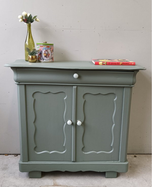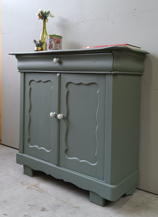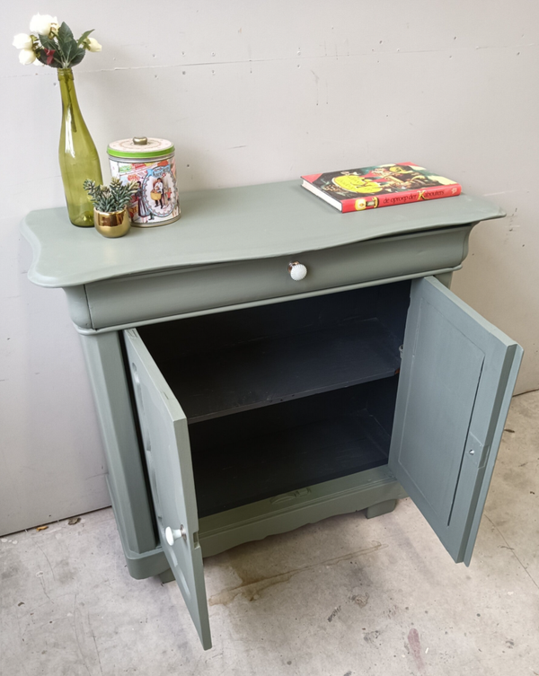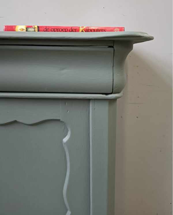 Wauw, wat een knapperd deze Biedermeijer Meidenkast. De vormgeving, het houtsnijwerk....echt met aandacht gemaakt! Ze staat in de mooie lagune groene kleur Carriage House van Fusion Mineralpaint. De kast kan goed dienen als dressoir, maar ook als commode