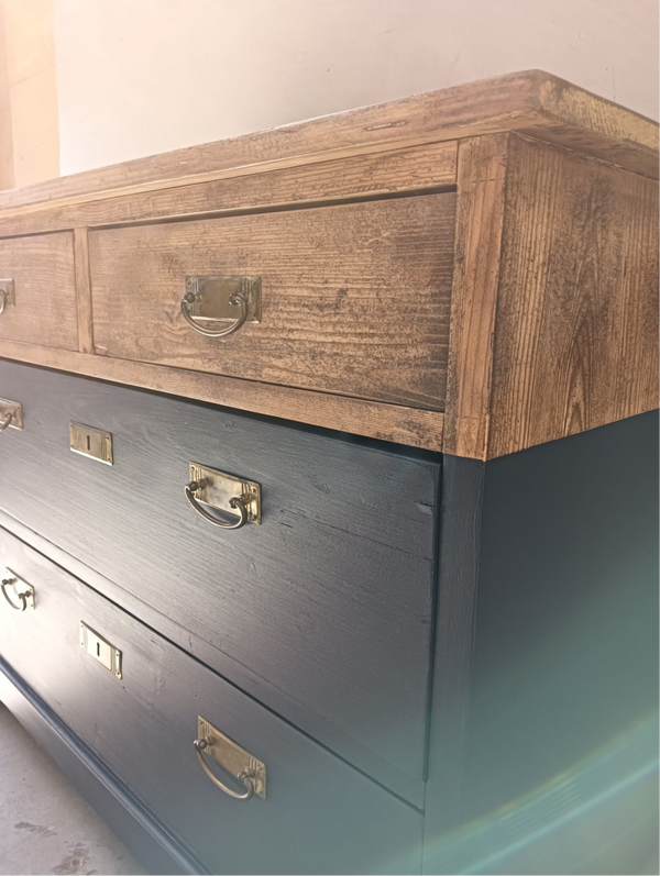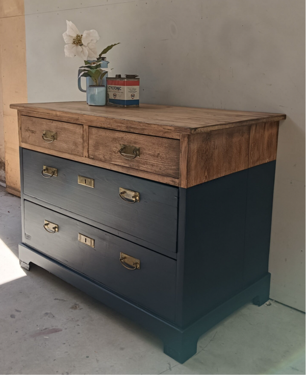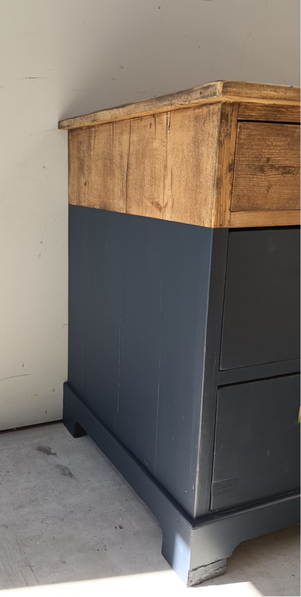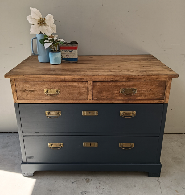 Een oudje deze leuke laden kast! Helemaal omgetoverd tot een mooie en in het oogspringende kast. De kleur, Midnight Blue is een intens diepe kleur blauw van Fusion Mineral Paint en dat orginele beslag.....zeg nou zelf, helemaal te gek toch!??! De combinatie met het houten blad, welke is afgewerkt met een cappucino stain and finisch oil,, de kleur en het orginele beslag is wat ons betreft een heerlijk samenkomen. Deze kanjer kan natuurlijk super goed dienen als dressoir en/of tv meubel.