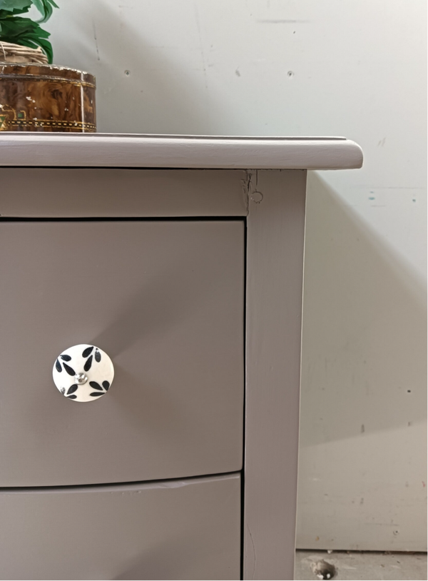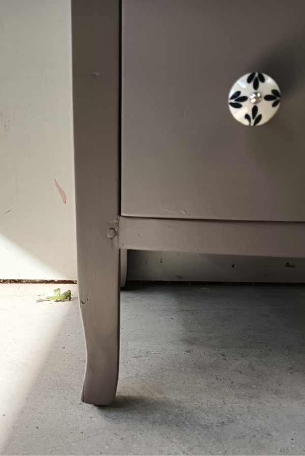 Een zeer solide en mooi model ladenkastje. De kleur Algonquin van Fusion Mineral Paint is hier gebruikt. Dit een mooi en warme taupe tint, met dit als super fijn resultaat. Mooie bijpassende porseleinen knopjes mochten niet ontbreken, dit maakt het geheel helemaal af.