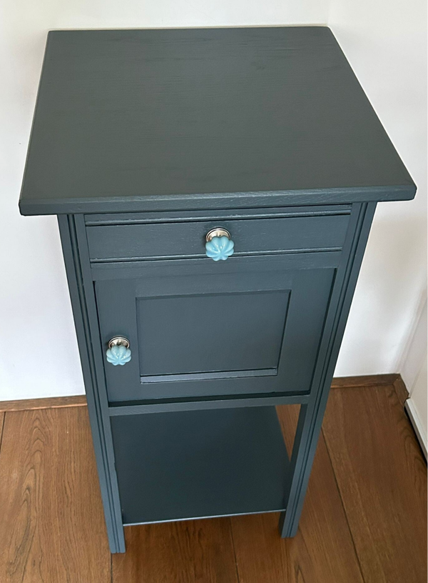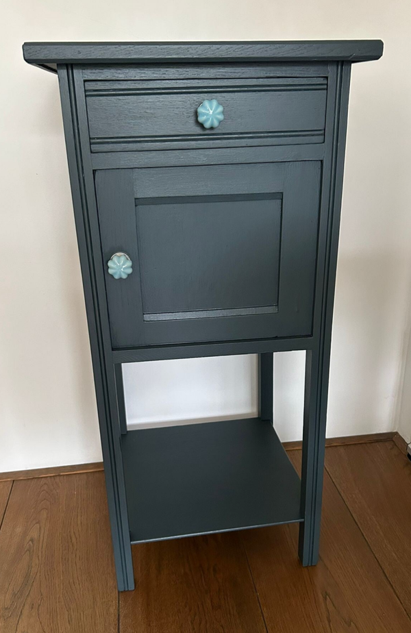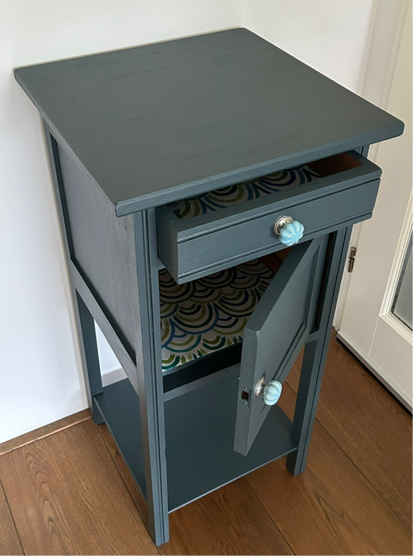 Rechtstreek uit Frankrijk, dit mooie wandkastje. Uiteraard goed te gebruiken als nachtkastje, maar ook super gaaf met een mooie plant er op! De kleur Cambridge van Fusion Mineral Paint die we gebruikt hebben is een mooie blauw tint, met enigszins een grijze ondertoon inzich De leuke knopjes op het deurtje en laatje passen hier vervolgens ook weer prima bij. Achter het deurtje heeft de binnenzijde ook nog een leuk desing gekregen.