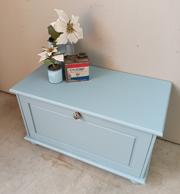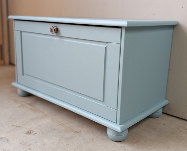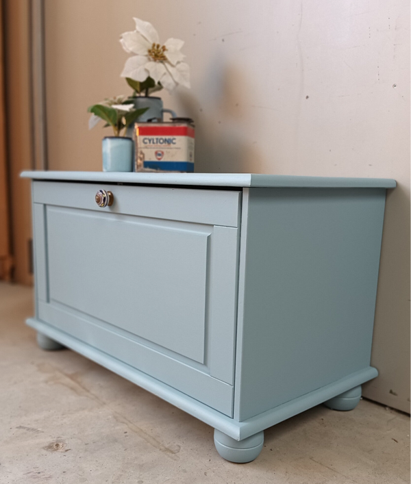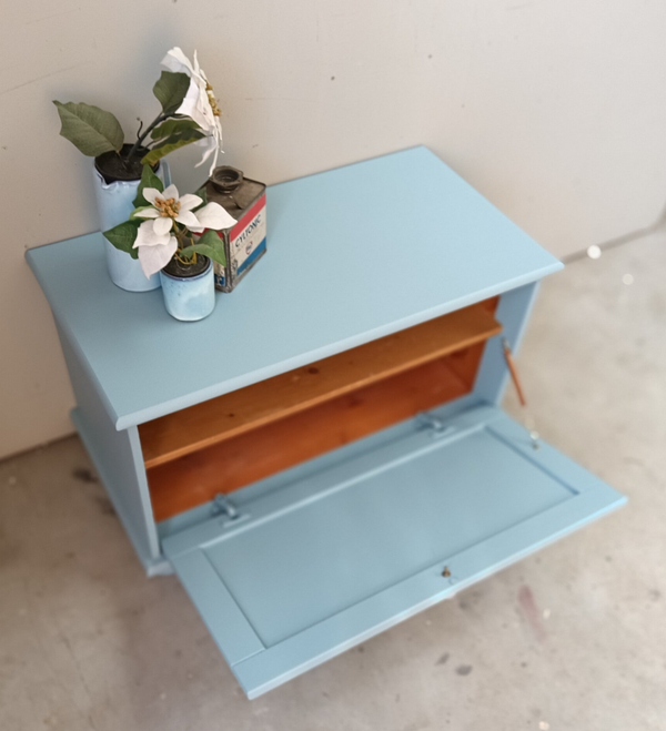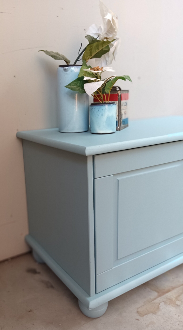 Handig en praktisch, deze klep kist /kast. Ideaal voor je spelcomputer, of je tv kastjes ect. En naast dat dit natuurlijk super handig is, is deze kist/kast ook gewoon helemaal leuk. De kleur Champness van Fusion Mineral Paint is hier gebruikt, een frisse en vrolijke blauw tint. Een mooi knop mocht uiteraard niet ontbreken, maakt het geheel helemaal af.