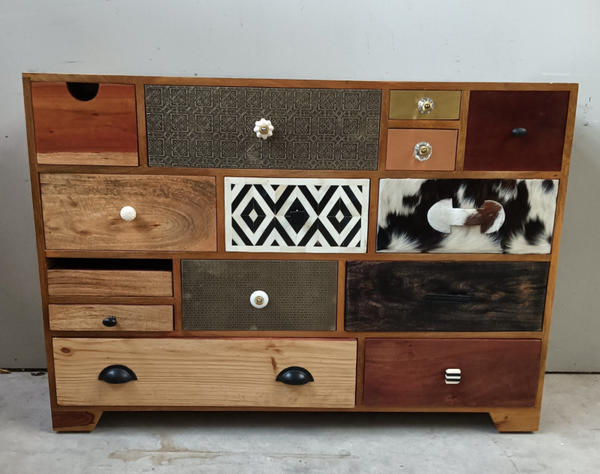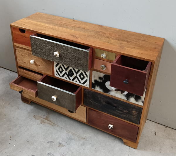 Een kanjer van een kast, massief kwaliteits hout! Maw, niet eentje die je zomaar omver loopt! En hoe gaaf zijn al die verschillende designs op de lades. Allemaal hun eigen uitstraling, maar toch een geheel. Werkelijk een prachtige kast die als een echte eyecather kan dienen. Tof als tv meubel, dressoir of....in de hal, nou ja volop kansen voor deze kanjer.