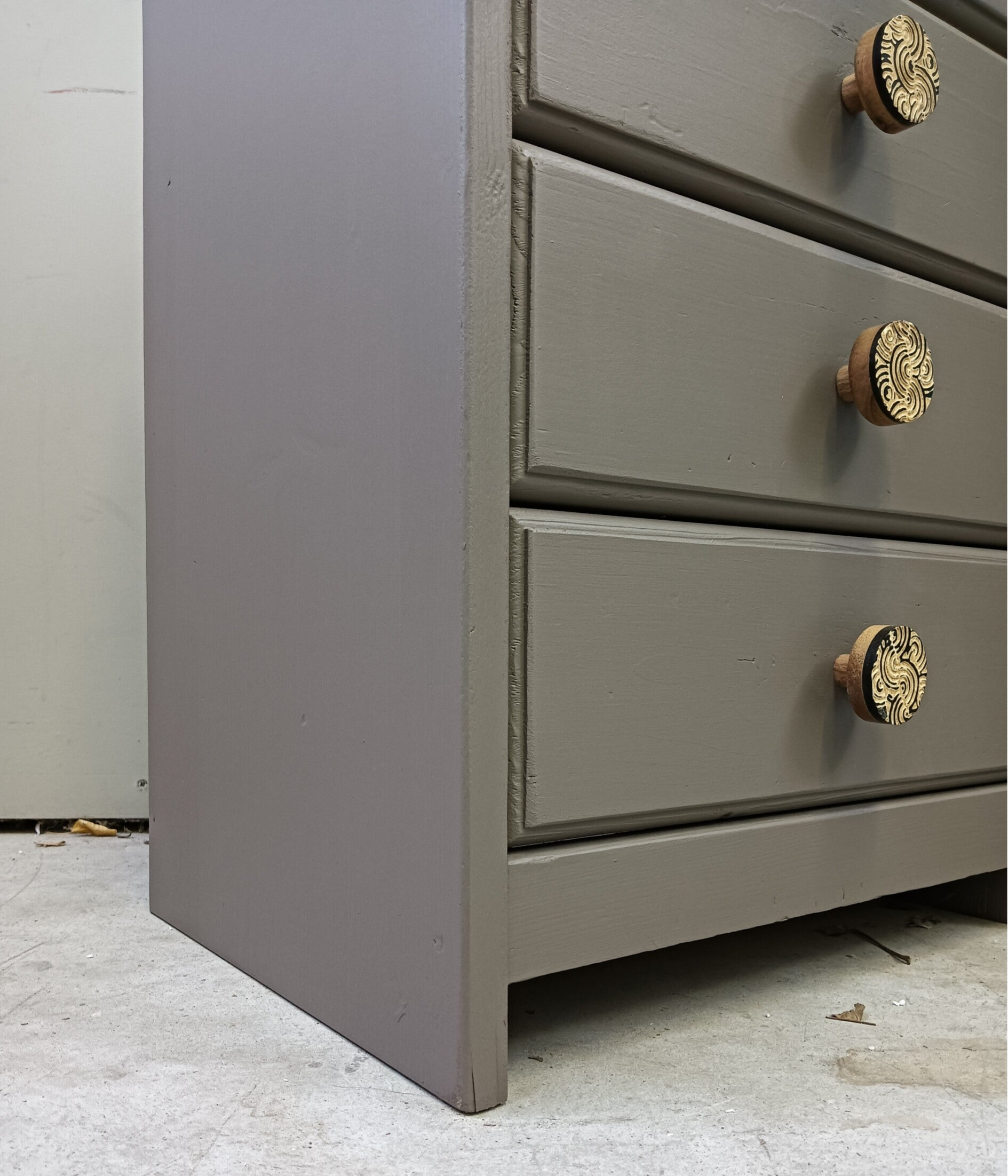 Een prachtige kleur deze warme donkere taupe tint van Fusion Mineral Paint. Deze set nachtkastjes zijn zeker nog in prima staat en afgewerkt met een super leuke bijpassende knoppen op de laatjes die overigens prima lopen en sluiten