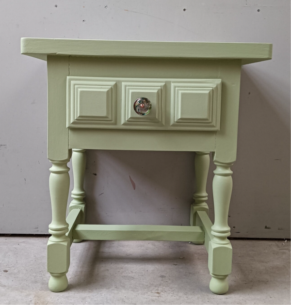 Een dot van een kastje met een enigszins spaanse uitstraling. Dat maakt het net even anders als anders. De kleur Upper Canada van Fusion Mineral Paint is hier gebruikt en is het beste te omschrijven als een frisse groen tint. Het laatje heeft een waanzinnig toffe knop gekregen en ook de binnenzijde van de lade heeft aandacht gekregen. Want ons betreft helemaal leuk en mooi geworden.
