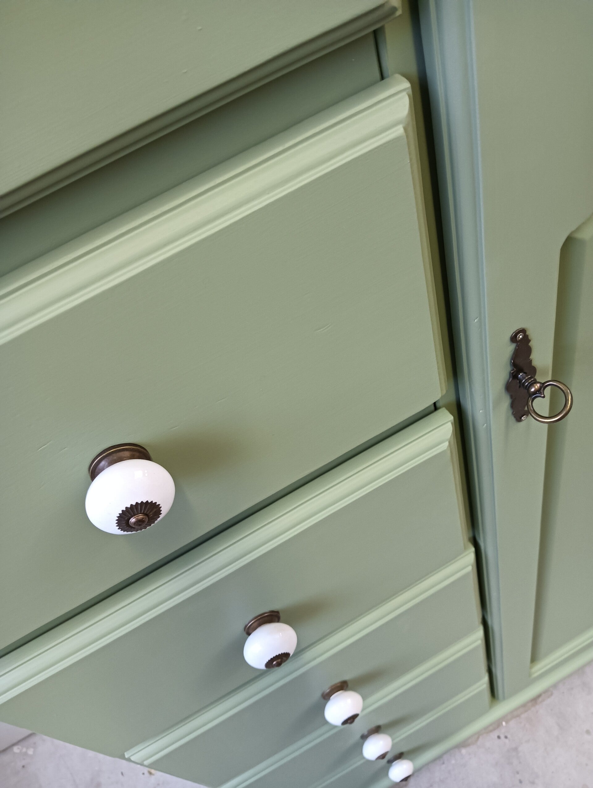 Een kanjer van een kast is dit geworden. Prachtig model, heerlijk wat lades, ook nog een deur met daar achter planken....zie je hem al shinen in je keuken, woonkamer, slaapkamer of op de babykamer?? De kleur Conservatory van Fusion Mineral Paint is hier gebruikt, een mooie rustige groen tint, wat als snel overal bij past. De binnenzijde van heeft ook de nodige aandacht gehad en heeft een bijpassend design gekregen. Ook mochten de mooie porseleinen knoppen op de lades niet ontbreken. Al met al een echte knapperd geworden!