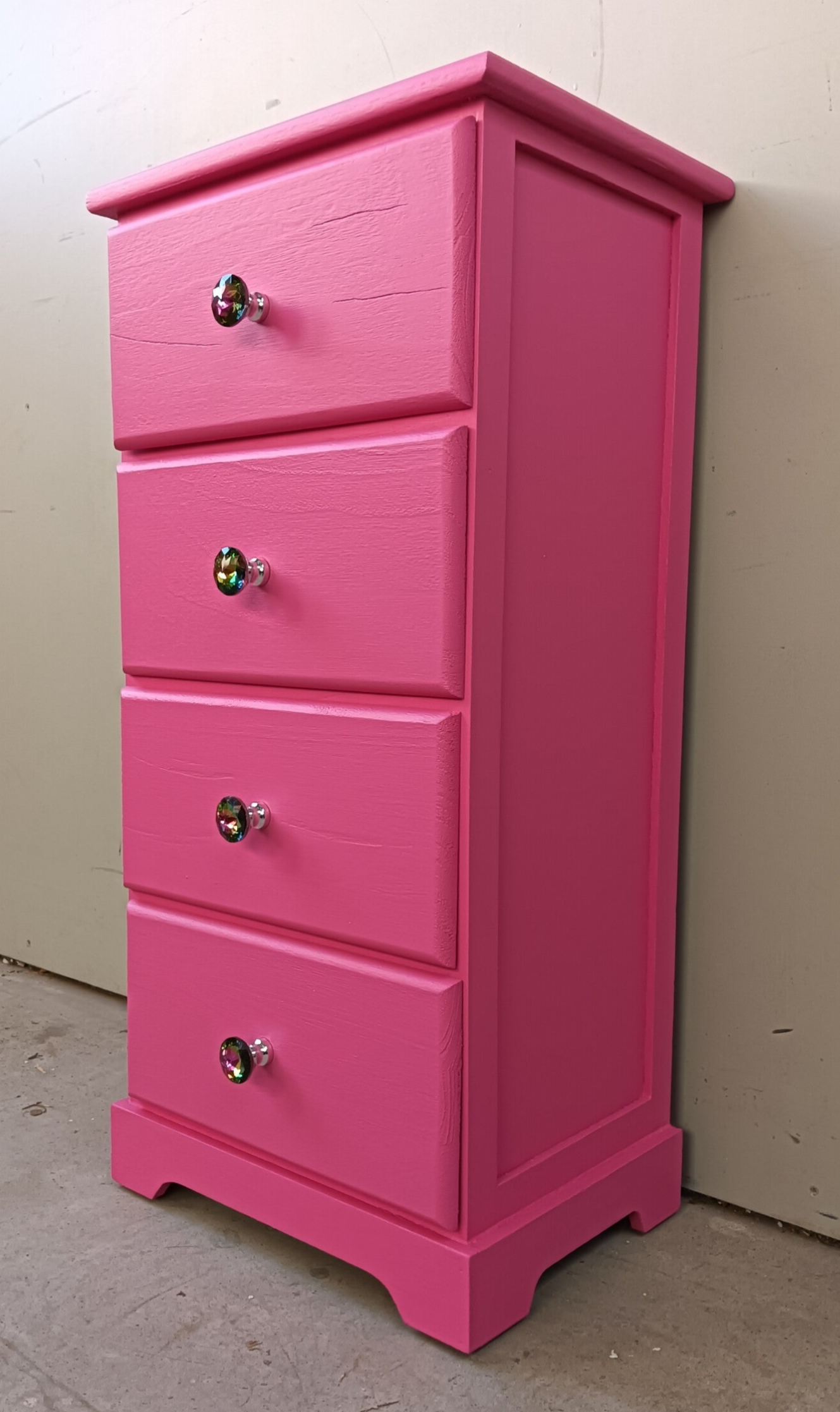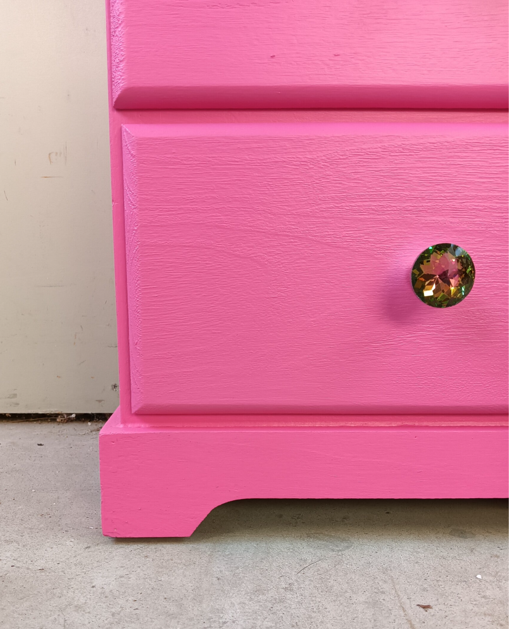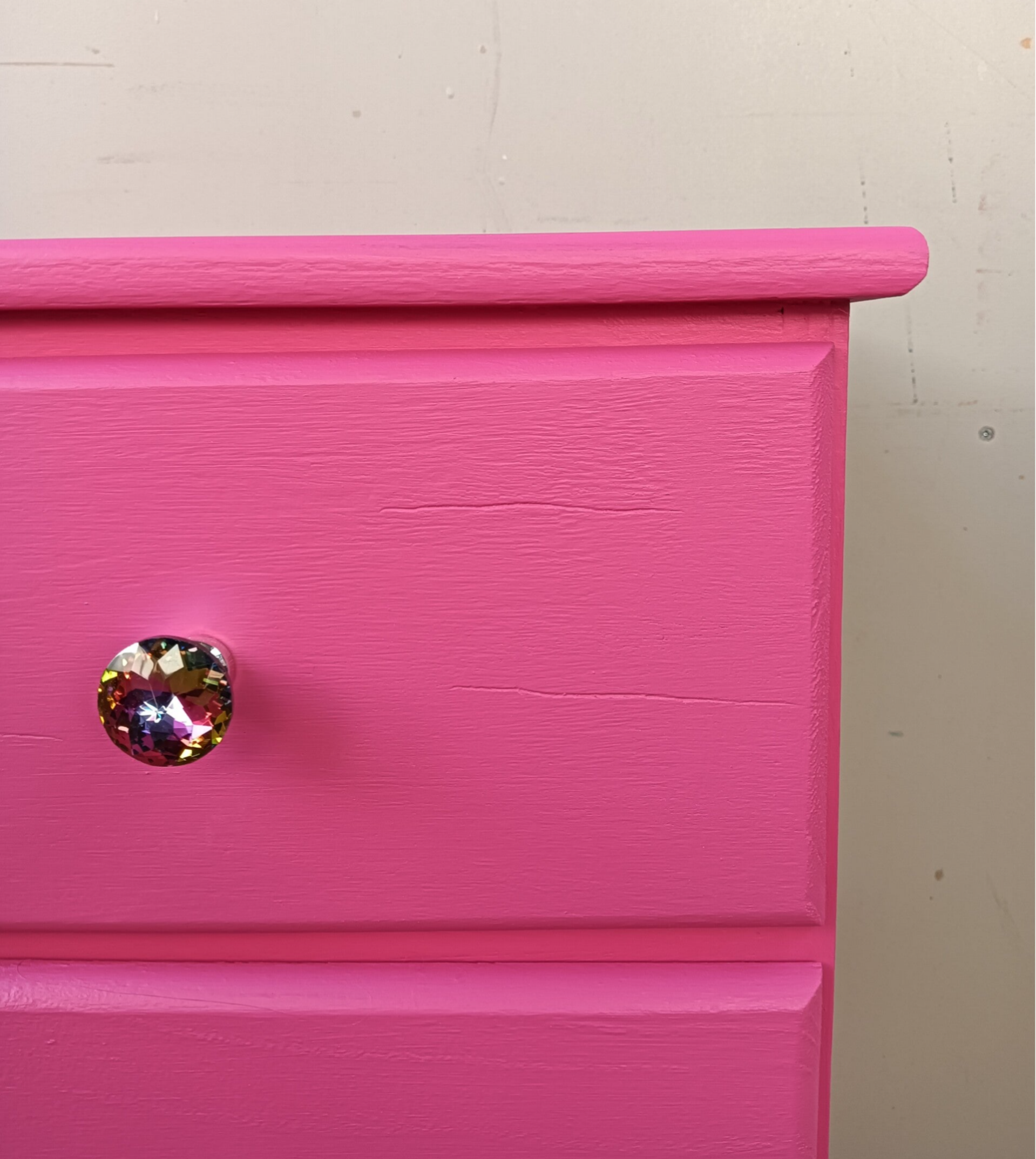 Heerlijk en vrolijk Roze, oftewel Curiously Pink van Fusion Mineral Paint. En wat dacht je van de perfect bijpassende knopjes op de lades, helemaal leuk toch. De laatjes geven een hoop opbergruimte en lopen prima. Niet perse een oud en zwaar kastje, maar wel helemaal leuk zo, toch?!