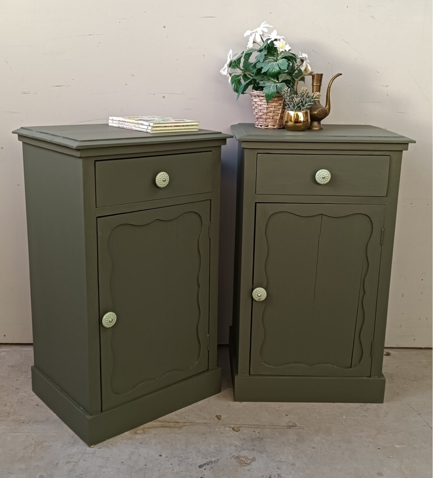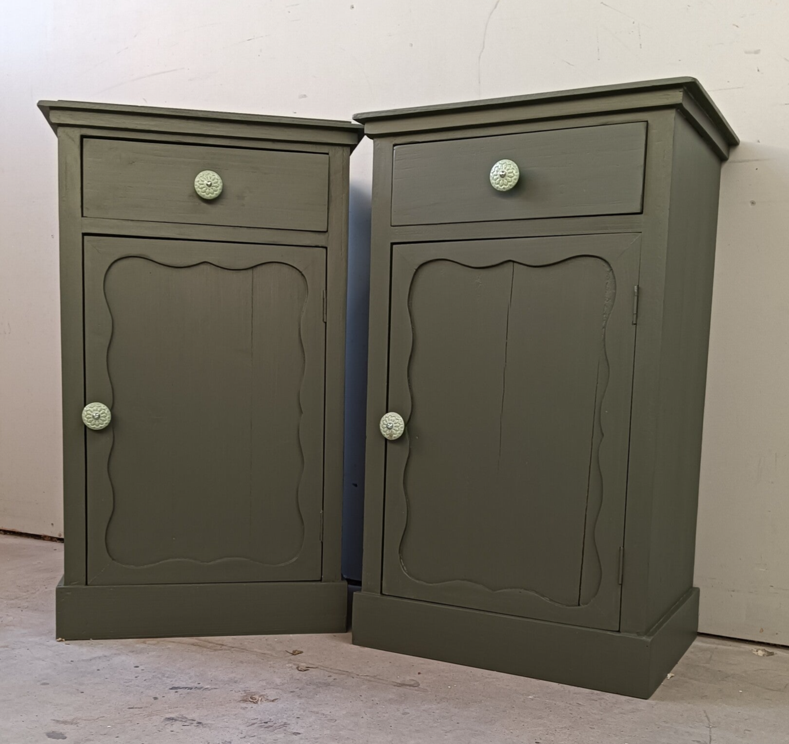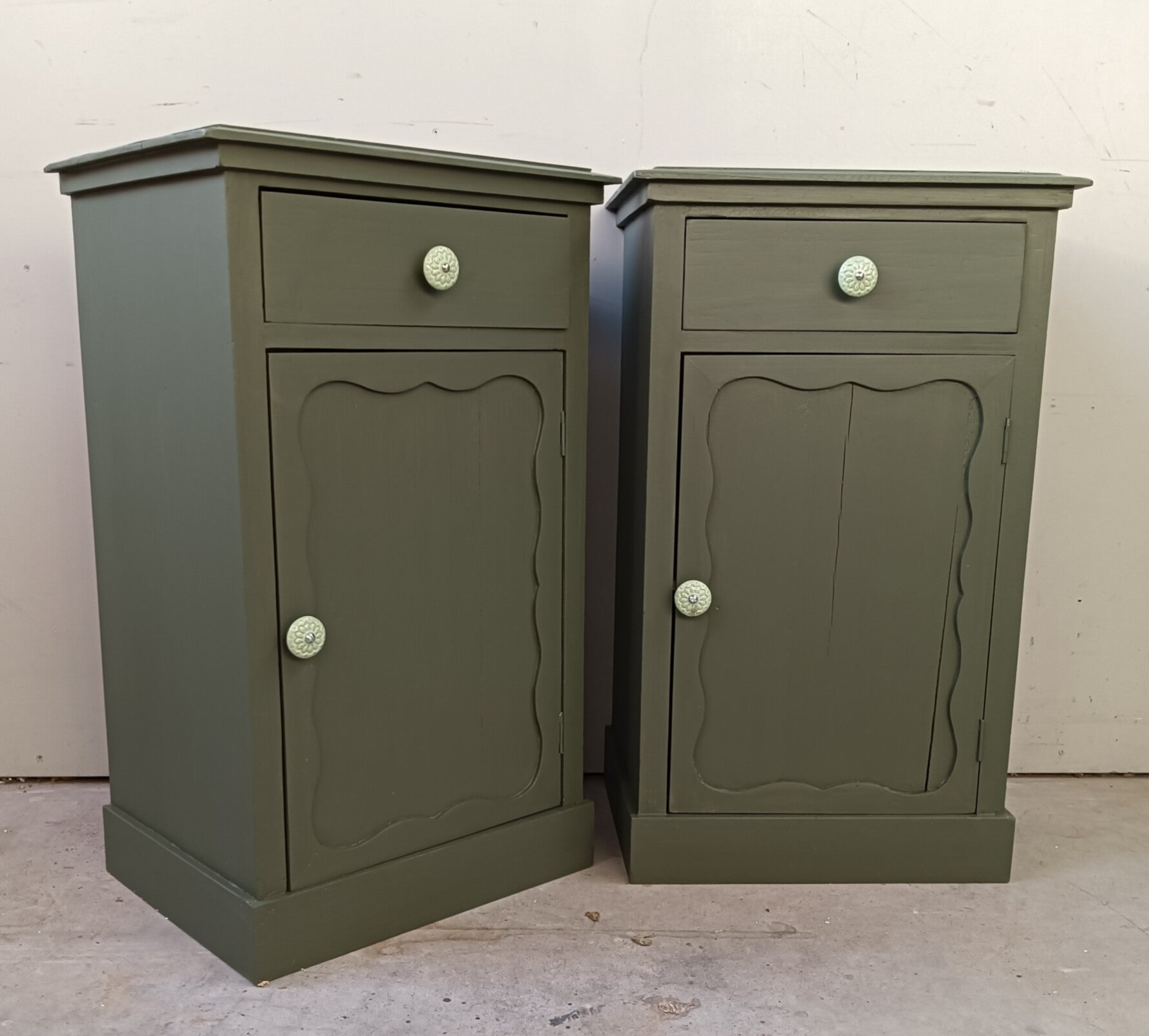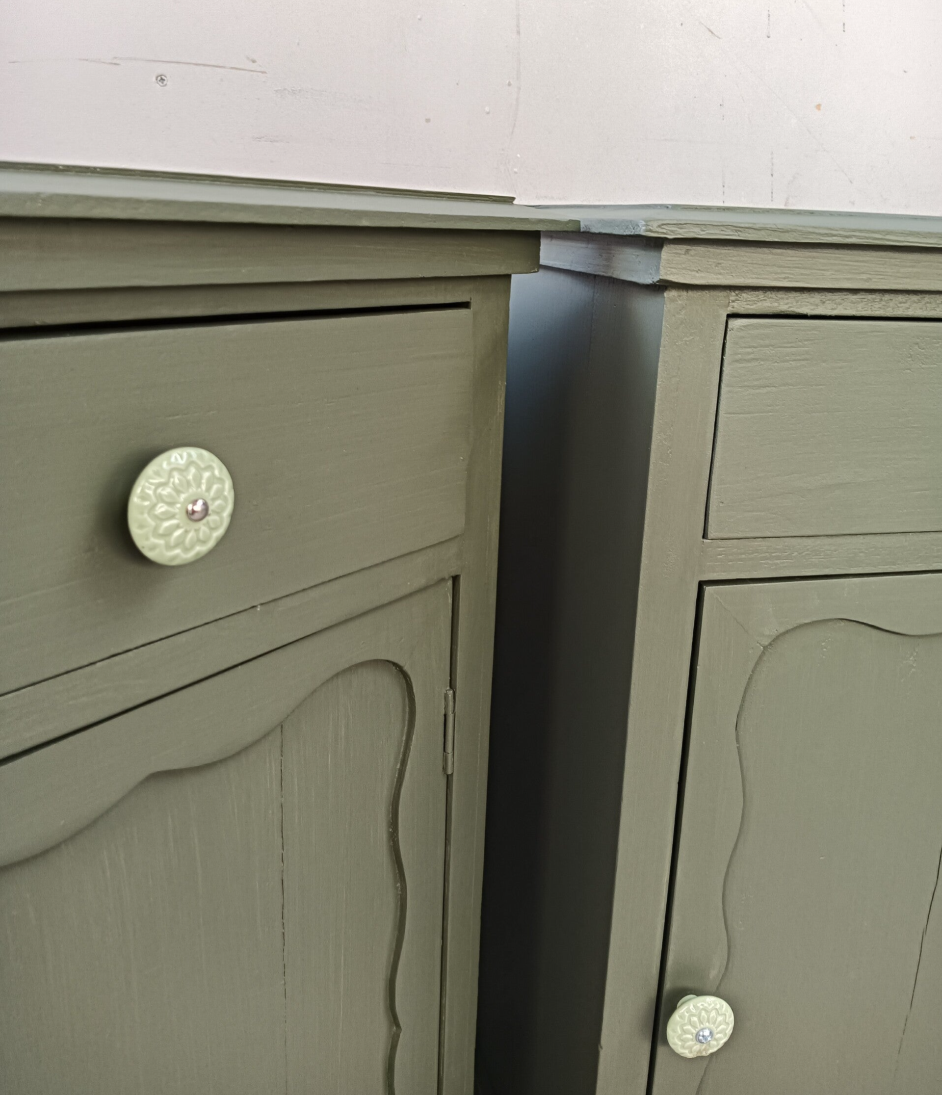 Kanjers van nachtkastjes deze mooie set, niet perse qua gewicht, maar wel door hun uitstraling. De kleur is Bayberry van Fusion Mineral Paint, wat zich goed laat omschrijven als een olijf groene kleur. Op de de laatjes en deurtjes mocht een mooie knop niet ontbreken, dit maakt het geheel helemaal af! En ook de binnenzijde van de laatjes hebben een bijpassende uitstraling gekregen. Qua afmetingen passen deze leukerds ook goed naast een boxspring !