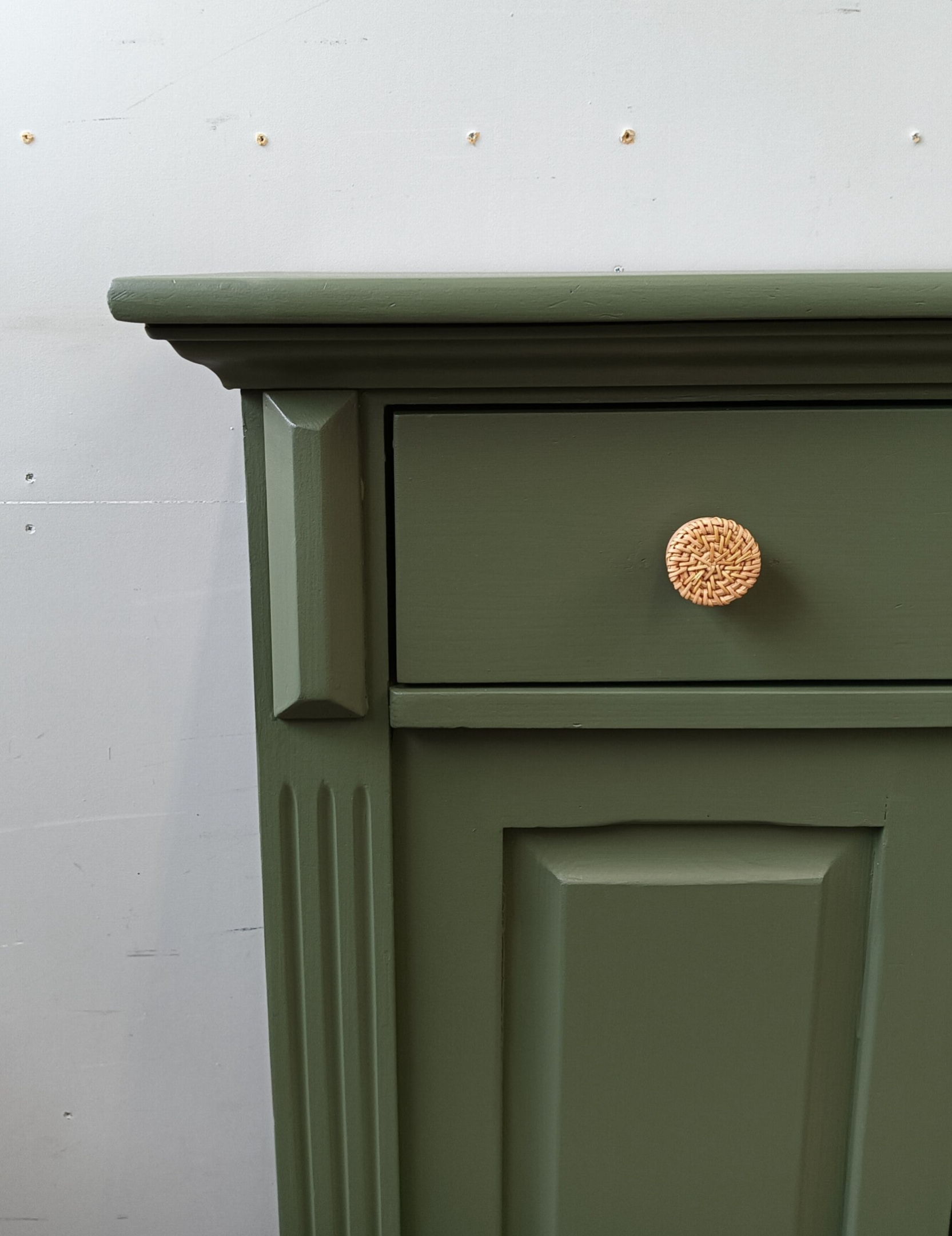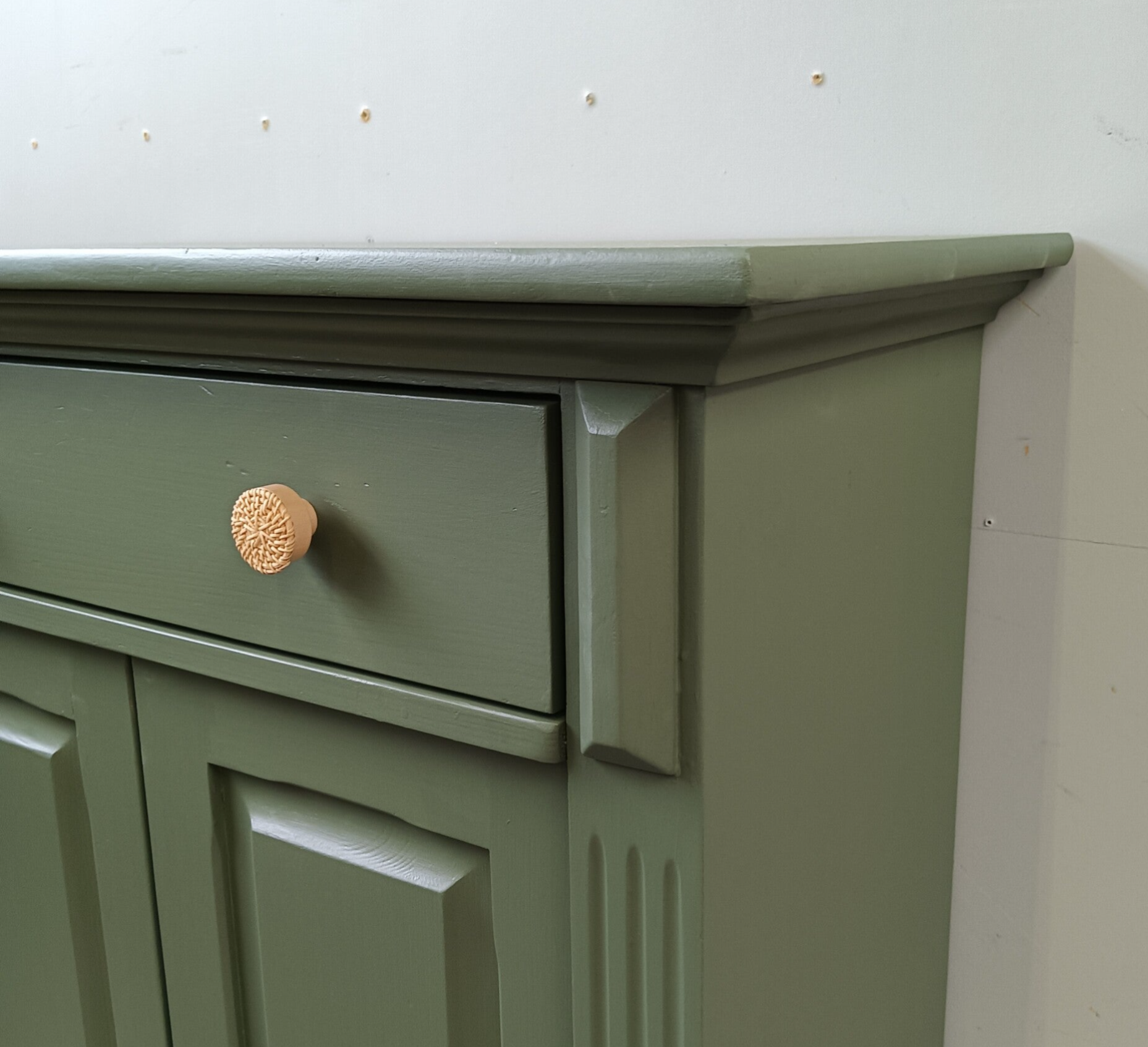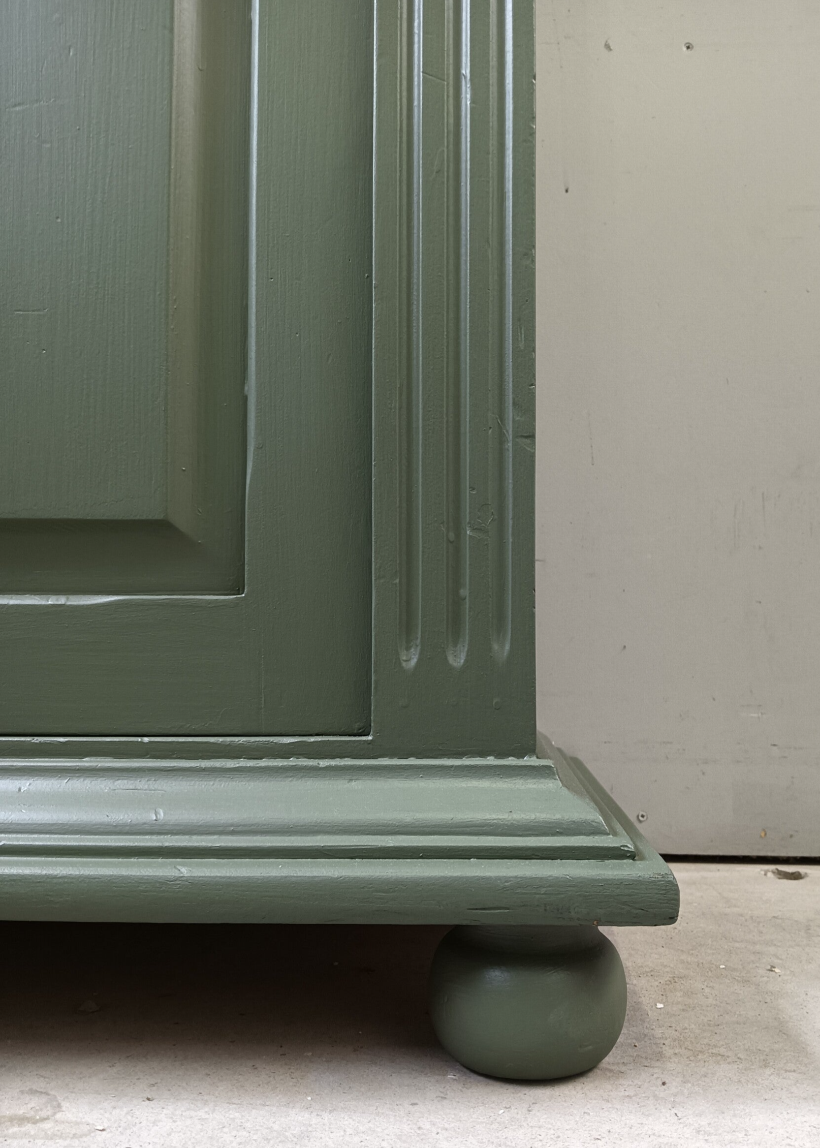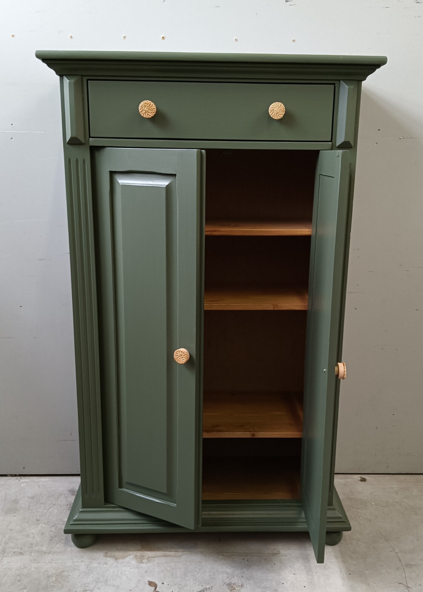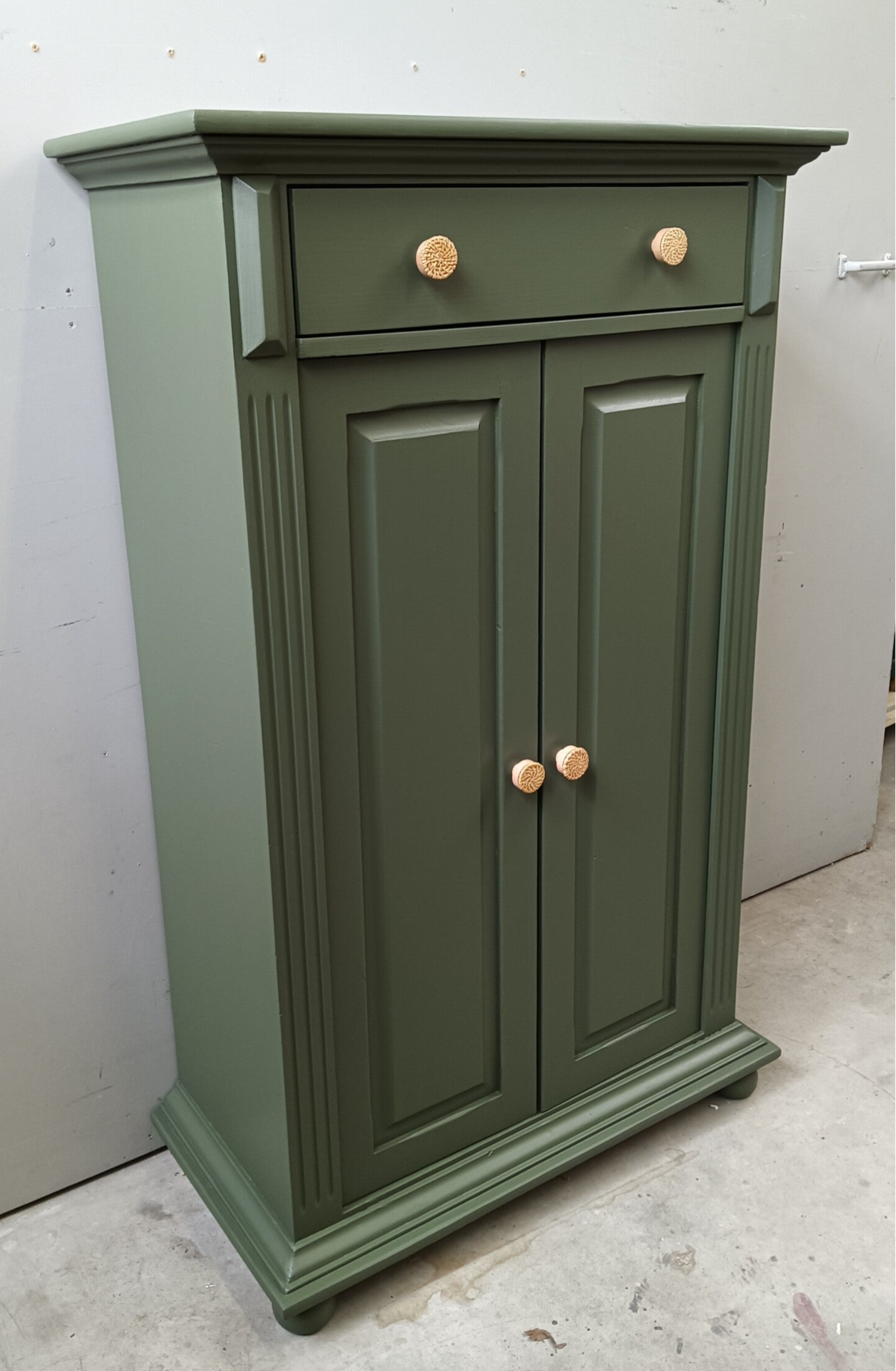 Wow, hoe mooi is deze kast geworden in de kleur Bayberry van Fusion Mineral Paint. Een prachtig olijf groene tint !!! Prachtige zogenaamde "meidenkast' met lade en achter de deurtjes heerlijk wat planken. Toffe bijpassende knoppen mochten op deze kanjer natuurlijk niet ontbreken! Een fijn formaat met een stijlvolle uitstraling.