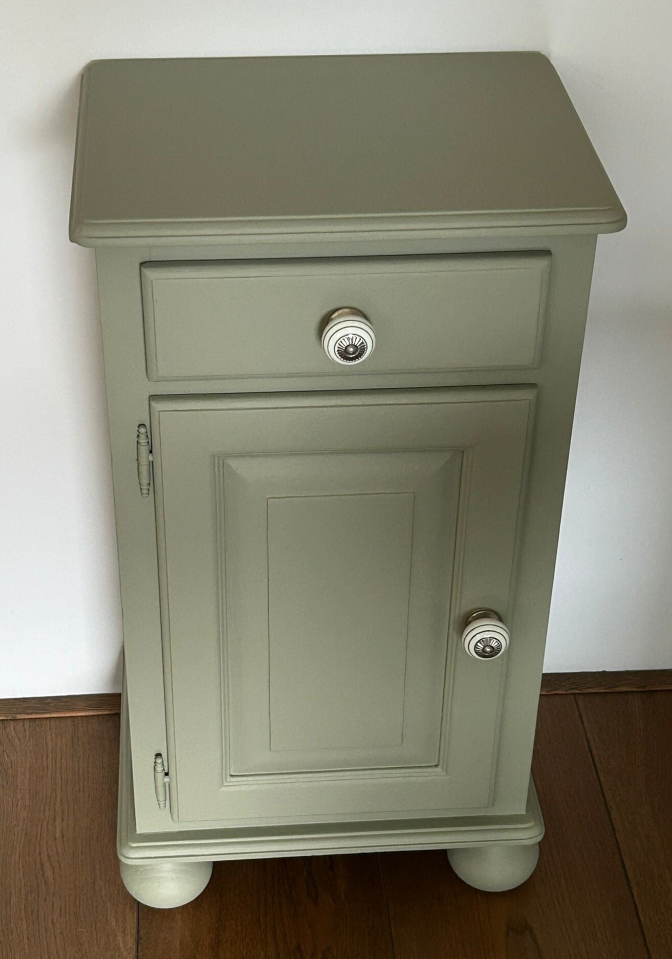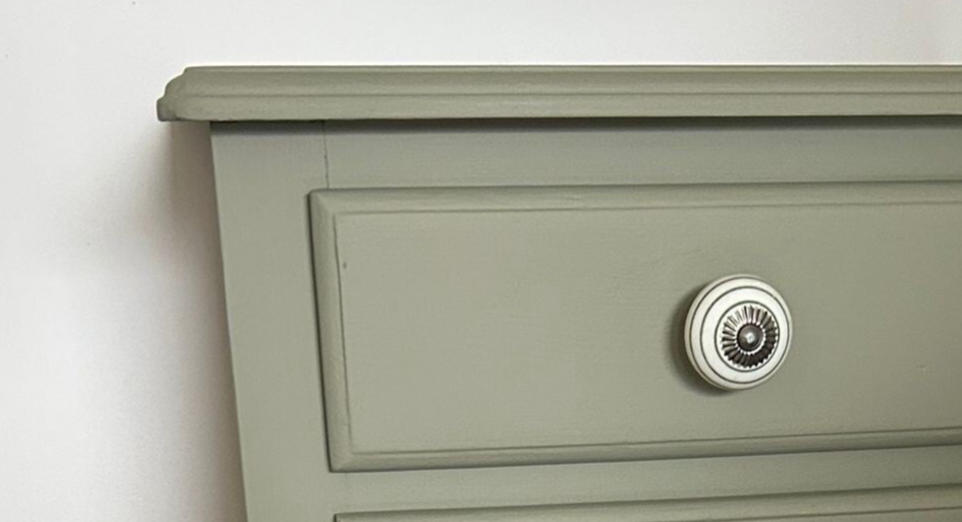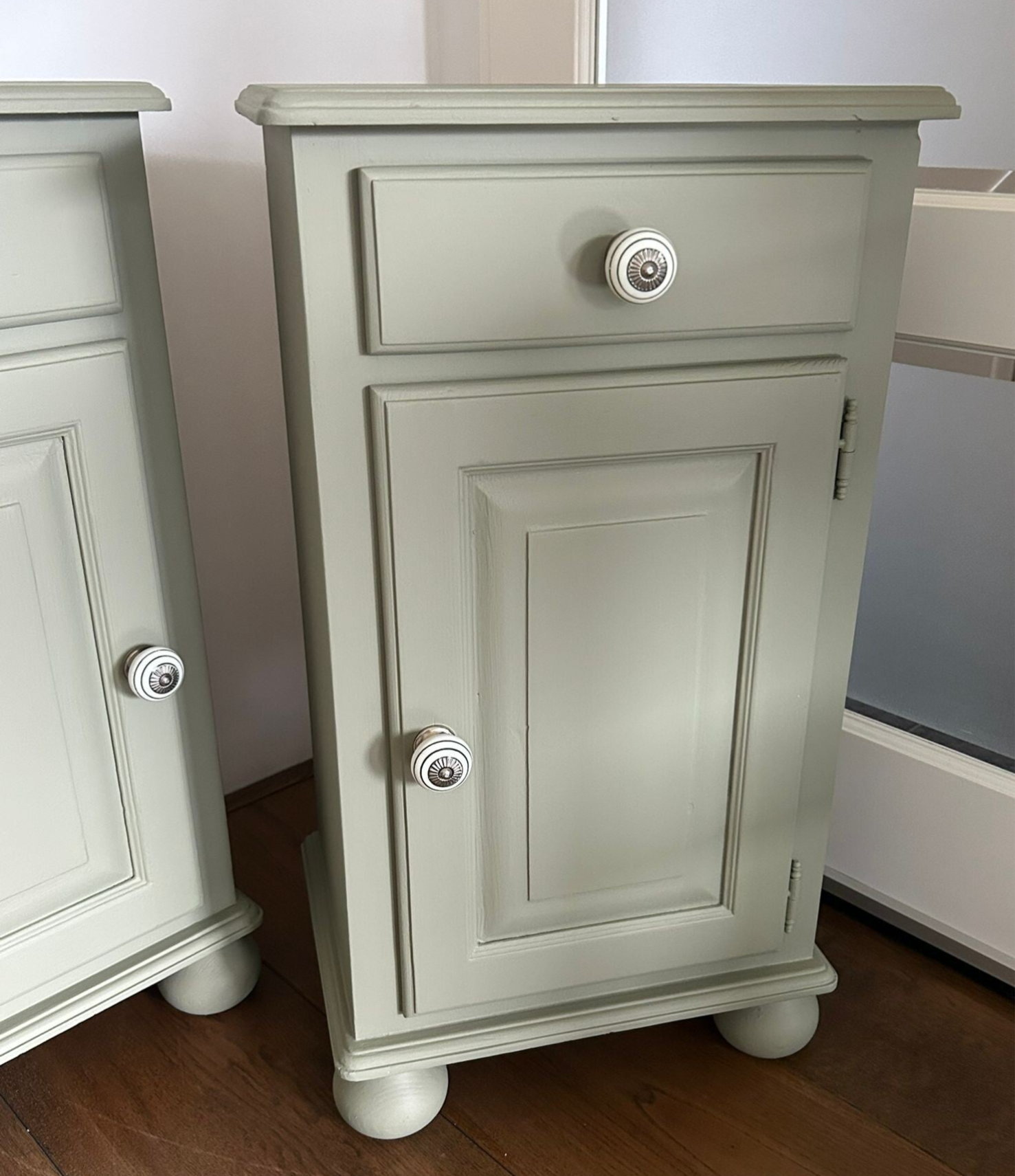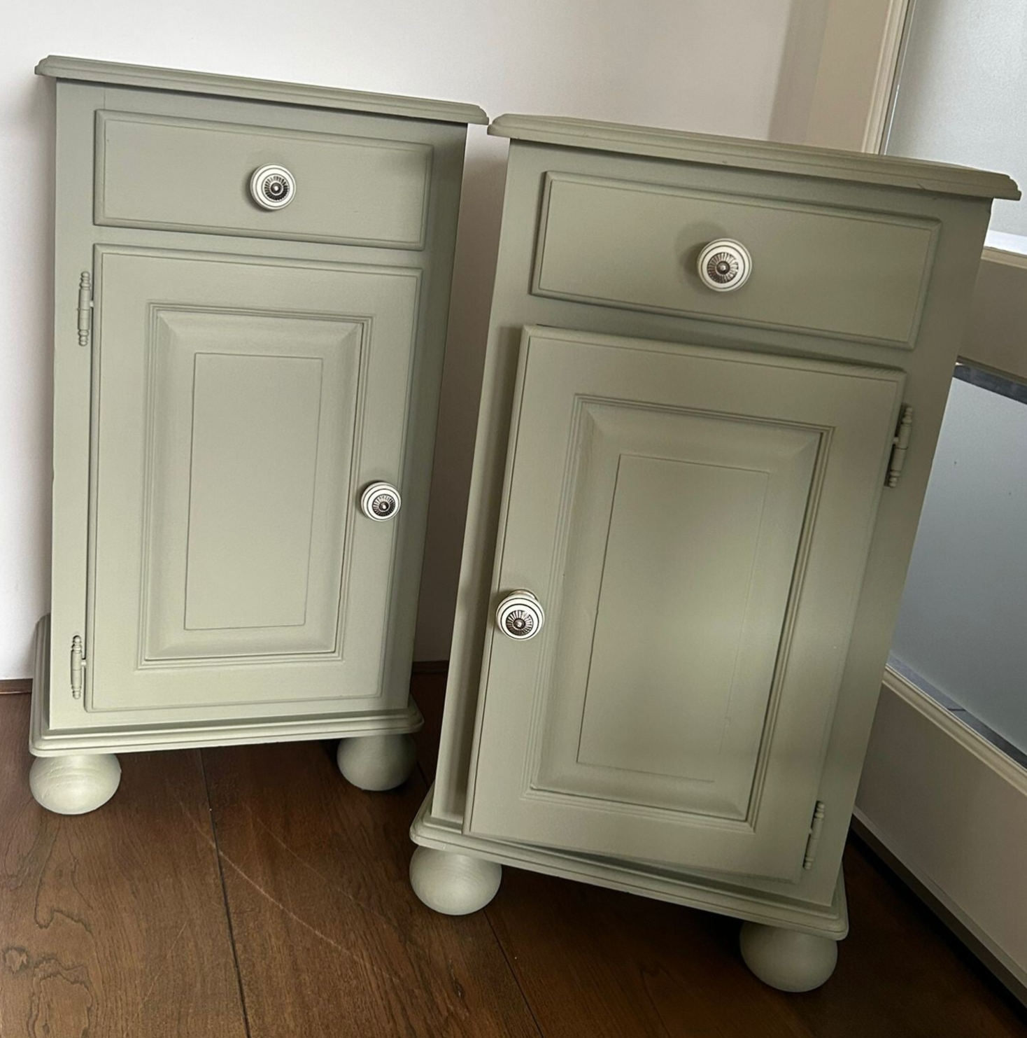Deze set nachtkastjes, met hun subtiele houtsnijwerk/belijning, staan in de kleur Lichen van Fusion Mineral Paint. Deze kleur laat zich het best omschrijven als een licht groene tint met een enigszins grijze ondertoon. De deurtjes & laadjes sluiten goed en na behoren. Ze zijn afgewerkt met mooie bijpassende knoppen op zowel het laatje als deurtje. Qua afmetingen ook uitermate geschikt om naast een boxspring te plaatsen