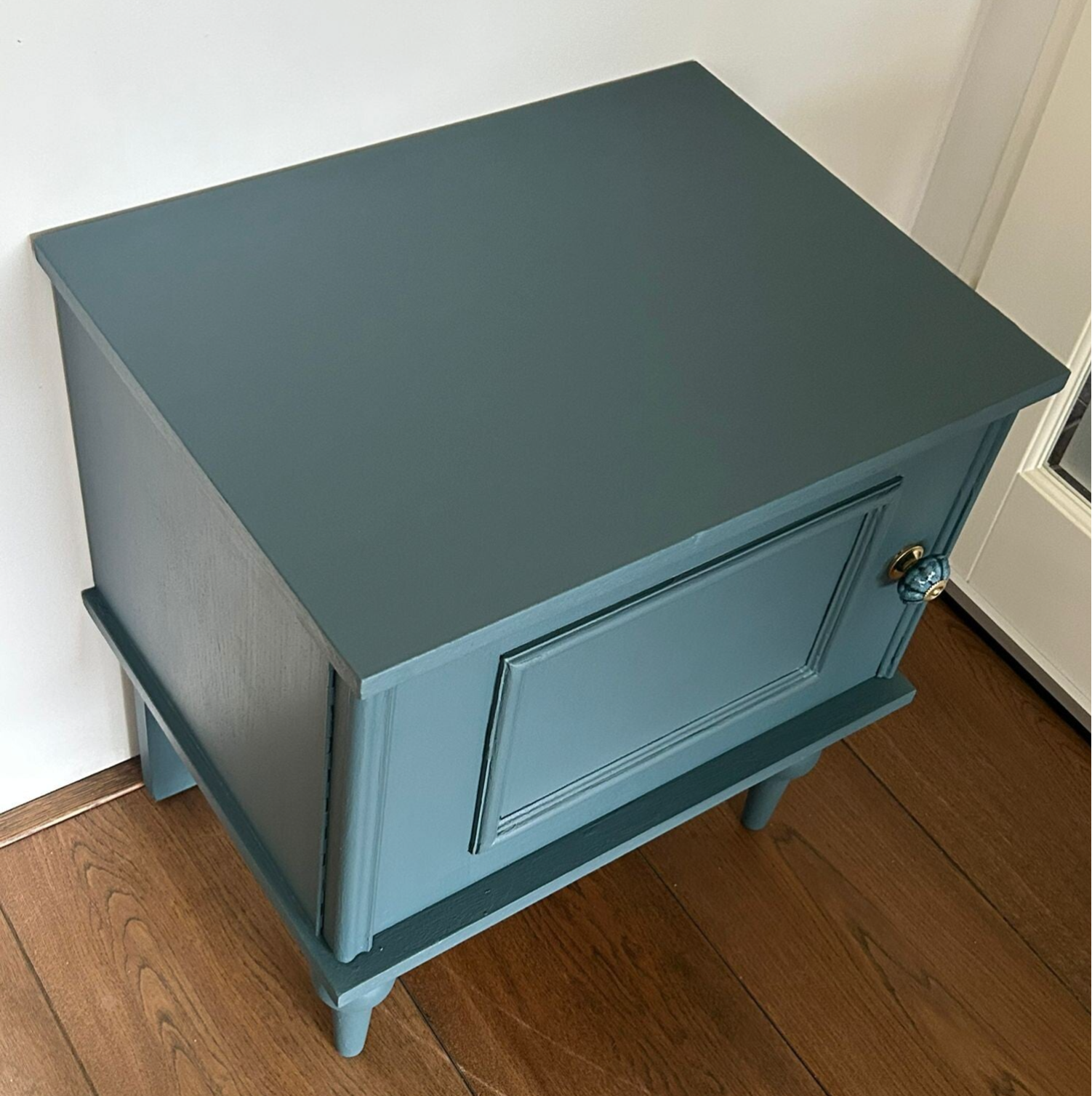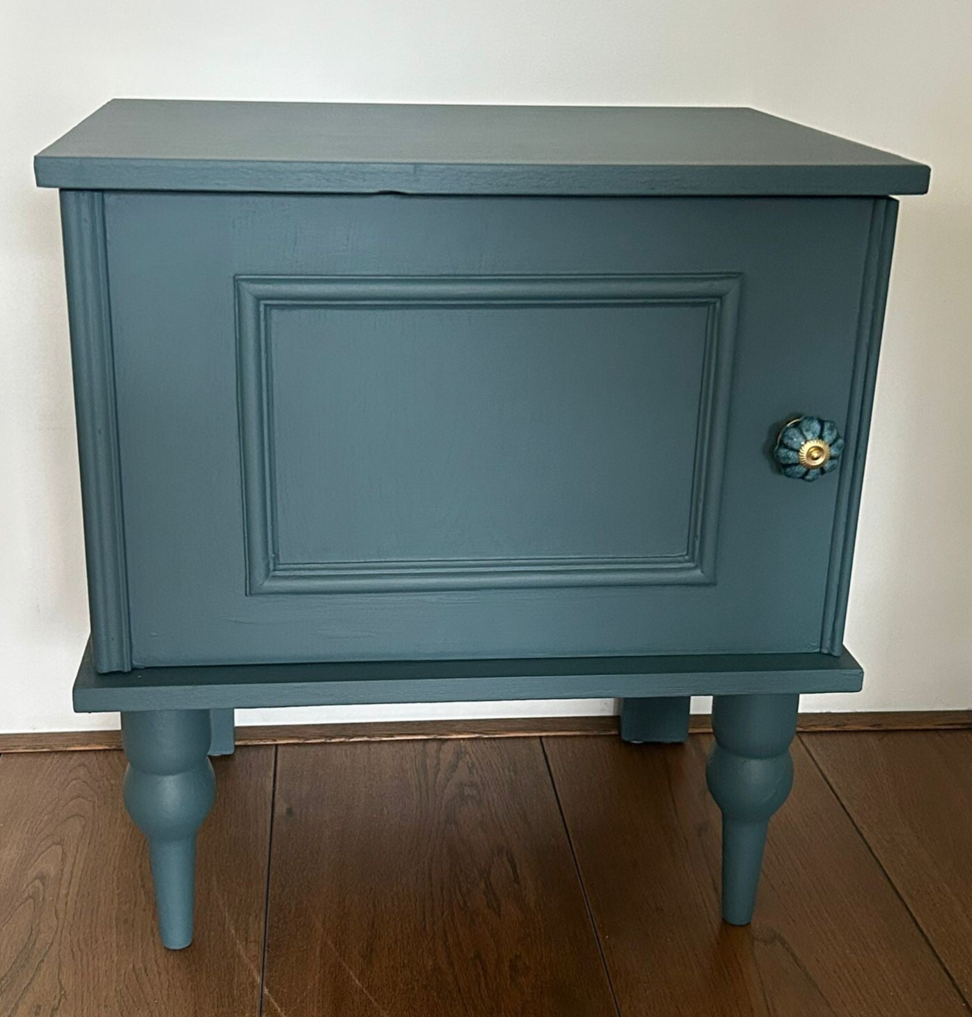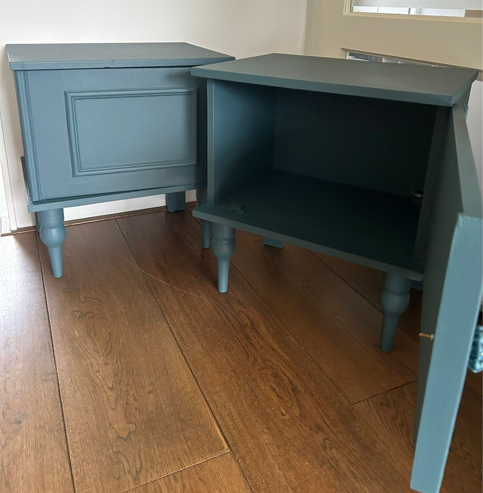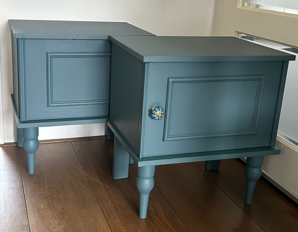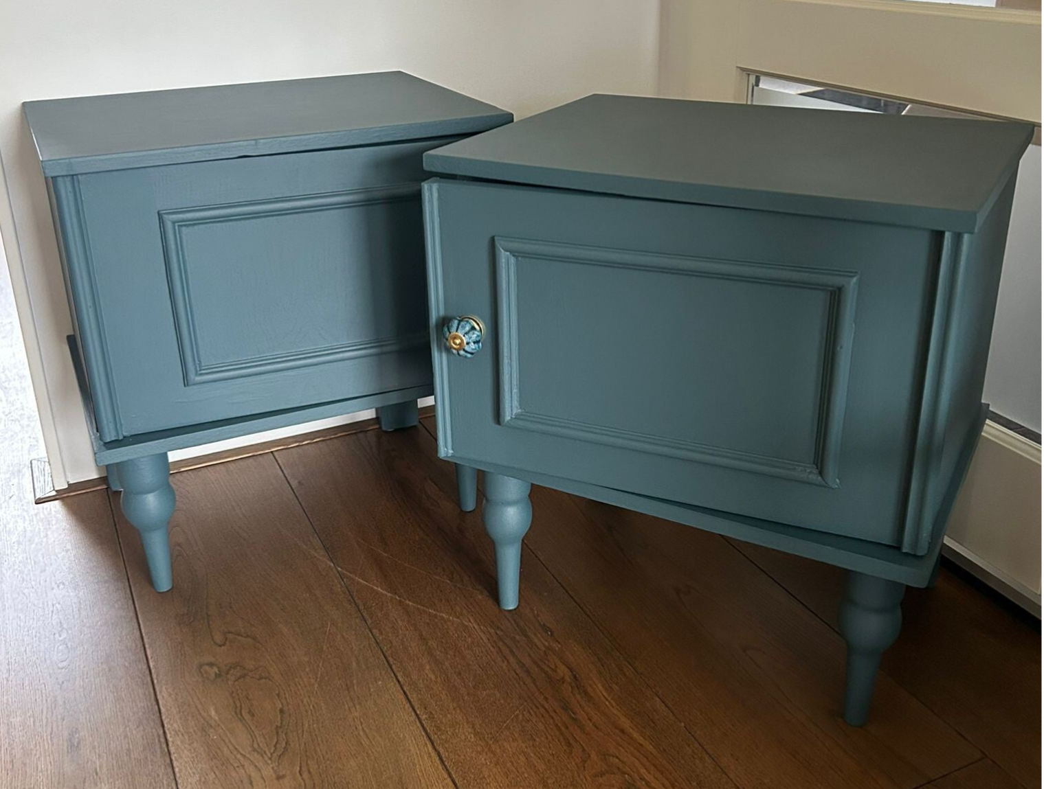 Deze set nachtkastjes, met hun fijne vormgeving, staan in de kleur Homestead Blue van Fusion Mineral Paint. Deze kleur laat zich het best omschrijven als een mooie petrol blauwe tint. De deurtjes sluiten goed en na behoren en zijn afgewerkt met mooie bijpassende knoppen.