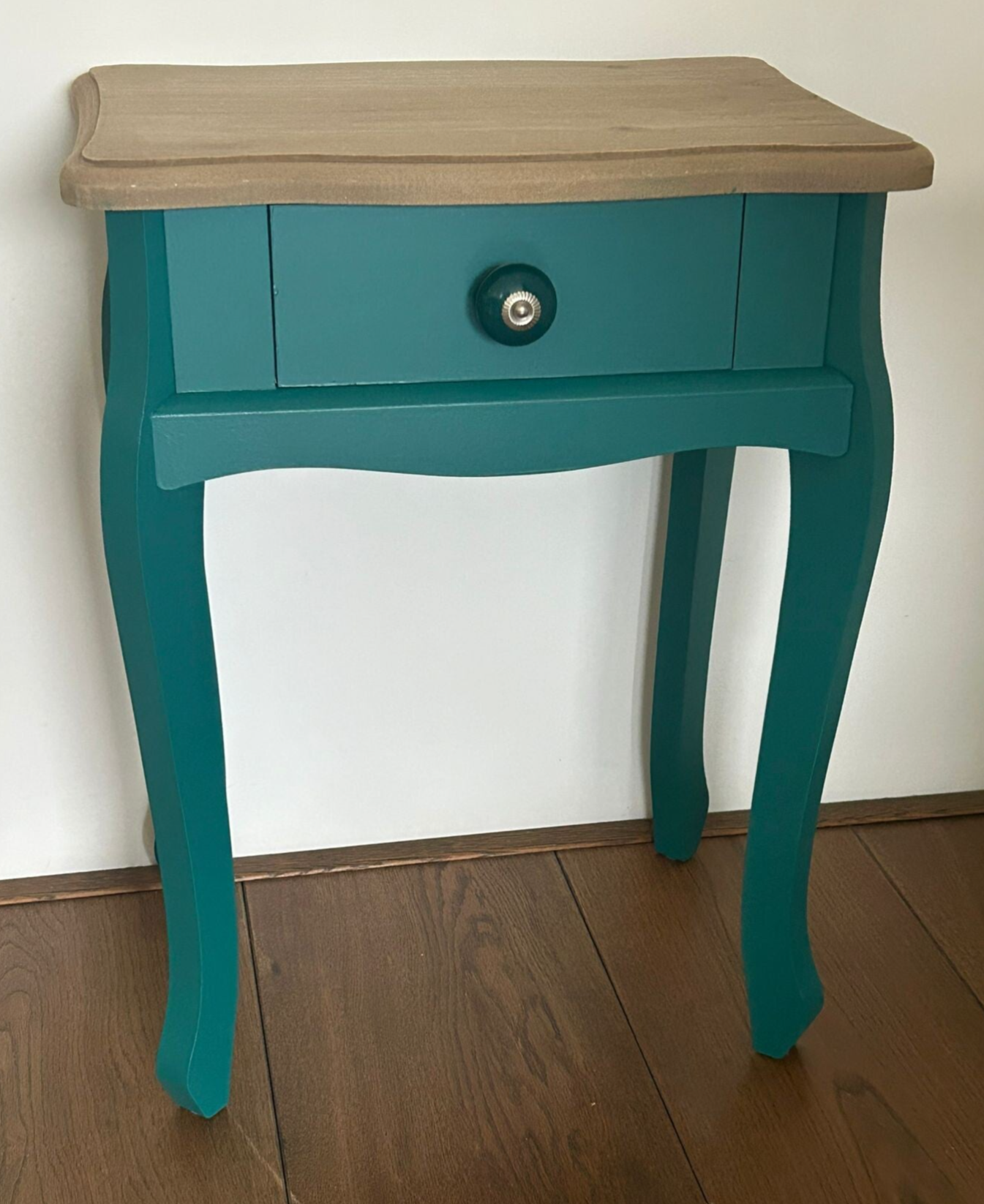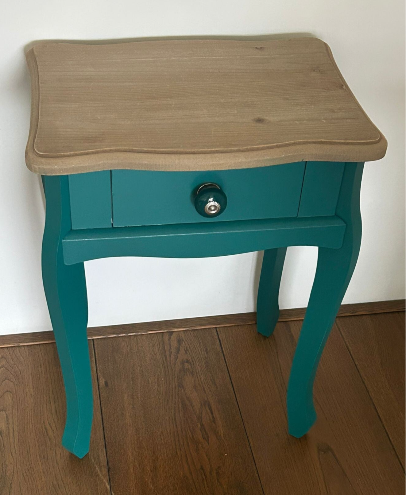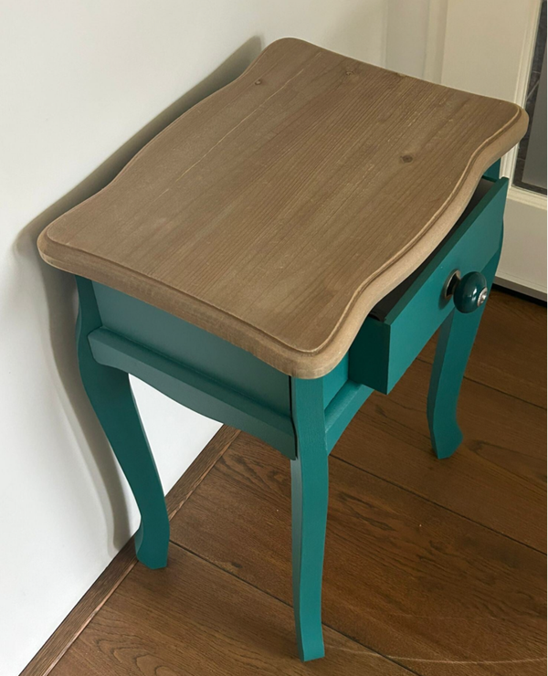 Wat een dot, dit mooie vormgegeven wandkastje en/of tafeltje. Niet perse heel oud, maar wel erg leuk nn de kleur Renfrew Blue van Fusion Mineral Paint. De combinatie van het orginele hout op het blad en de kleur is een echte match! Op het laatje ook een te gek bijpassend knopje, wat het wat ons betreft helemaal af maakt!