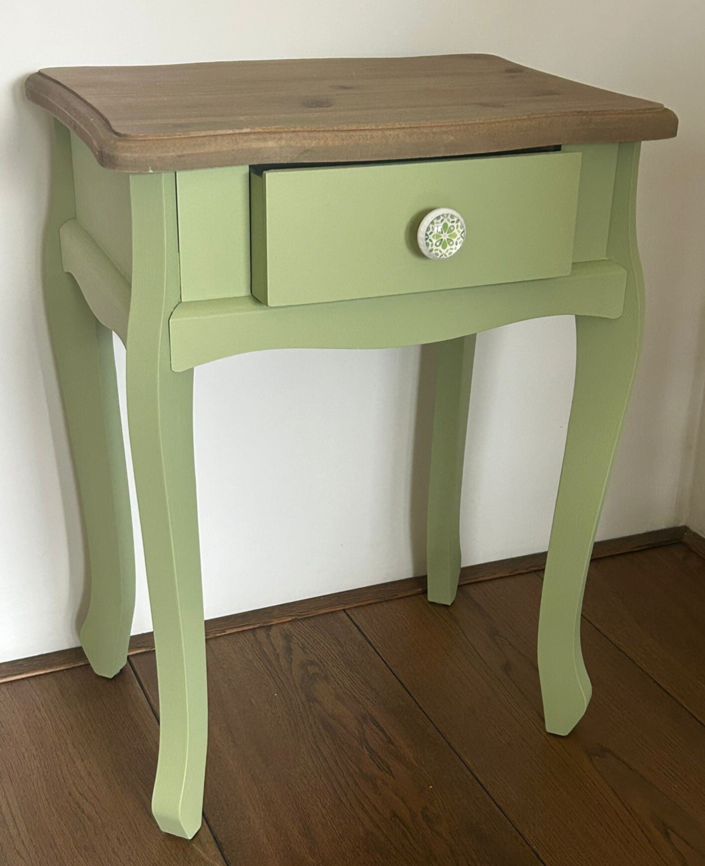 Wat een dot, dit mooie vormgegeven wandkastje en/of tafeltje. Niet perse heel oud, maar wel erg leuk in de kleur Upper Cananda van Fusion Mineral Paint. De combinatie van het orginele hout van het blad en de kleur is een echte match! Op het laatje ook een te gek bijpassend knopje, wat het wat ons betreft helemaal af maakt!