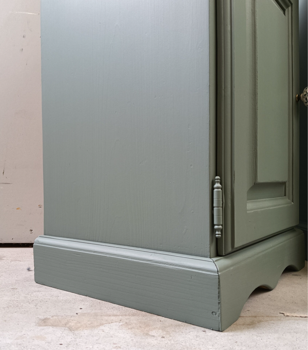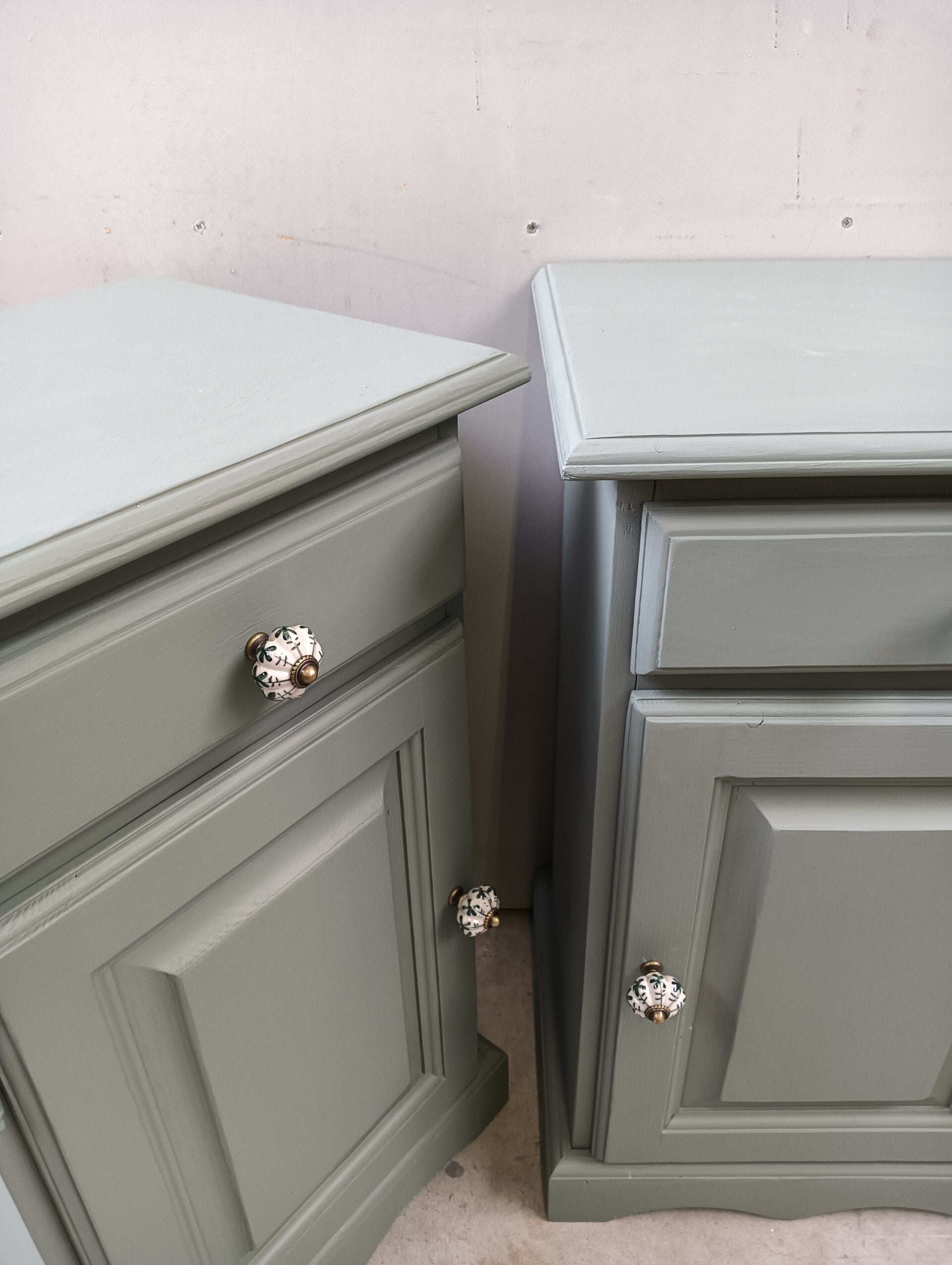 Deze set nachtkastjes, met hun subtiele belijning, staan in de kleur Carriage House van Fusion Mineral Paint. Deze kleur laat zich het best omschrijven als een lagune groene tint. De deurtjes & laadjes sluiten goed en na behoren. Ze zijn afgewerkt met mooie bijpassende knoppen op zowel het laatje als deurtje.
