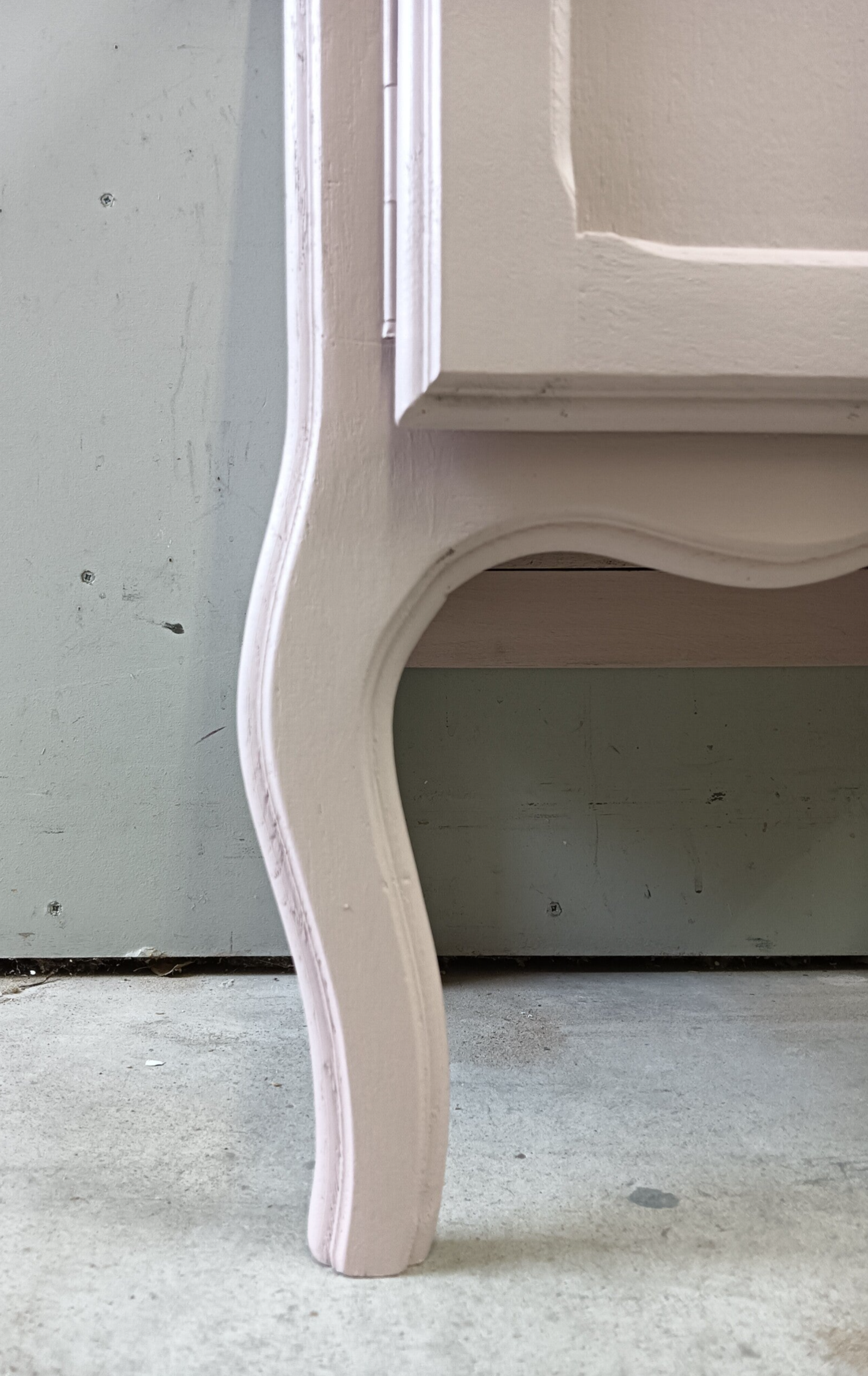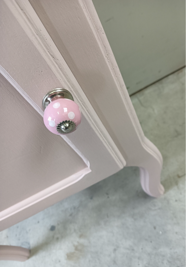 Heerlijk zacht roze, oftewel Rosewater van Fusion Mineral Paint. En wat dacht je van de perfect bijpassende knopje op het deurtje, helemaal leuk toch. Een mooi kastje met haar mooie vormgeving.