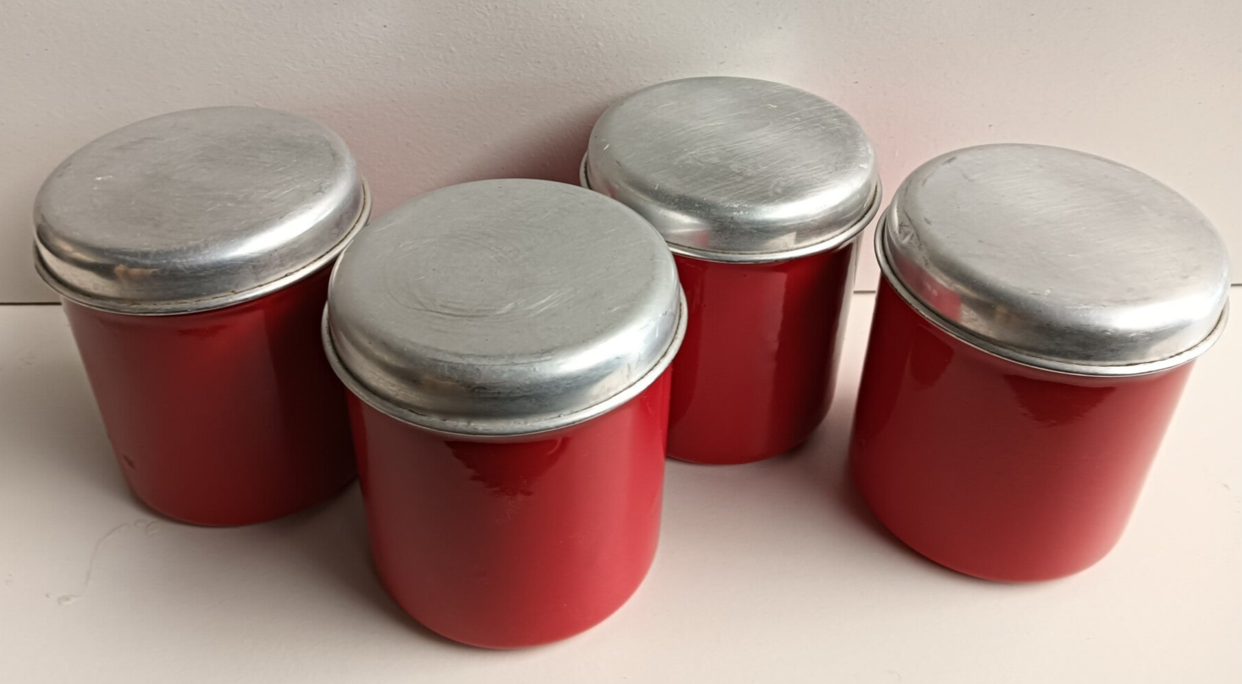Een mooie, vrij zeldzame, rode set emaille kruidenbusjes. Deze set bestaat uit vier exemplaren, te weten;