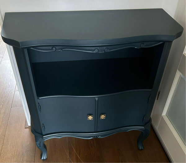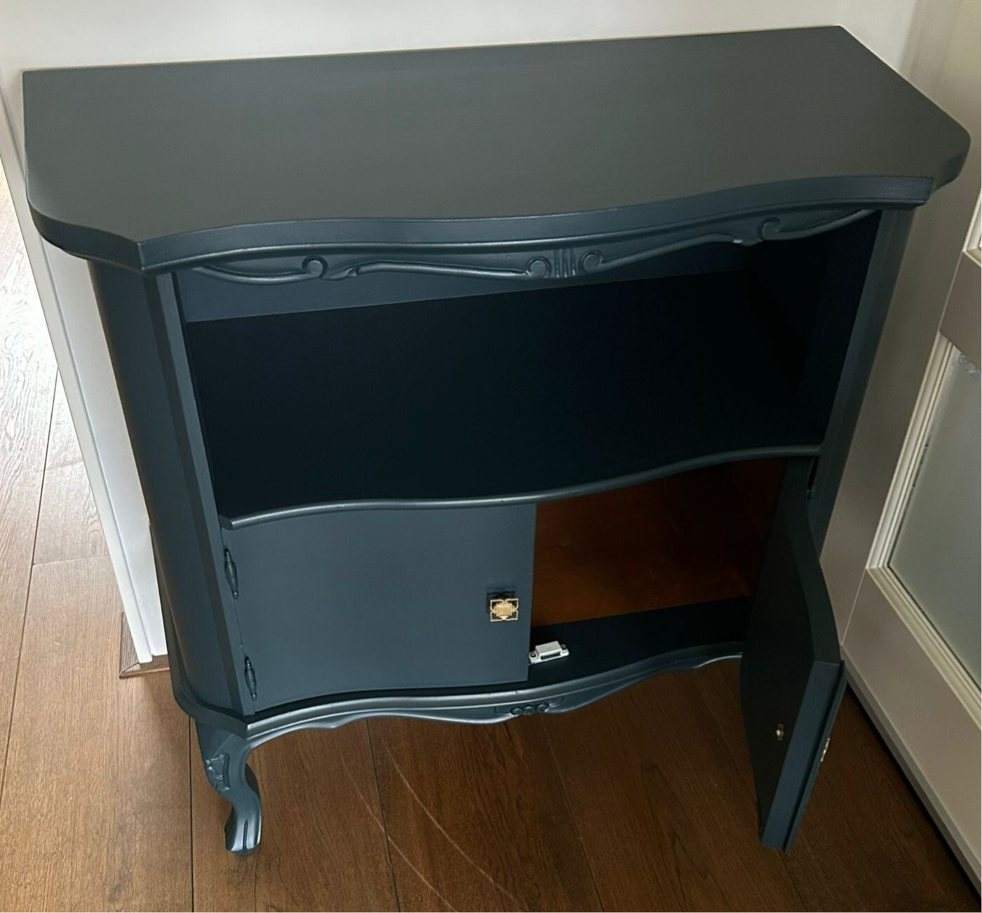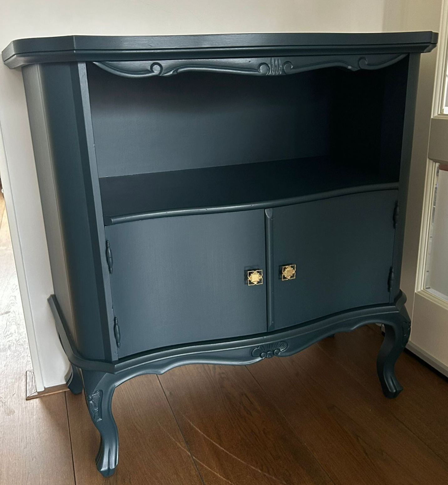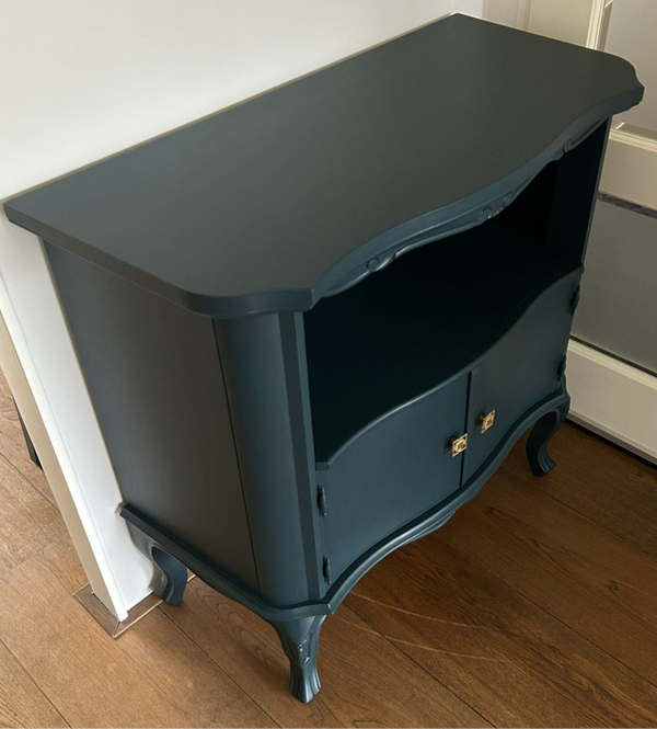 Een mooie en sierlijk vormgegeven wandkastje. De kleur Chestler van Fusion Mineral Paint is hier gebruikt en is een intens blauwe tint met ergens in de verte een vleugje groen als ondertoon, wat deze dame best goed draagt. De knopjes die we hebben uitgezocht zijn wat ons betreft een super match qua stijl en uitstraling. Dit kastje is uiteraard ook goed te gebruiken als dressoir of als tv kastje. Nou....mogelijkheden zat volgens mij !