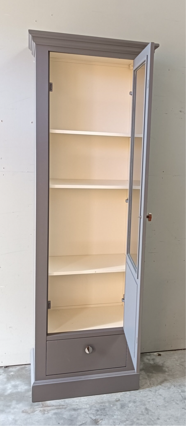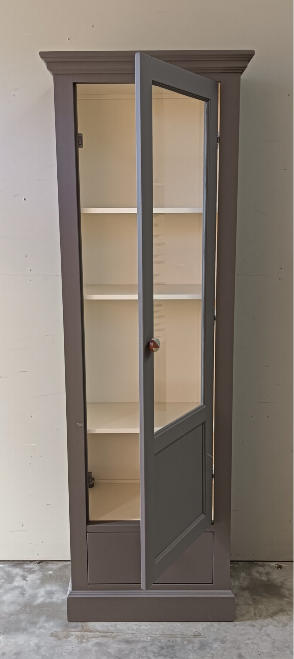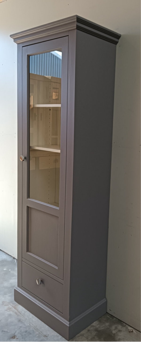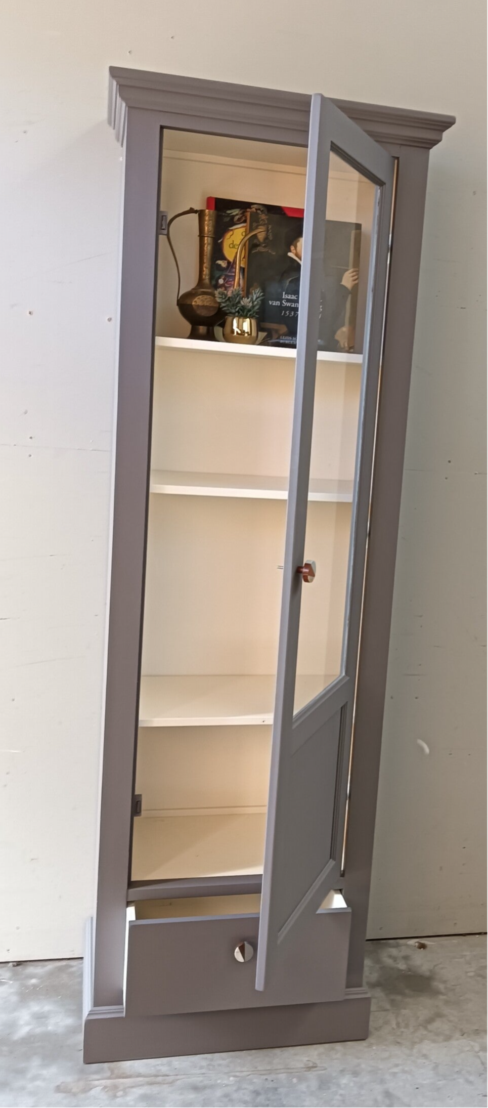 Een mooi vormgegeven vitrinekast. De kleur is Hazelwood van Fusion Mineral Paint, wat zich goed laat omschrijven als een mooie en diepe grijs tint. Dit in combinatie met de lichte binnenkant maken dit tot een mooi geheel. Genoeg planken achter de deur en je kunt kiezen om te "tonen" en te "bergen". De lade onderop de kast werkt goed mee en zowel op de lade als de deur is een mooie bijpassende knop gezet. Maakt het een prettige combinatie en helemaal af.