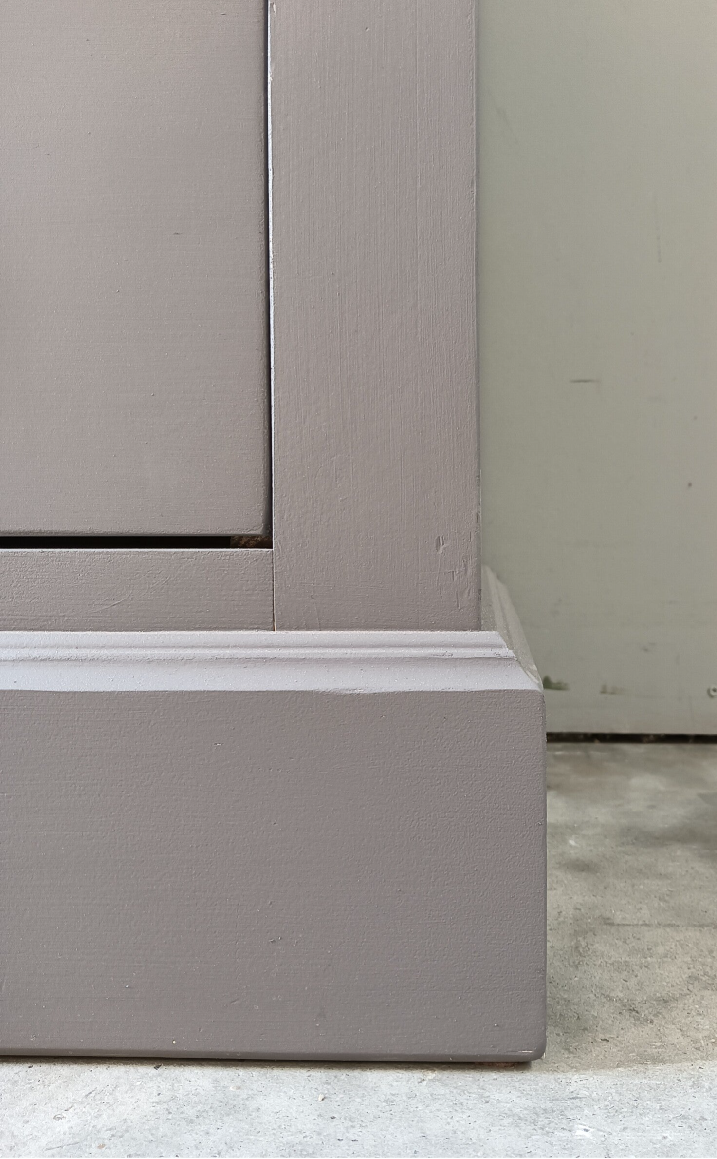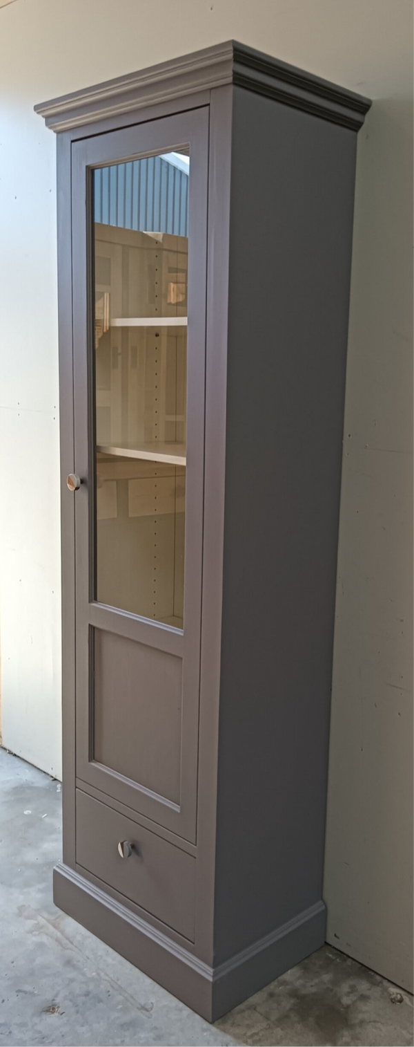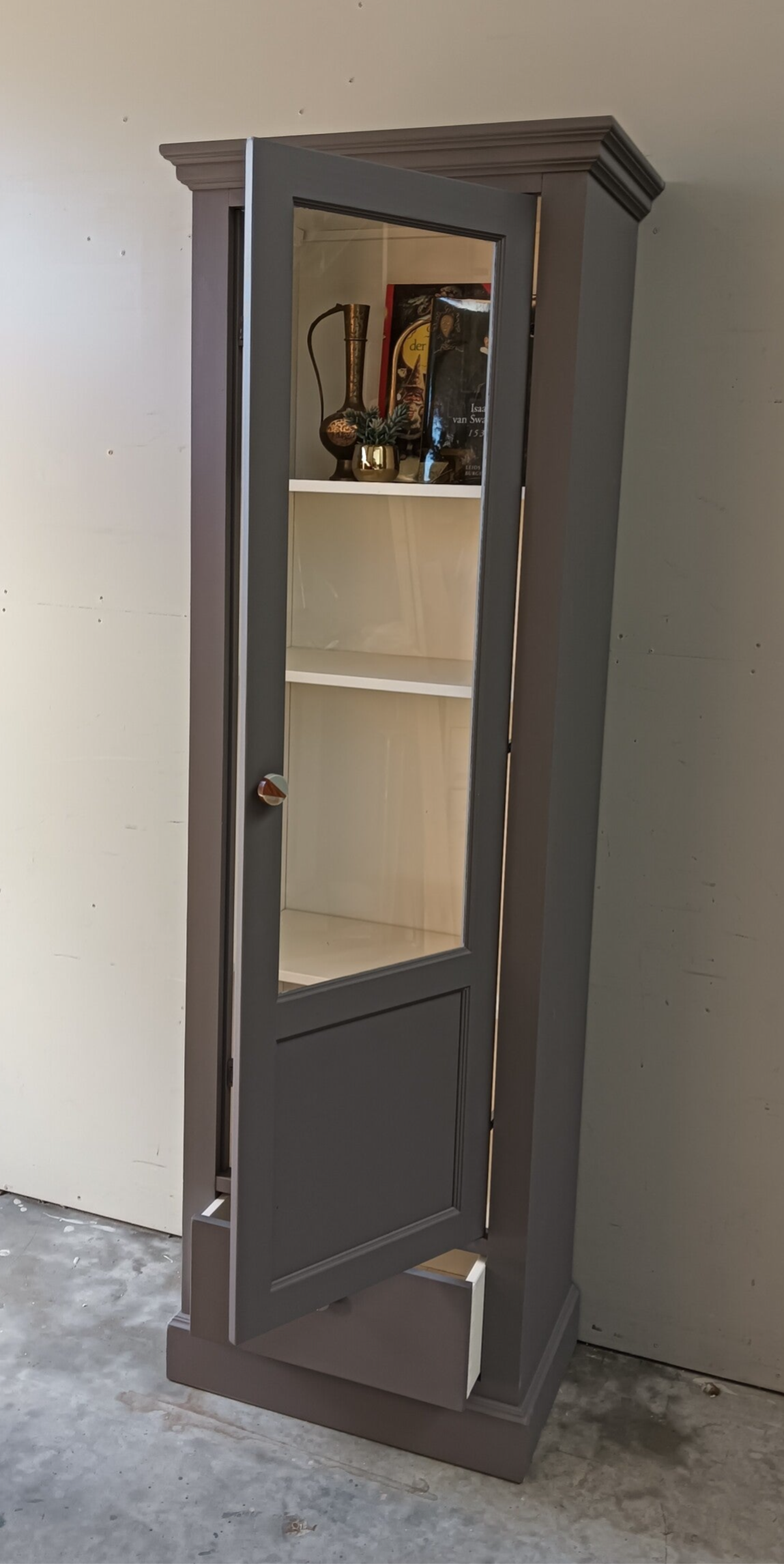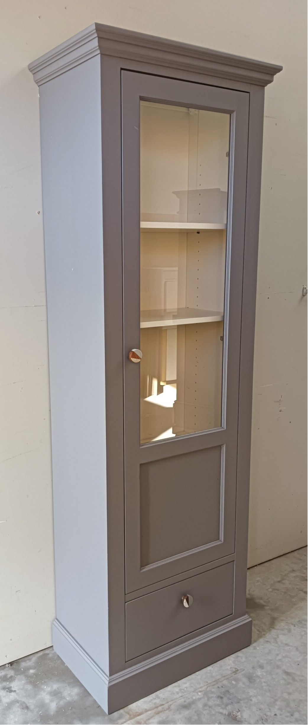 Een mooi vormgegeven vitrinekast. De kleur is Hazelwood van Fusion Mineral Paint, wat zich goed laat omschrijven als een mooie en diepe grijs tint. Dit in combinatie met de lichte binnenkant maken dit tot een mooi geheel. Genoeg planken achter de deur en je kunt kiezen om te "tonen" en te "bergen". De lade onderop de kast werkt goed mee en zowel op de lade als de deur is een mooie bijpassende knop gezet. Maakt het een prettige combinatie en helemaal af.