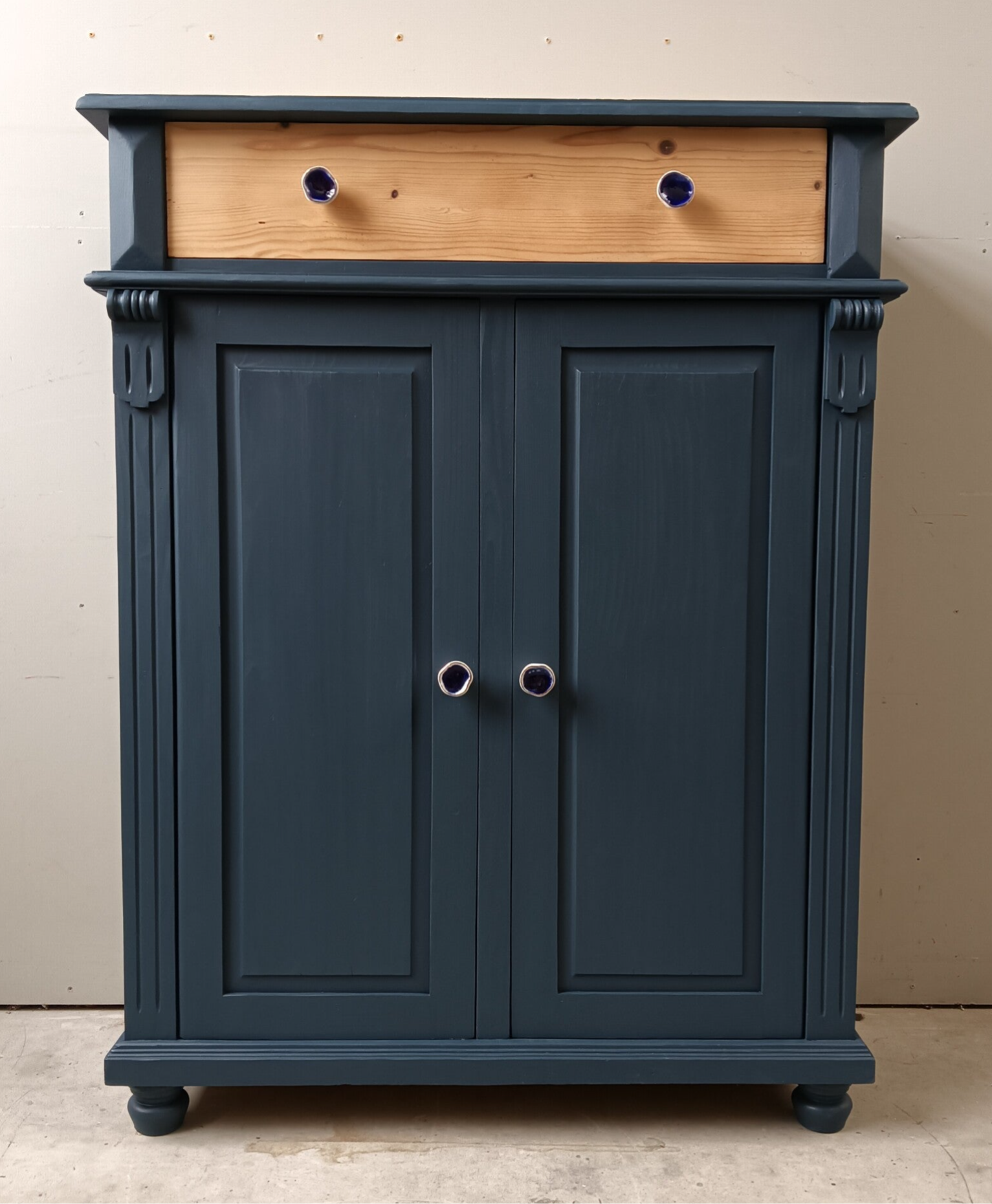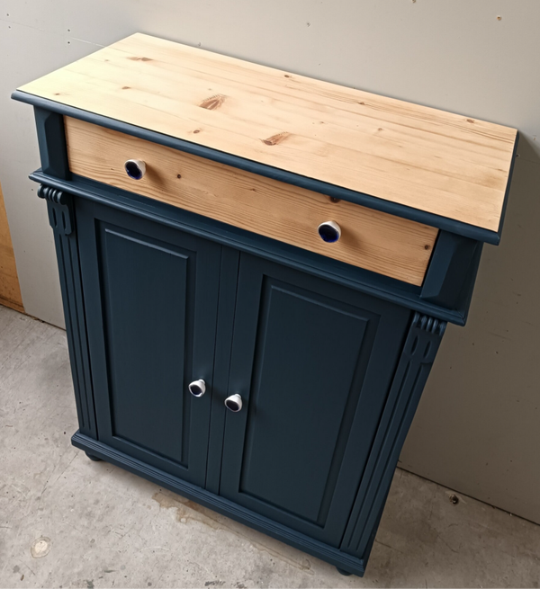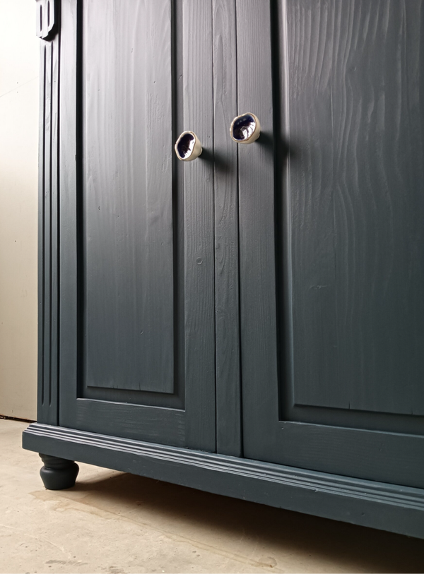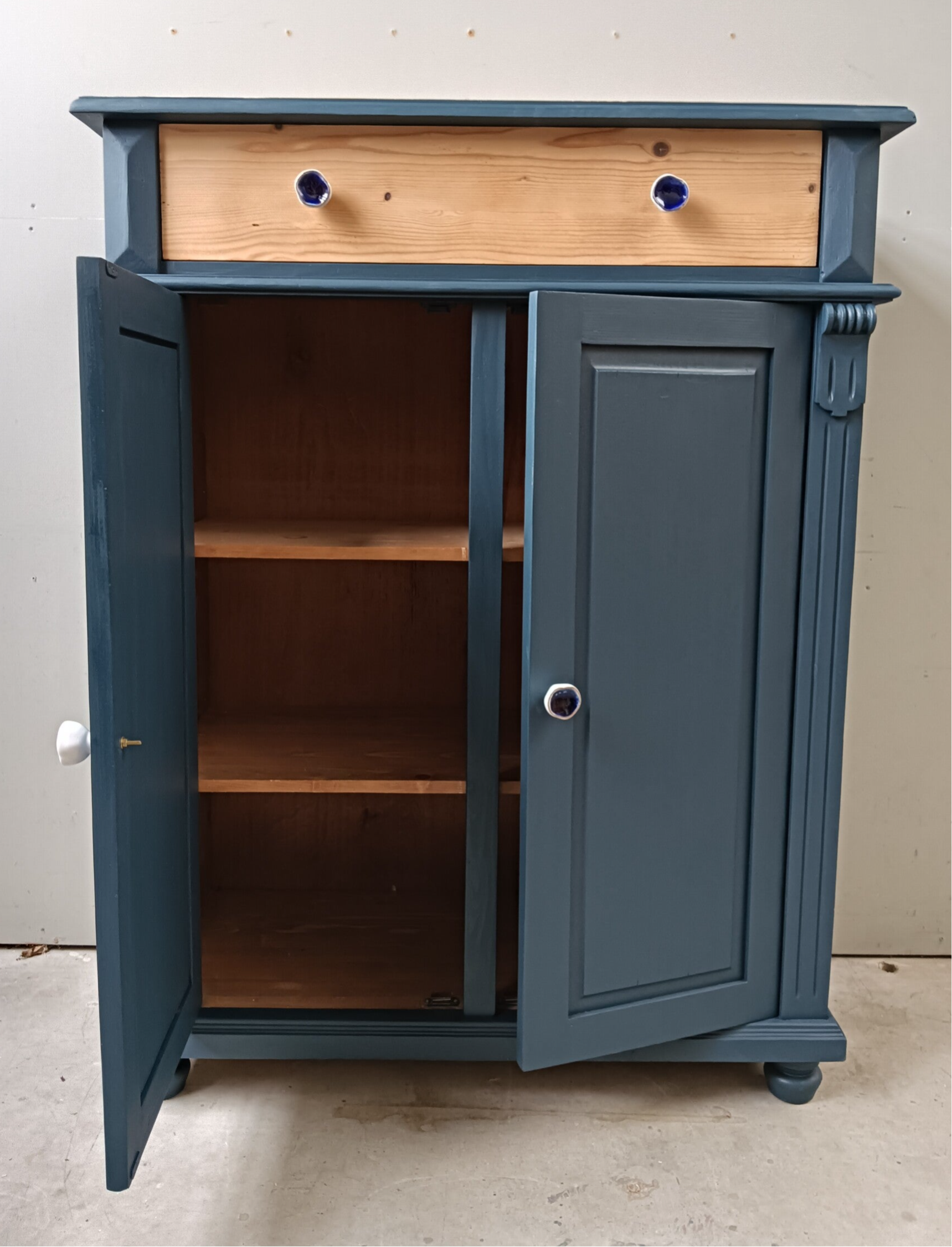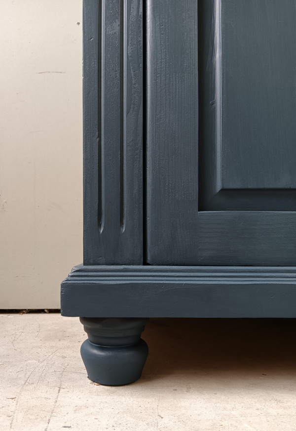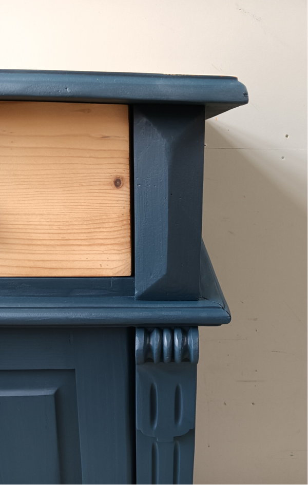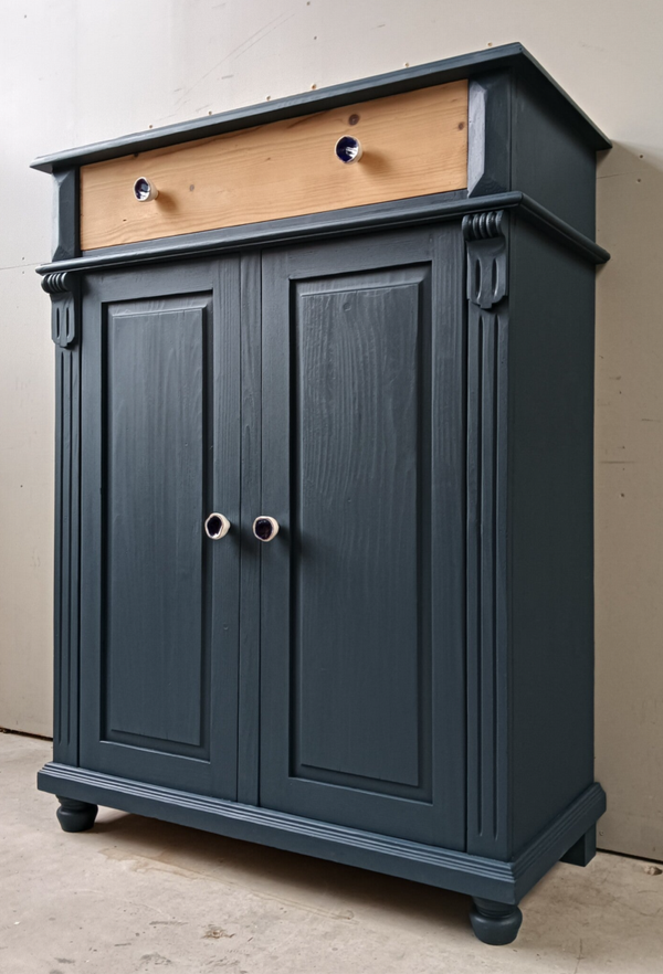 Wow, hoe mooi is deze kast geworden in de kleur Willowband van Fusion Mineral Paint. Een prachtig diep blauwe tint !!! Prachtige zogenaamde "meidenkast' met lade en achter de deurtjes heerlijk wat planken. Toffe bijpassende knoppen mochten op deze kanjer natuurlijk niet ontbreken! Een fijn formaat met een stijlvolle uitstraling. Zeker in combinatie met het orginele hout !