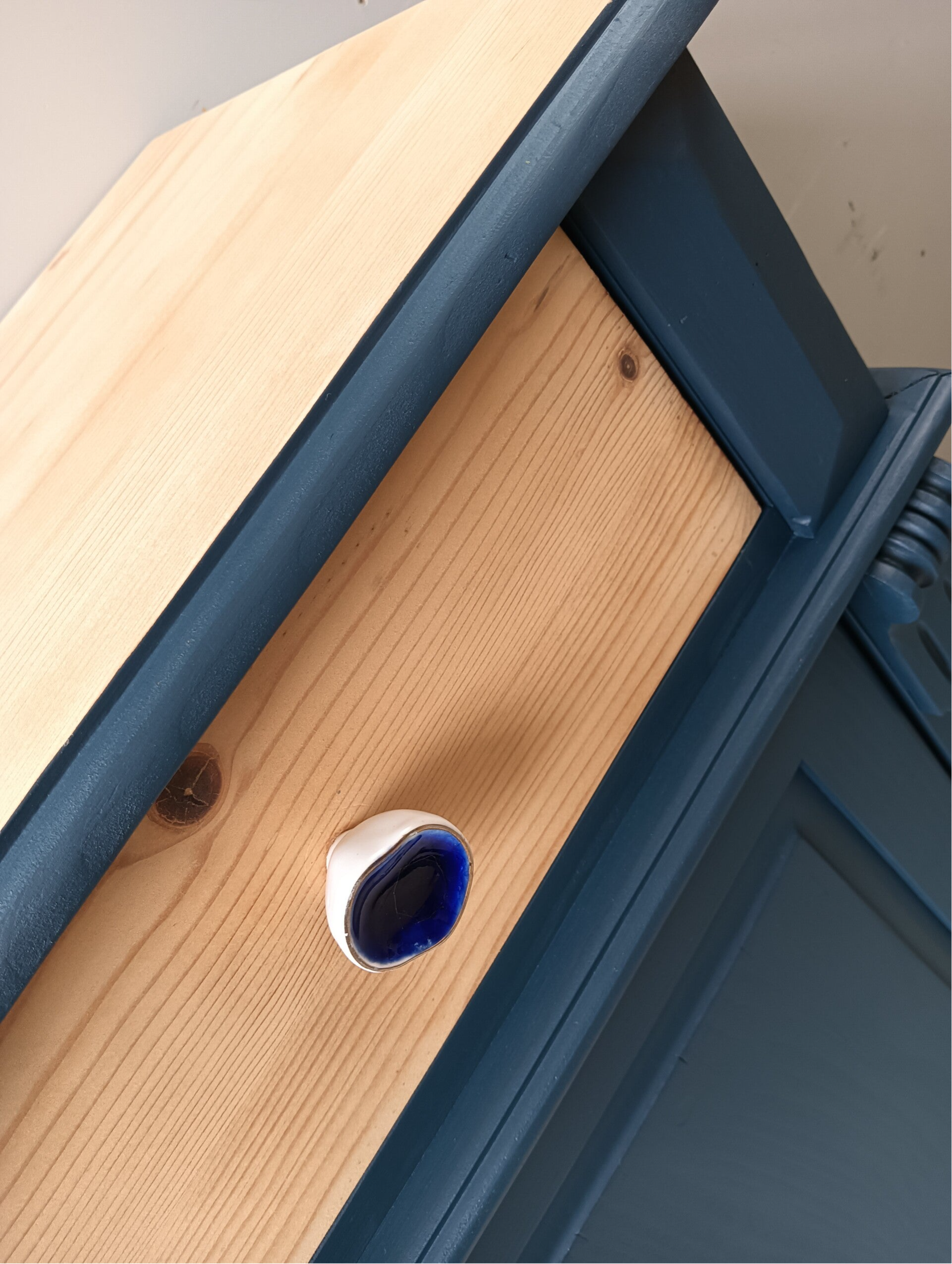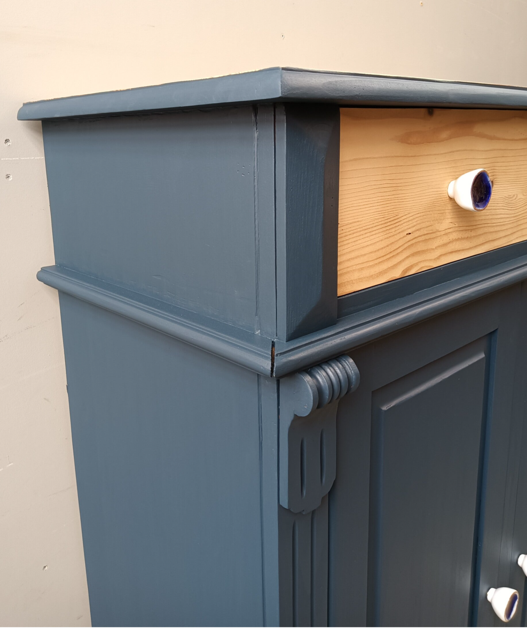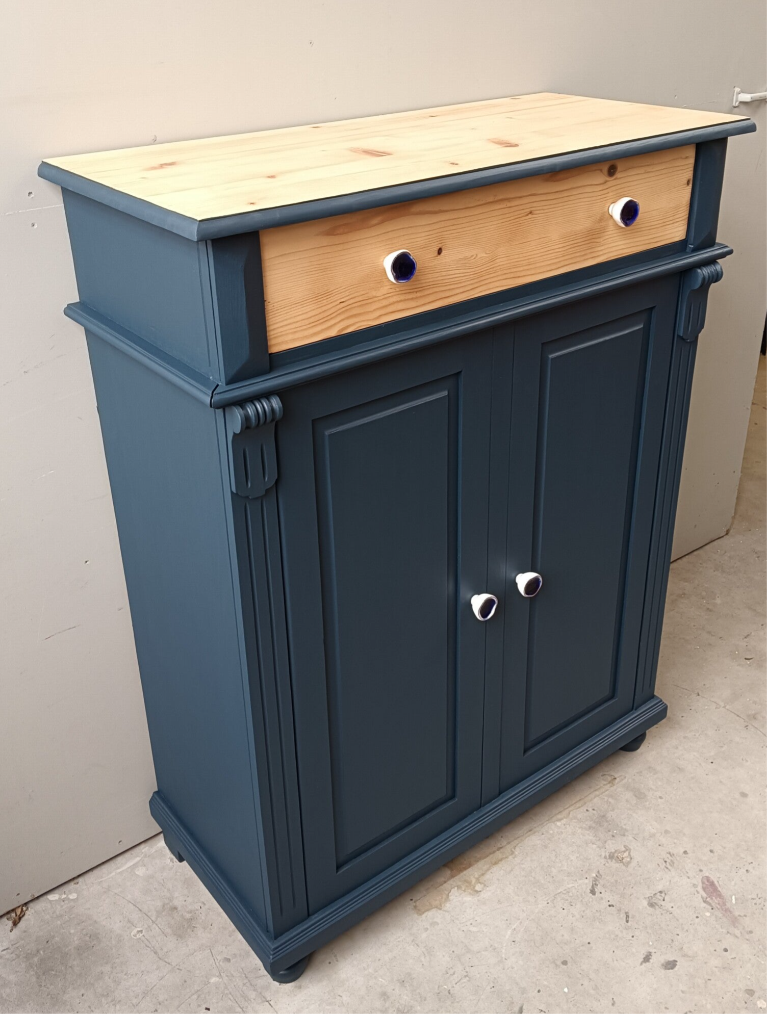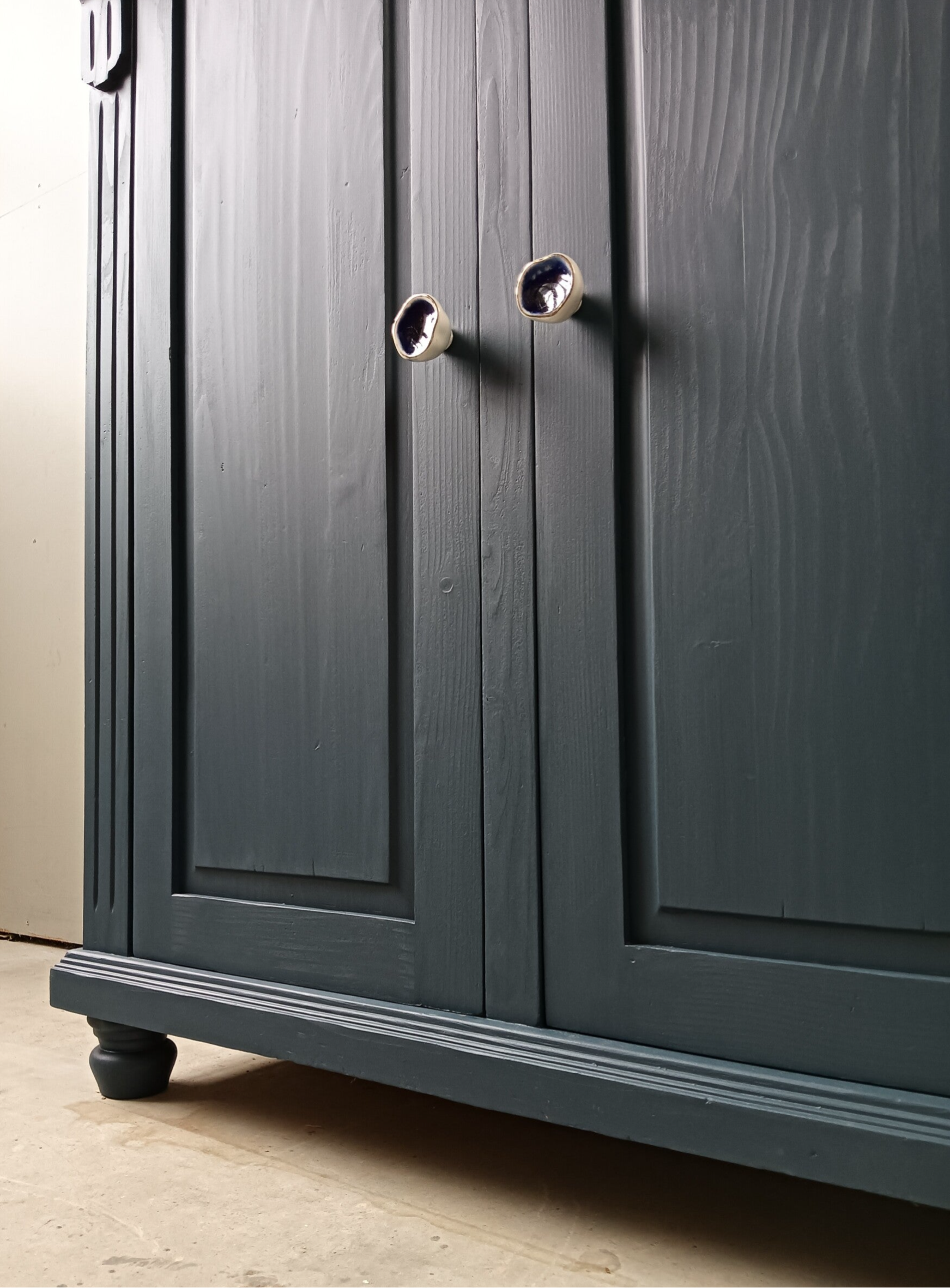Wow, hoe mooi is deze kast geworden in de kleur Willowband van Fusion Mineral Paint. Een prachtig diep blauwe tint !!! Prachtige zogenaamde "meidenkast' met lade en achter de deurtjes heerlijk wat planken. Toffe bijpassende knoppen mochten op deze kanjer natuurlijk niet ontbreken! Een fijn formaat met een stijlvolle uitstraling. Zeker in combinatie met het orginele hout !