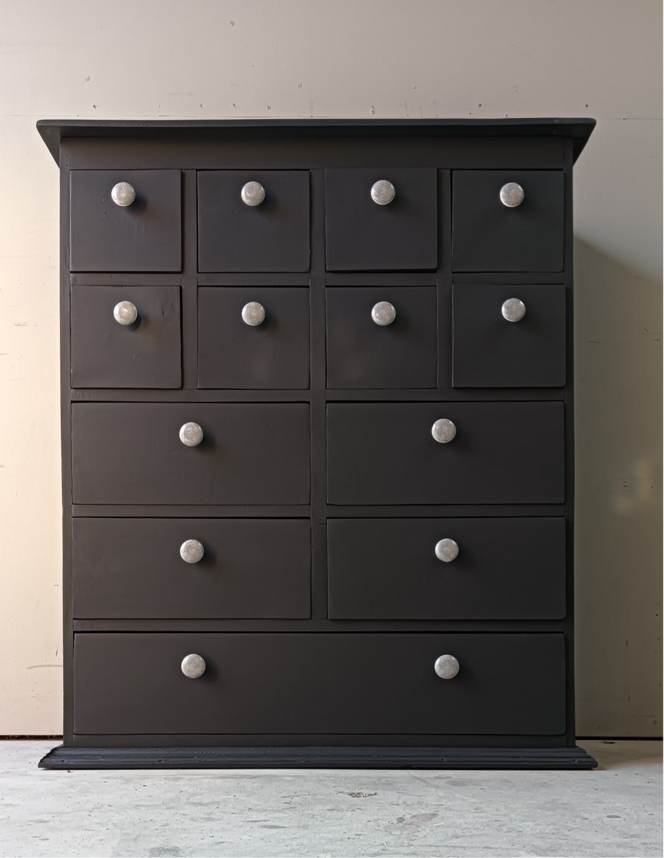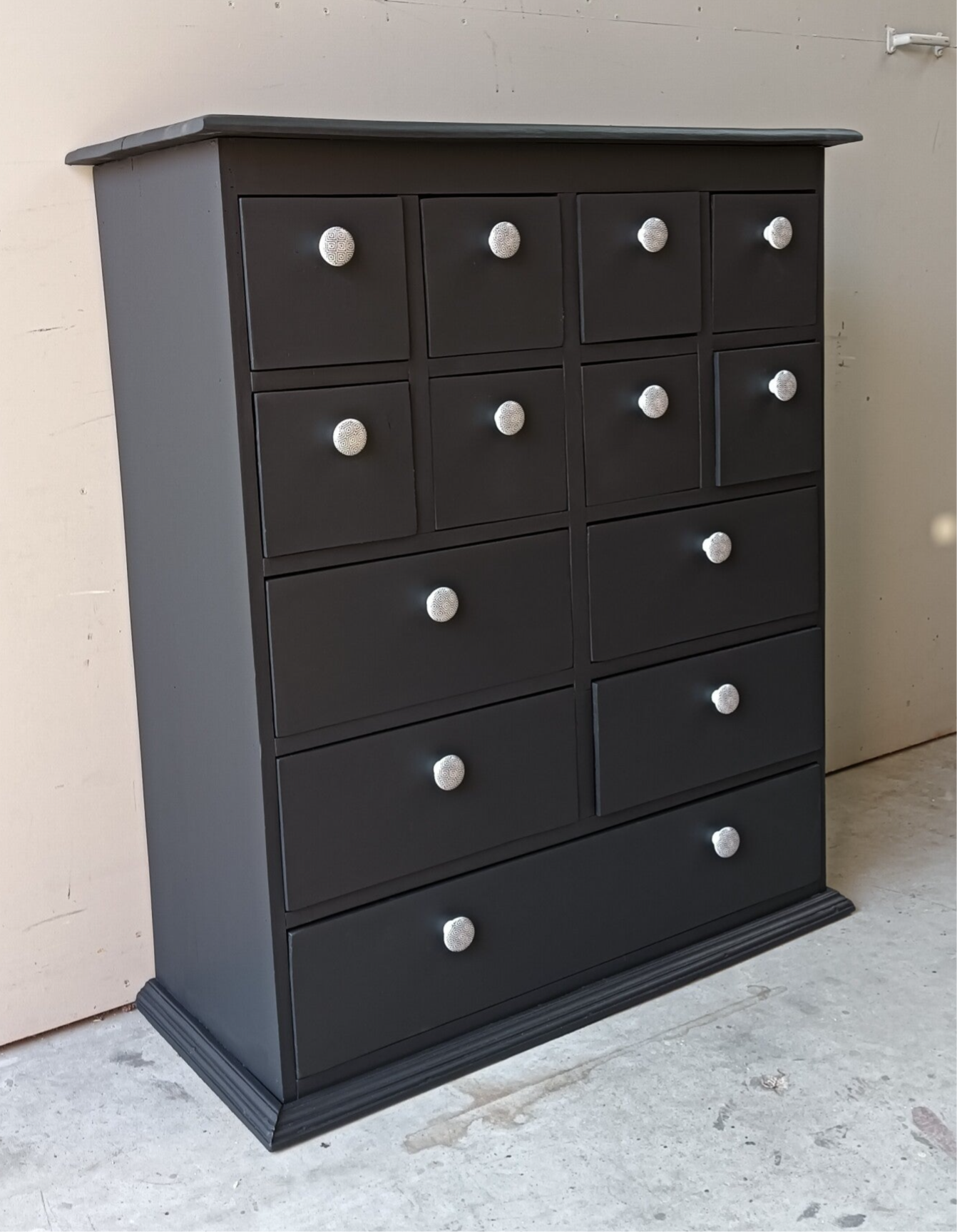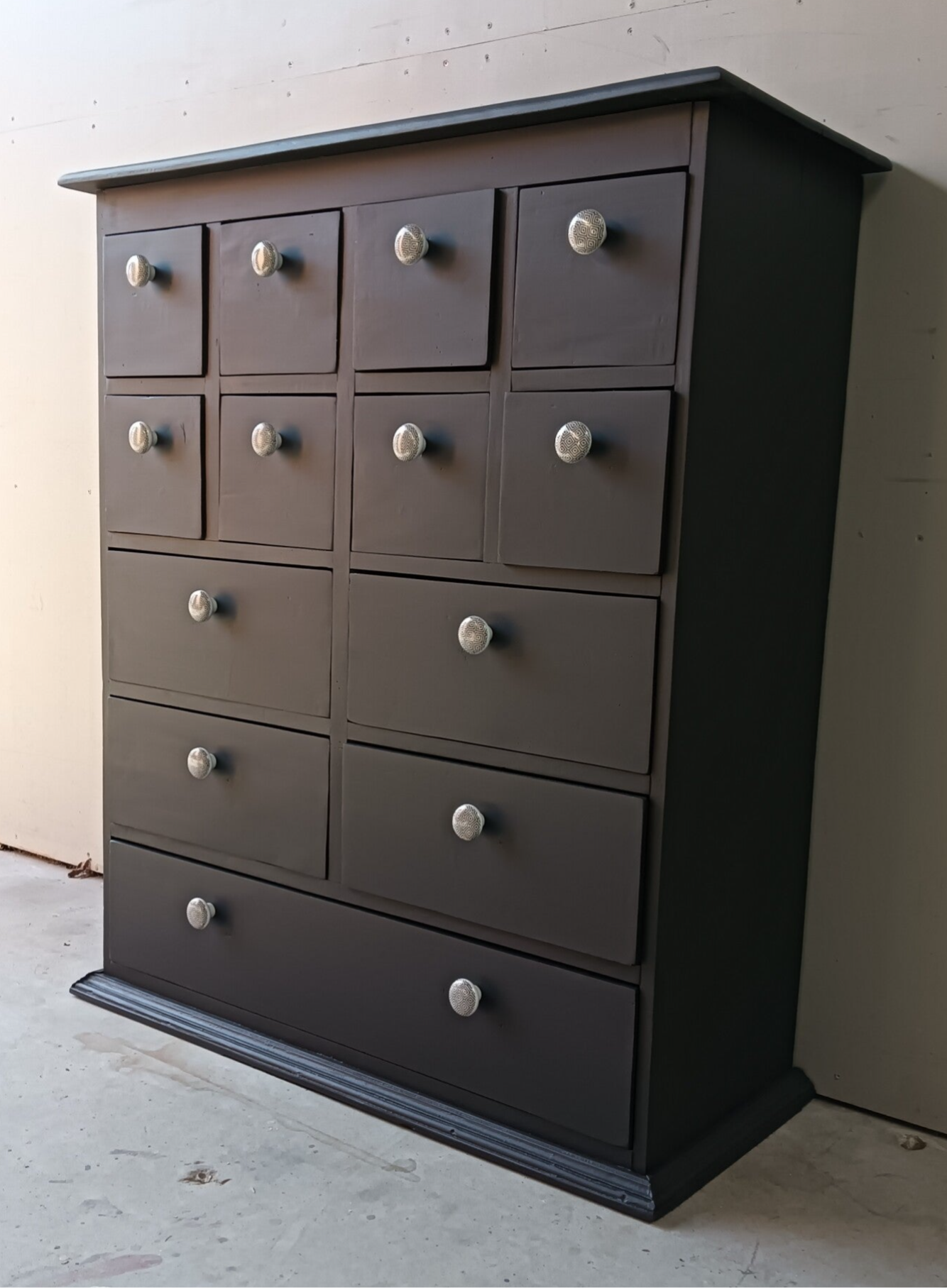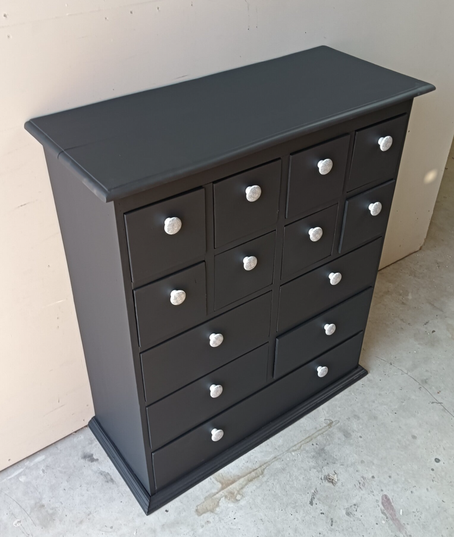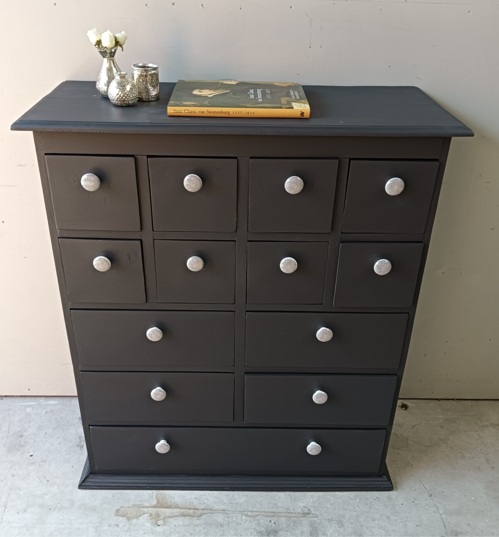 Een apothekerskast die al een behoorlijk leven achter zich heeft. Dus een opknapbeurt was nodig, met dit als eind resultaat. Een mooi, stevige massief houten kast en tegelijkertijd ook nog een leukerd. De kleur Ash van Fusion Mineral Paint is hier gebruikt. Deze kleur laat zich goed omschrijven als een diep en donker antraciet. Uiteraard mochten de bijpassende porseleinen knopjes niet ontbreken. Qua afmetingen ook redelijk bescheiden, maar toch door de vele laatjes een hoop opbergruimte. Uiteraard kan het niet anders dan dat de tijd zijn sporen heeft achter gelaten, maar dit is zeker niet storend. Functioneel is deze leukerd zeker nog!