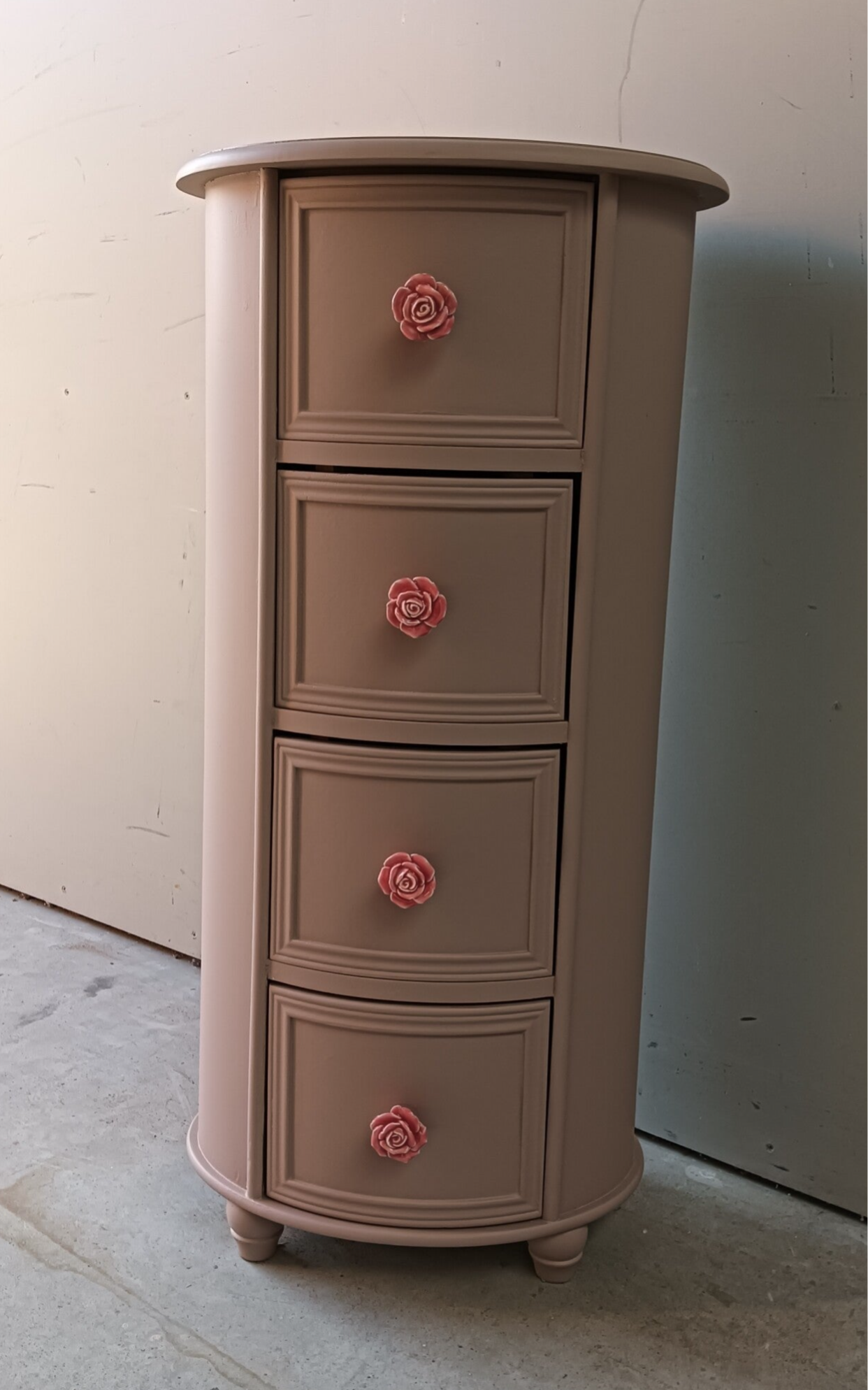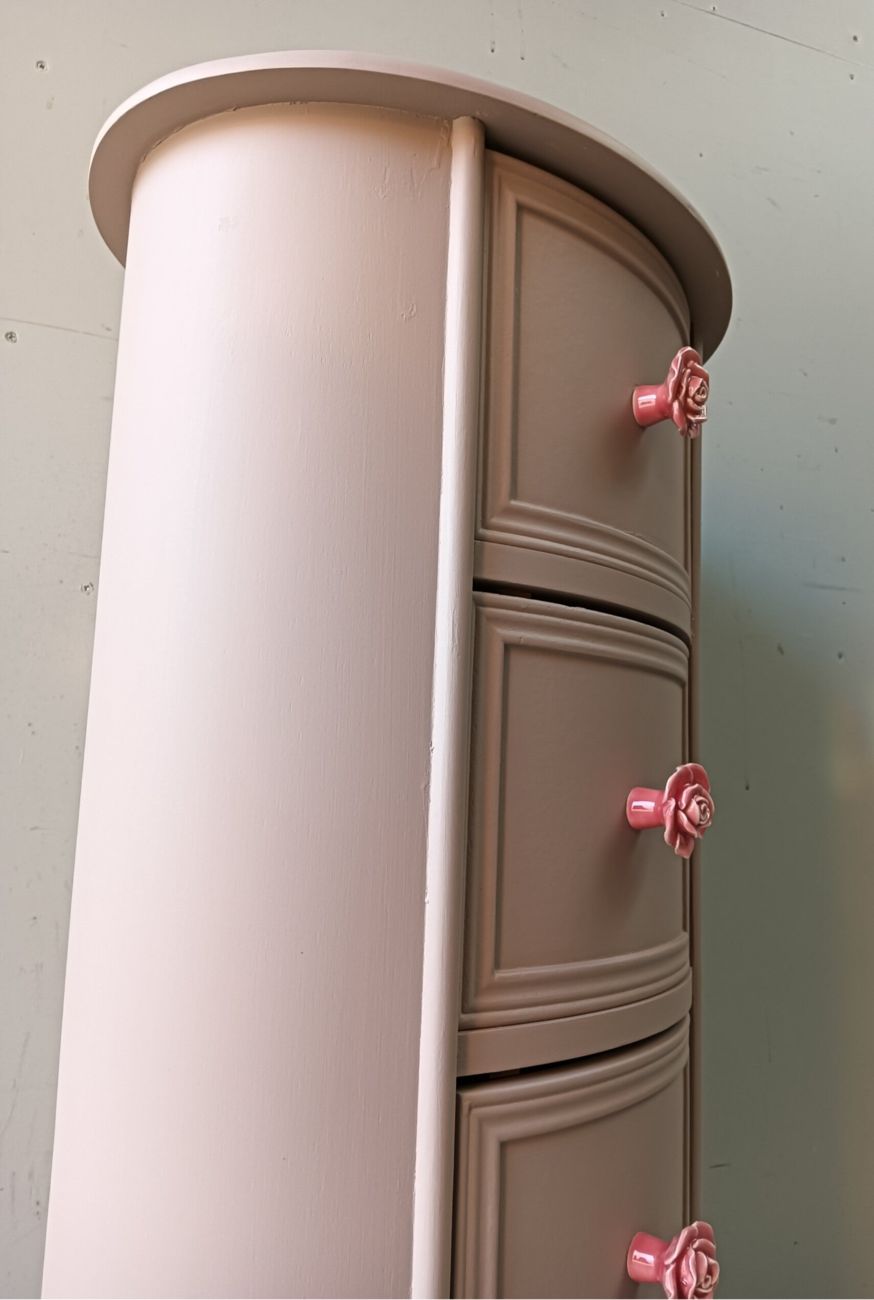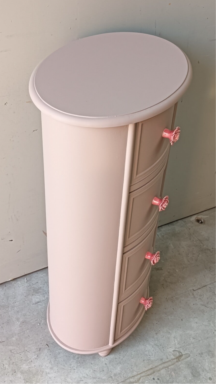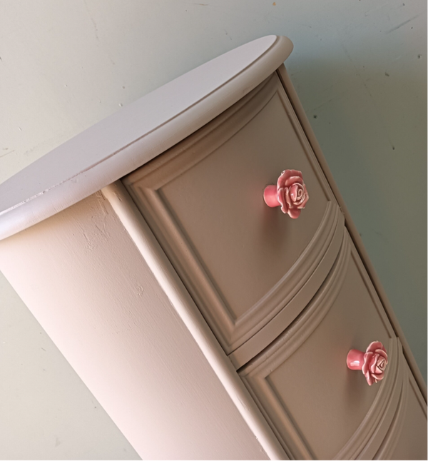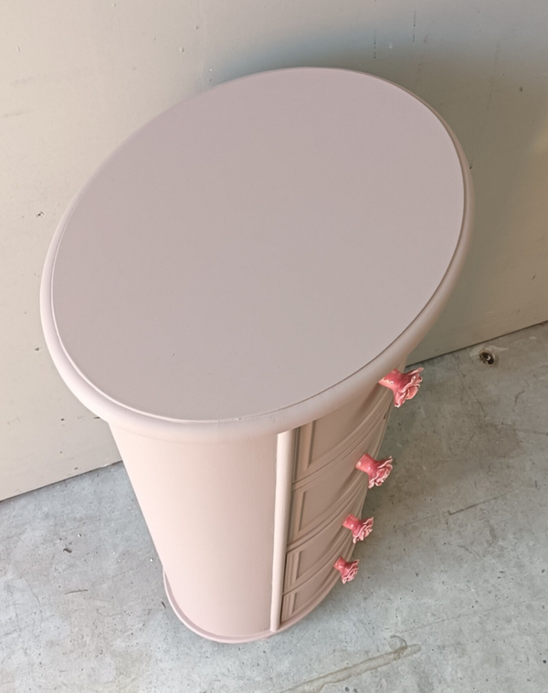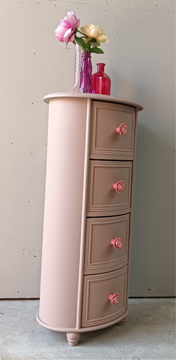 Ovaal, hoe leuk! Net even anders als anders en zeker in de mooie kleur Acadia Pear van Fusion Mineral Paint. Het laat zich goed omschrijven als een oud roze / nude achtige tint. Mooi, fris maar toch een warme uitstraling. Daarbij hebben we bijpassende knoppen op de lades gezet wat het geheel helemaal af maakt.
